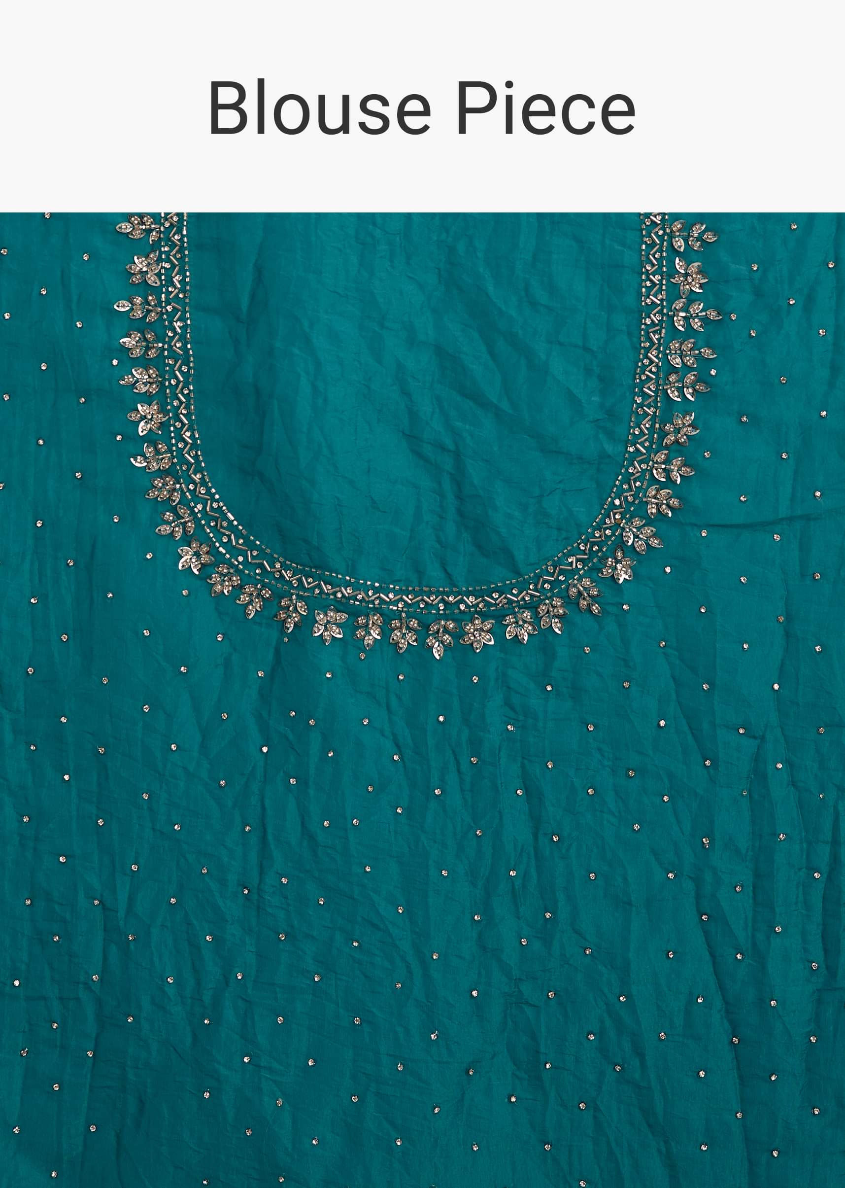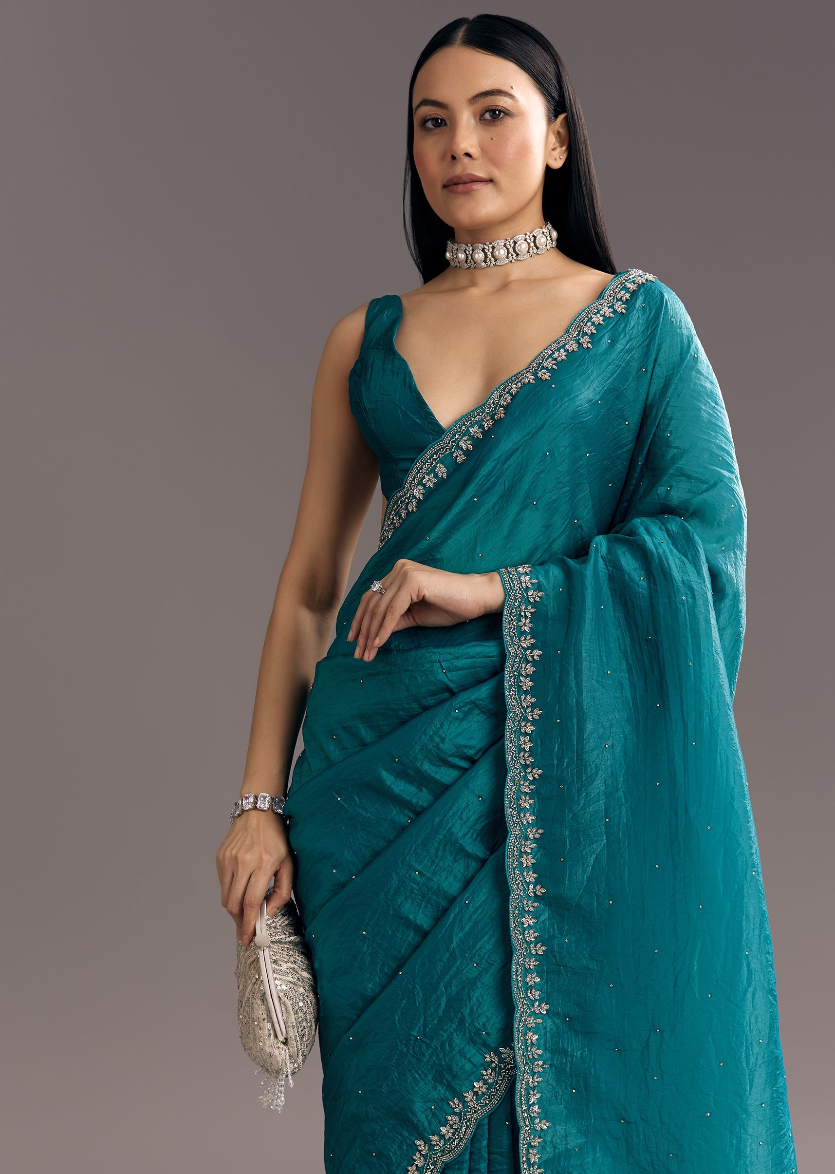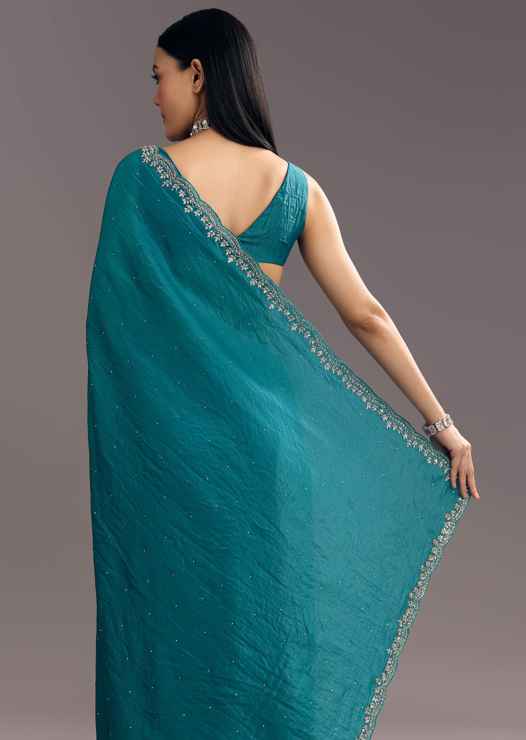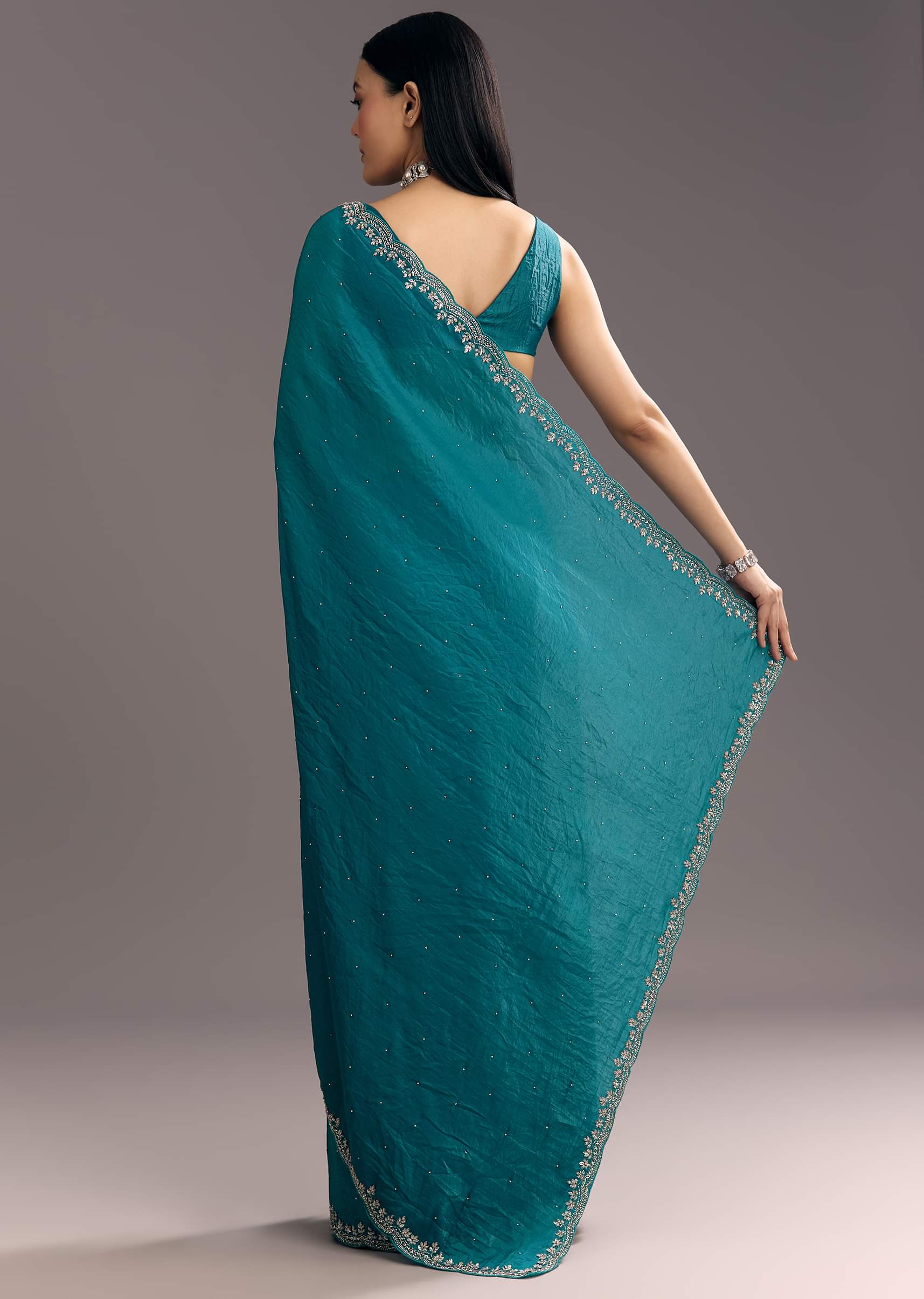 A teal blue crushed tissue saree featuring stone embellishments with embroidered scallop border, perfect for mehendi or sangeet. It feels like wearing a quiet poem stitched in shimmer and tradition.... More Product Details