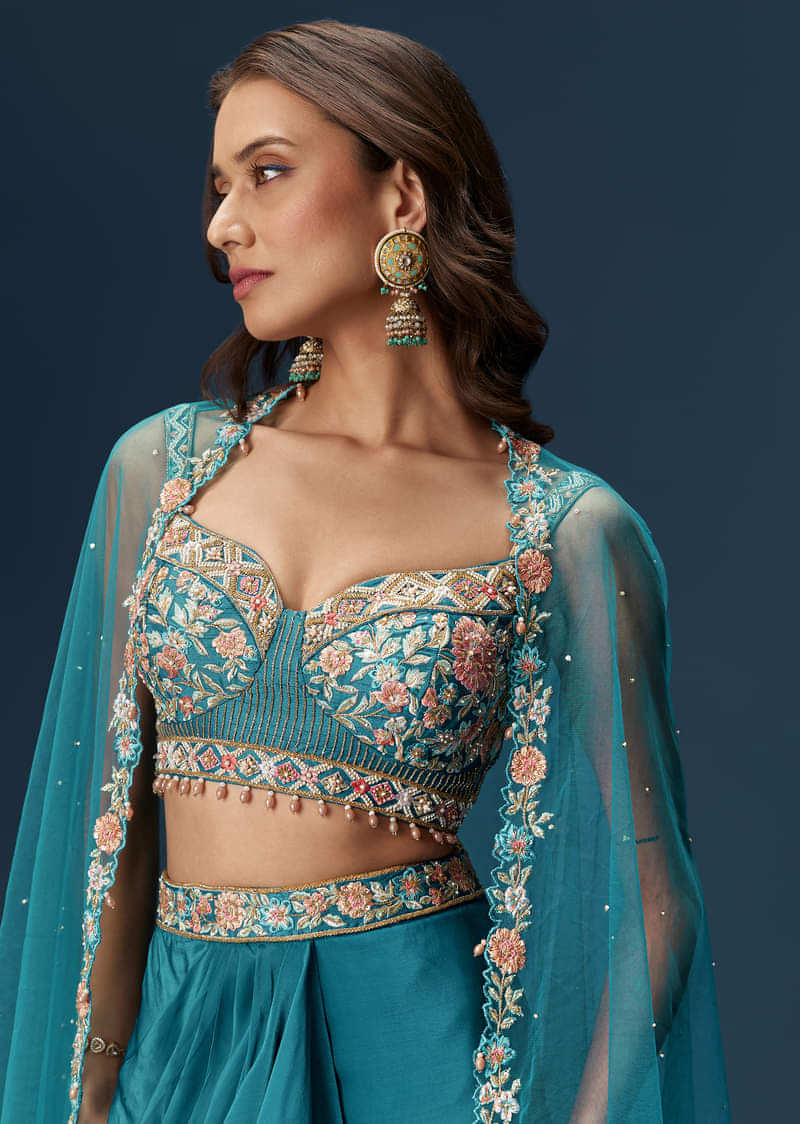 Teal Blue Dhoti Skirt Set With Embroidered Blouse And Net Dupatta