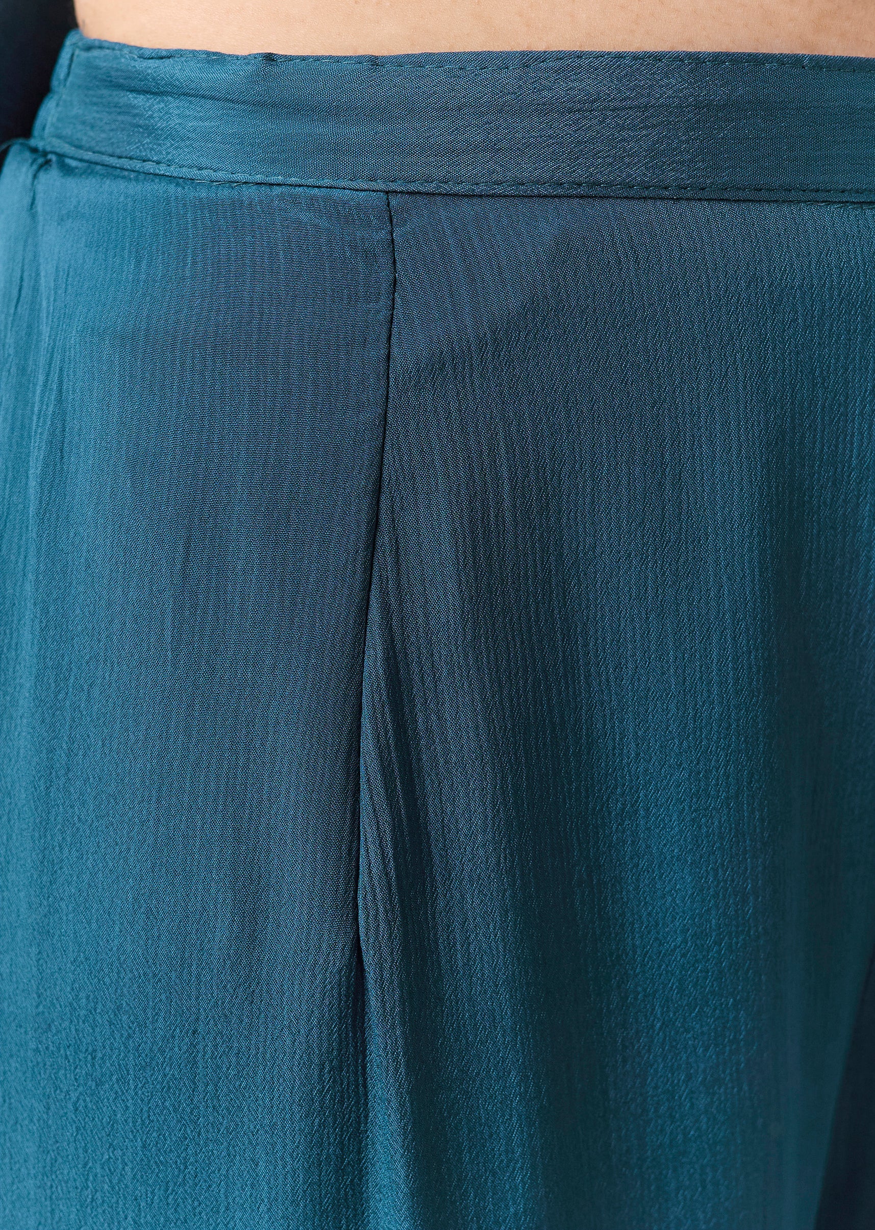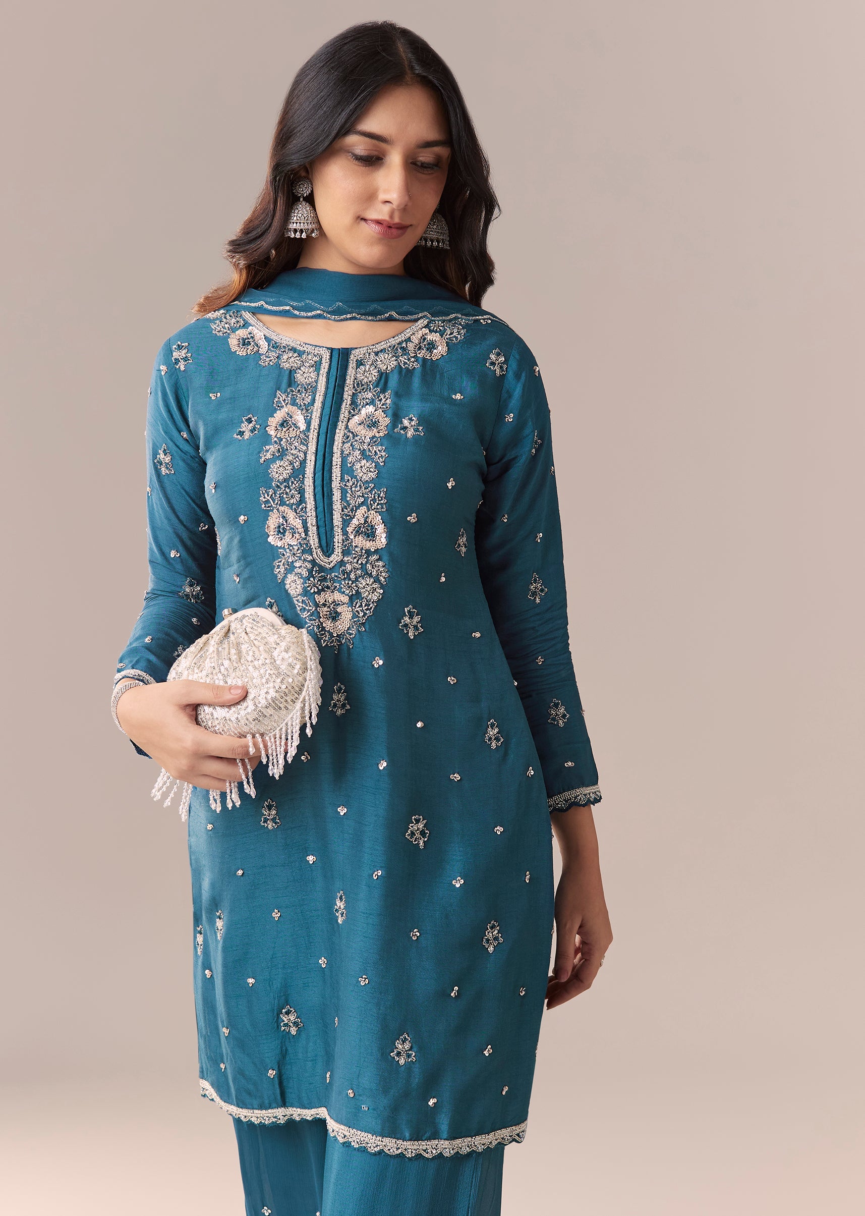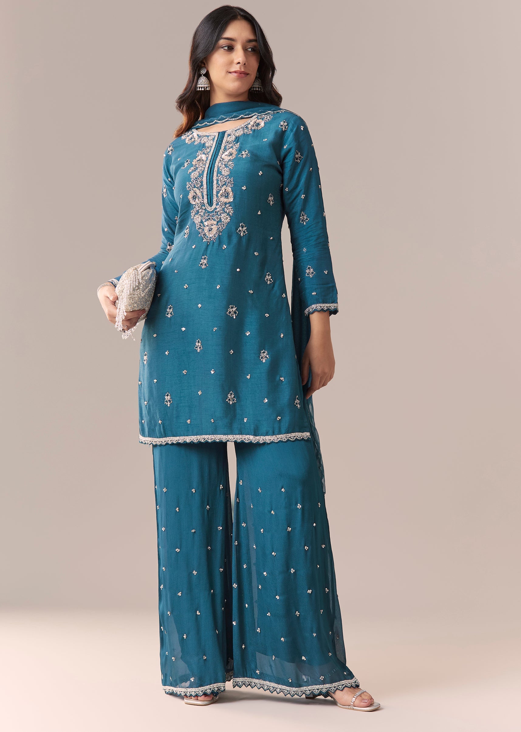 Teal Blue Embellished Palazzo Suit Set With Dupatta