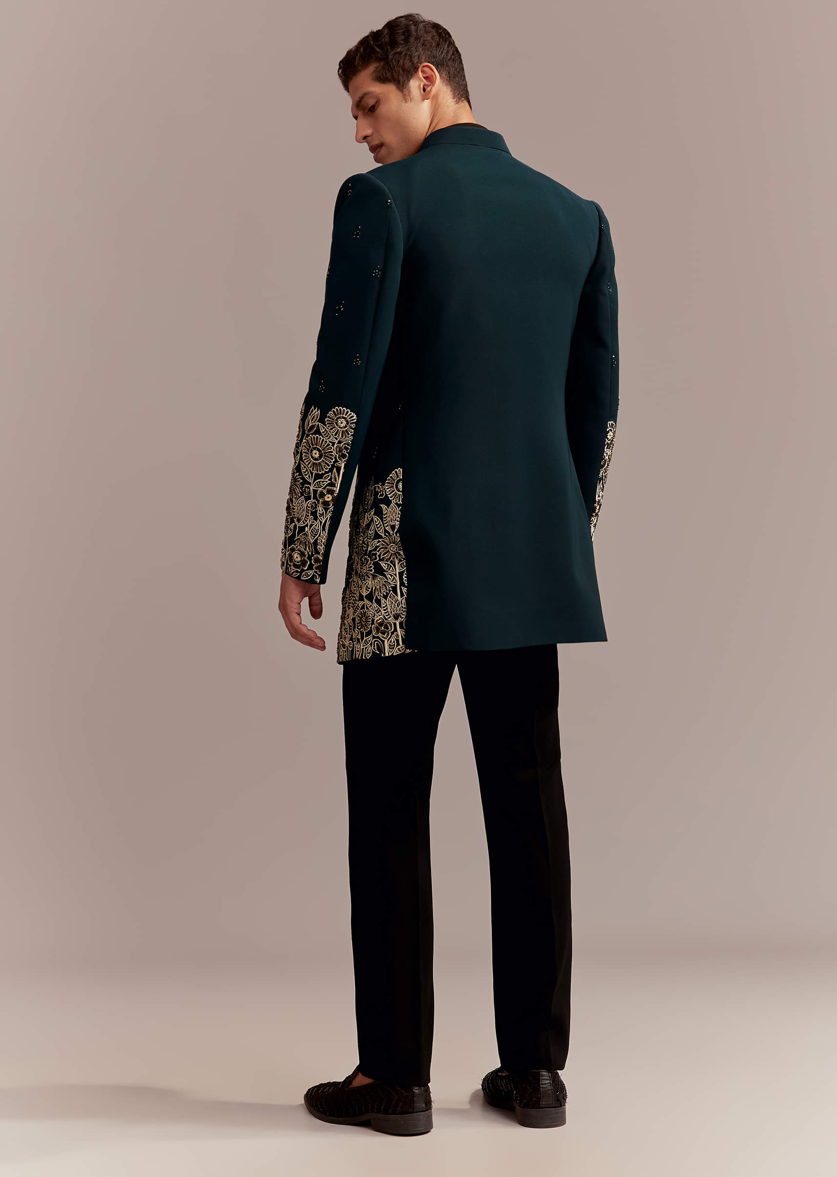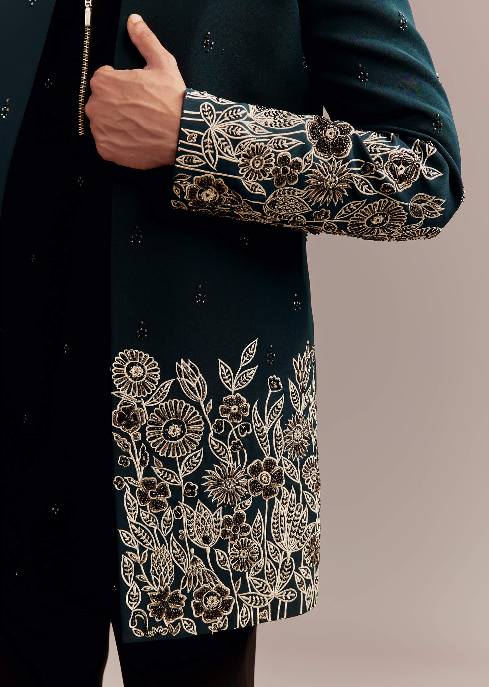 Teal Blue Indo Western Set For Men With Ivory Floral Embroidery