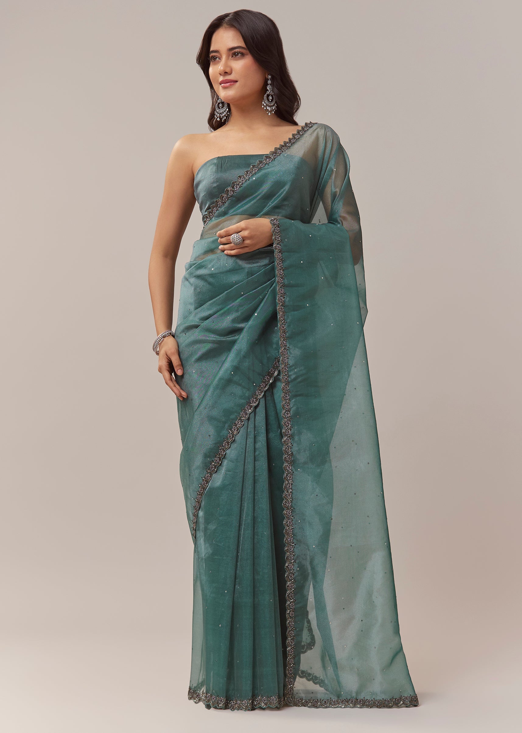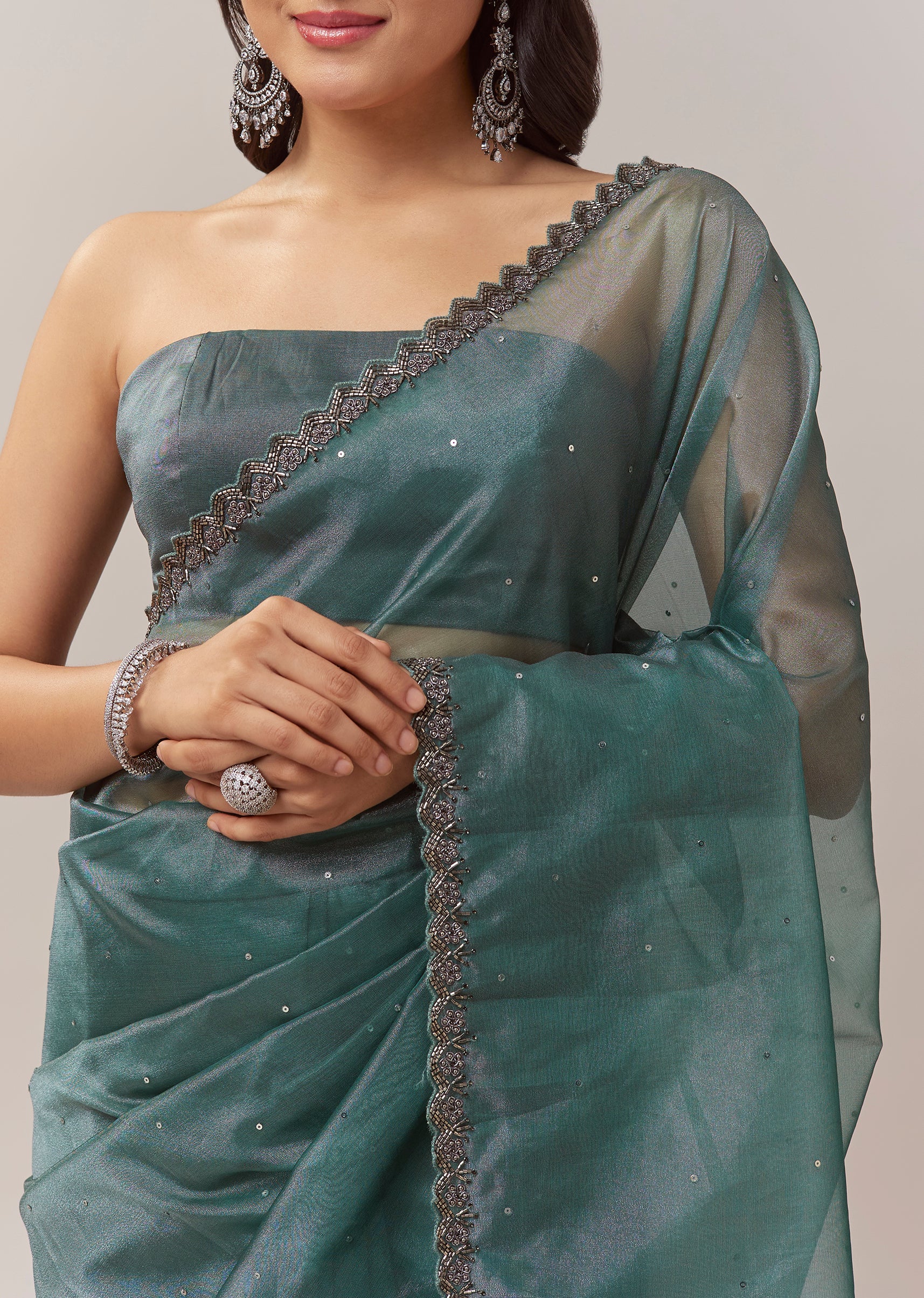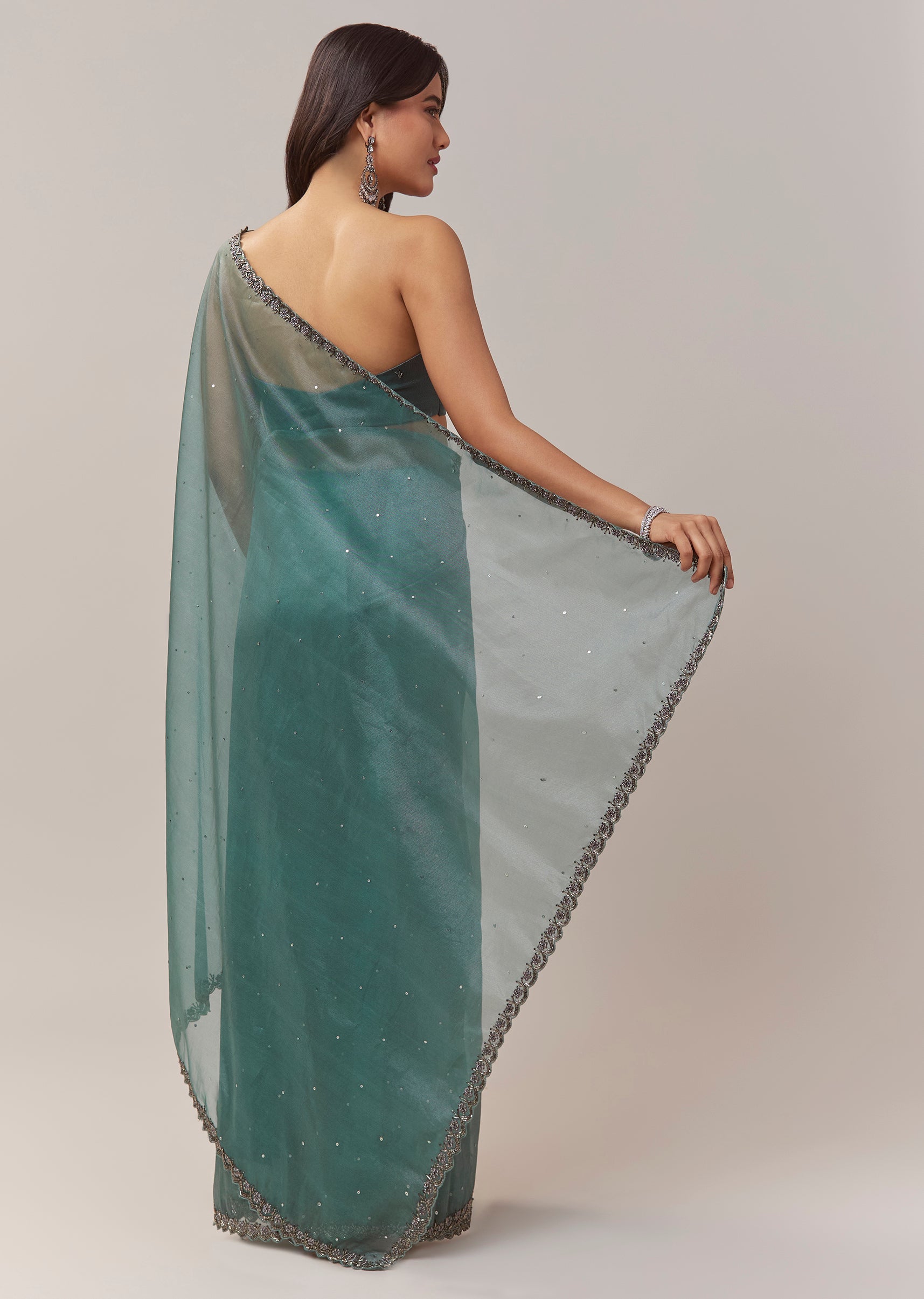 Pair it with emerald toned studs and metallic heels to enhance the rich teal shade and the shimmer of the cutwork border.