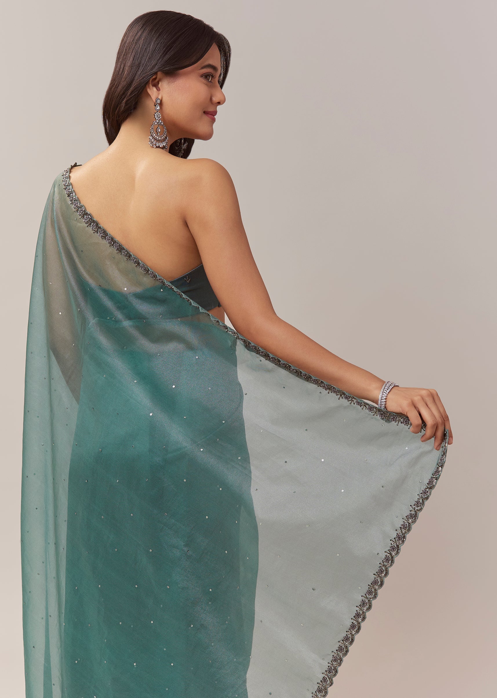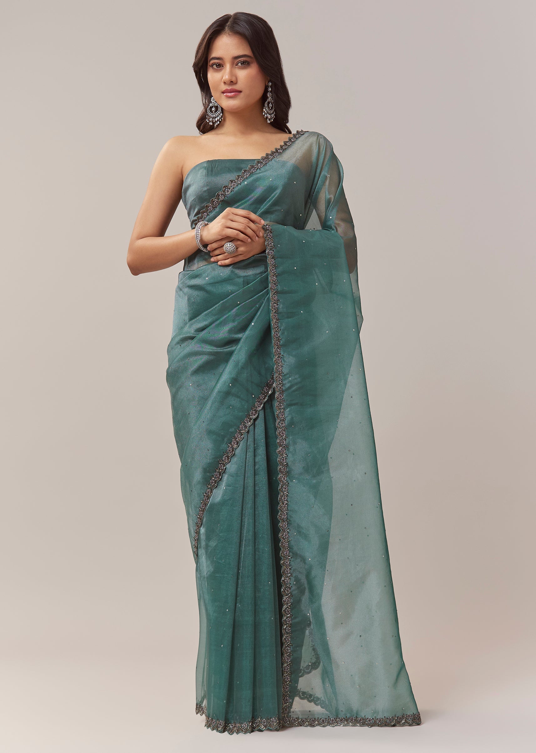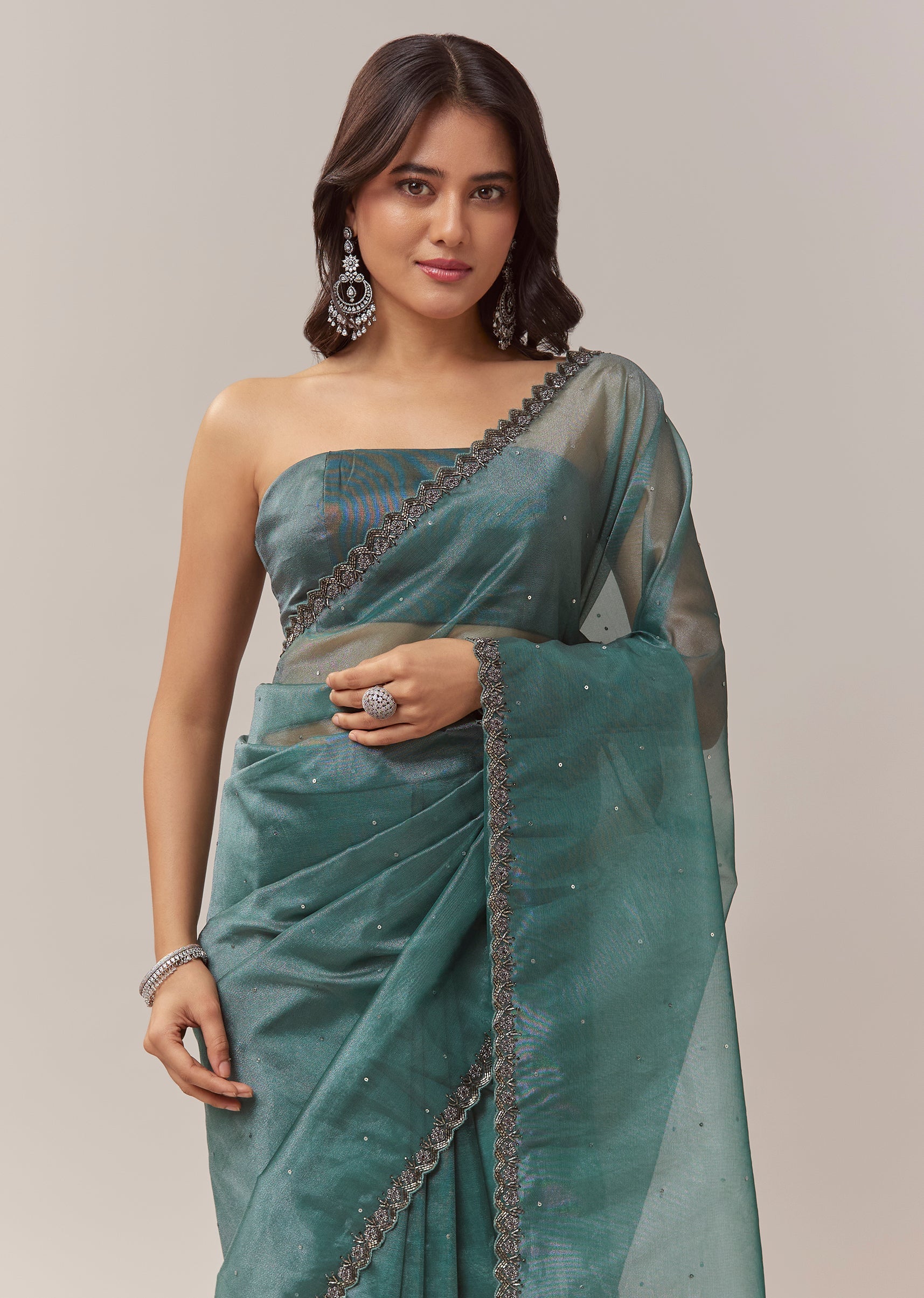 Pair it with emerald toned studs and metallic heels to enhance the rich teal shade and the shimmer of the cutwork border.