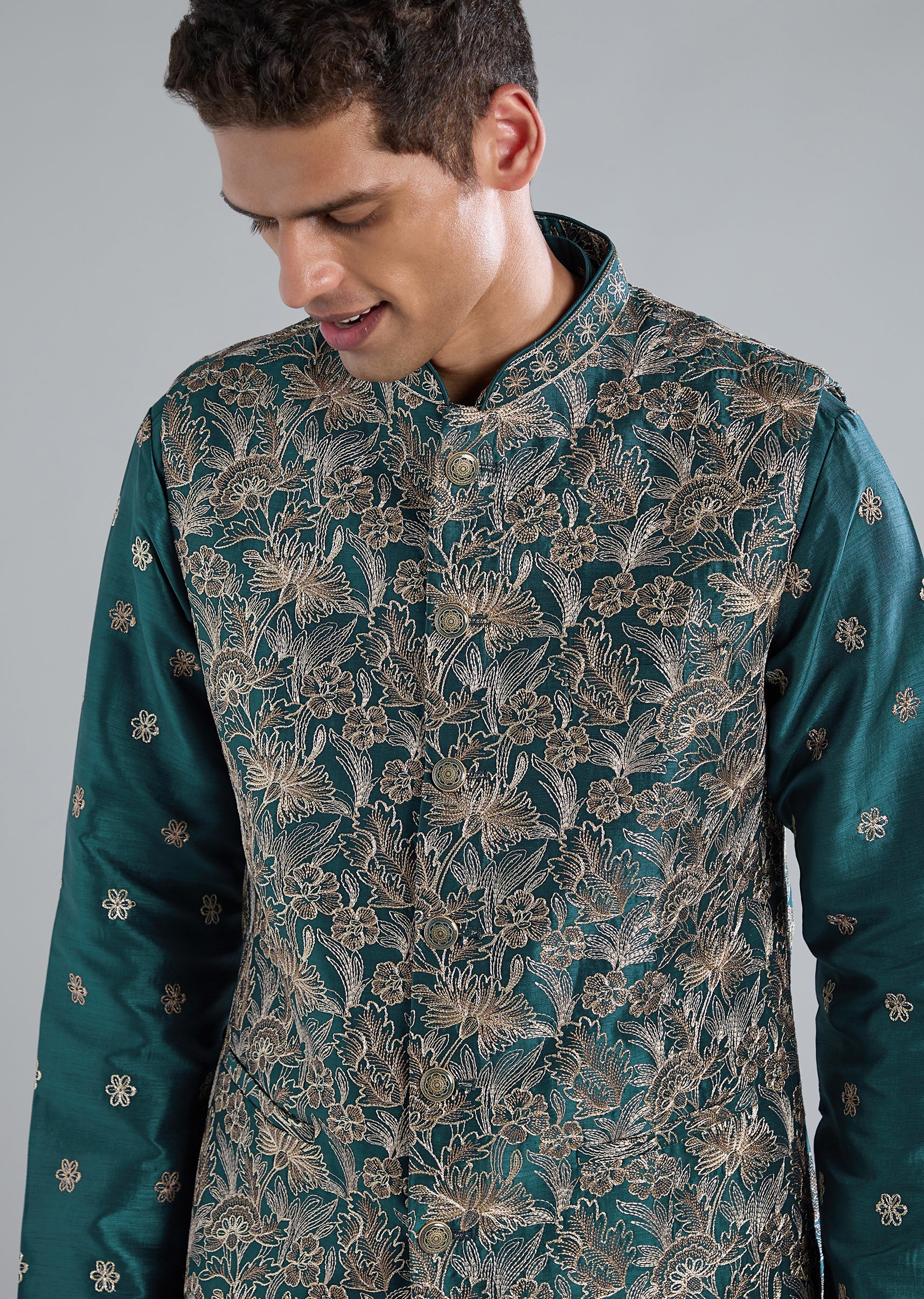 Teal Blue Printed Kurta Jacket Set With Resham Detailing