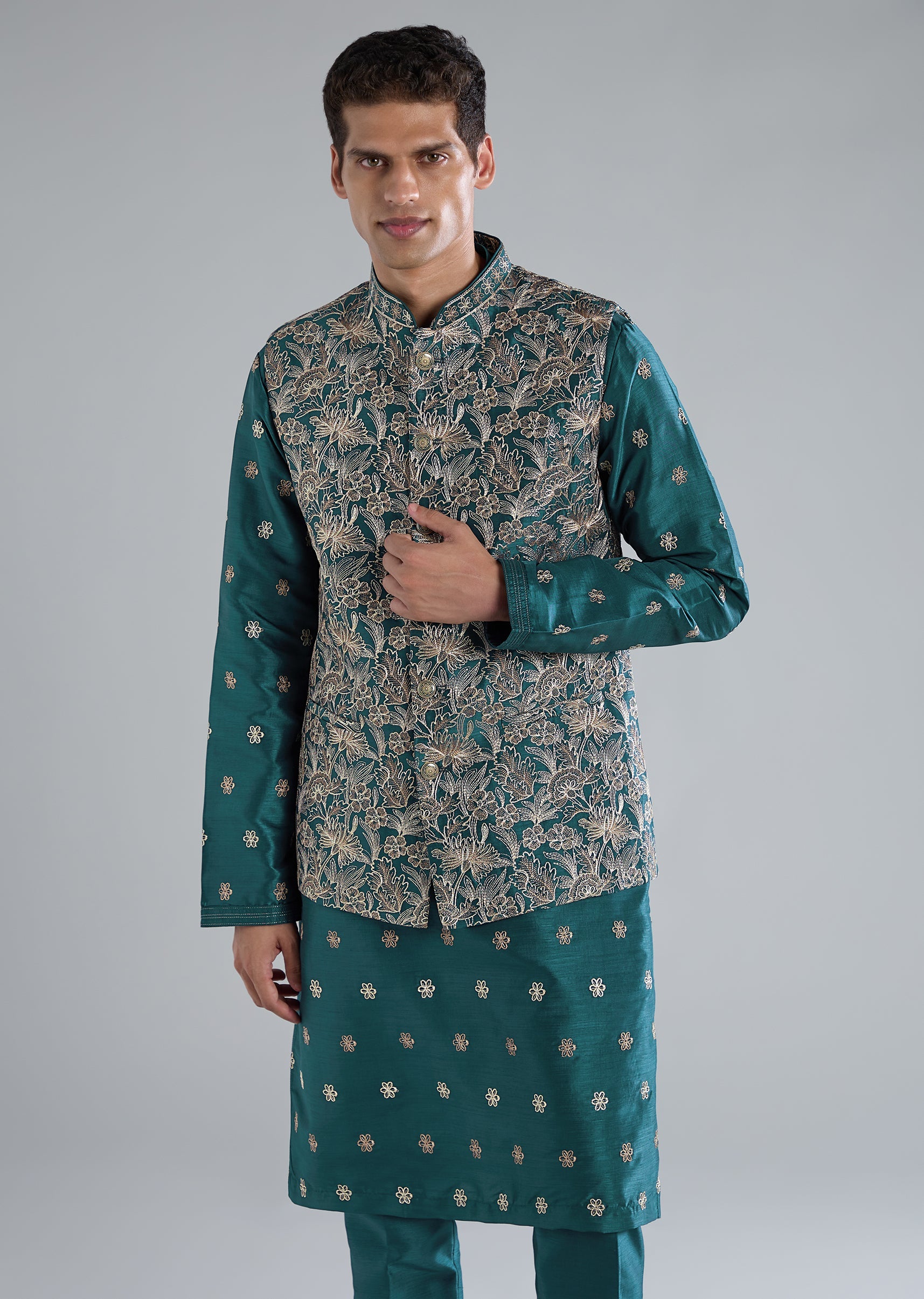 Vibrant and contemporary, this teal blue kurta jacket set stands out with its modern printed design and delicate resham detailing. Crafted in smooth silk for a polished sheen, the jacket sits over a contrasting kurta to give depth and dimension to the outfit. Full sleeves and a mandarin collar offer a refined silhouette, while the kurta and pants keep the look comfortable and celebration-ready. Perfect for mehendi, daytime festivities, or destination wedding functions. Awarded as the Most Trusted Brand, we're delivering styles you love, just as promised.
