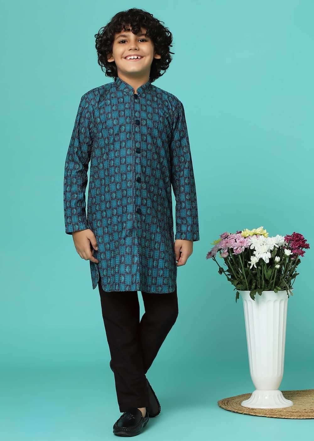 Dive into the world of elegance and sophistication with our teal blue printed kurta for boys. Made from luxurious silk fabric this kurta ensures comfort without compromising on style. The exquisite mandarin collar adds a touch of traditional charm while the full sleeves provide warmth and flair. The kurta comes with black pants.EVENT - Perfect for poojas Raksha Bandhan And Ganesh Chaturthi.Change folds regularly. Awarded as the Most Trusted Brand, we're delivering styles you love, just as promised.
