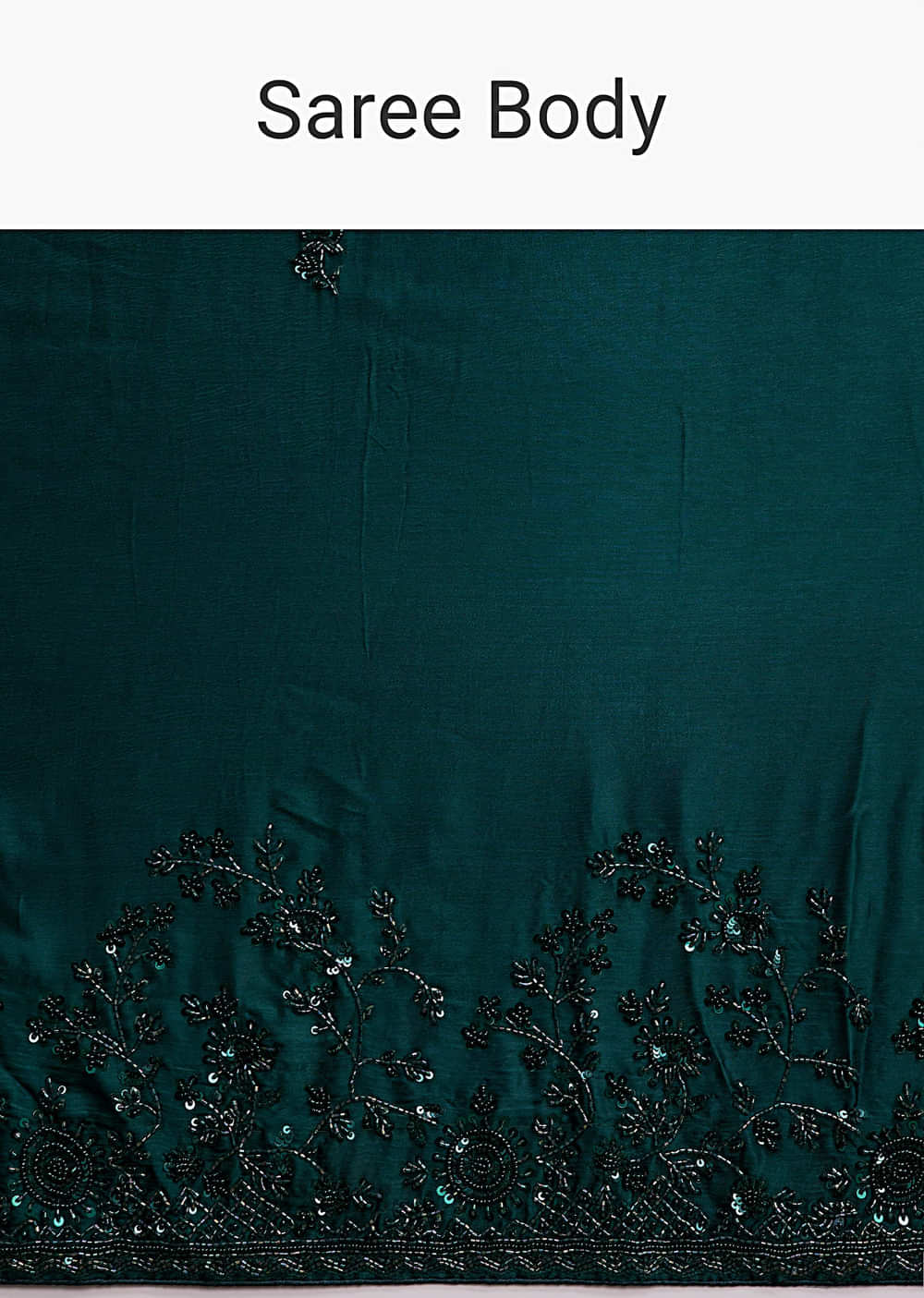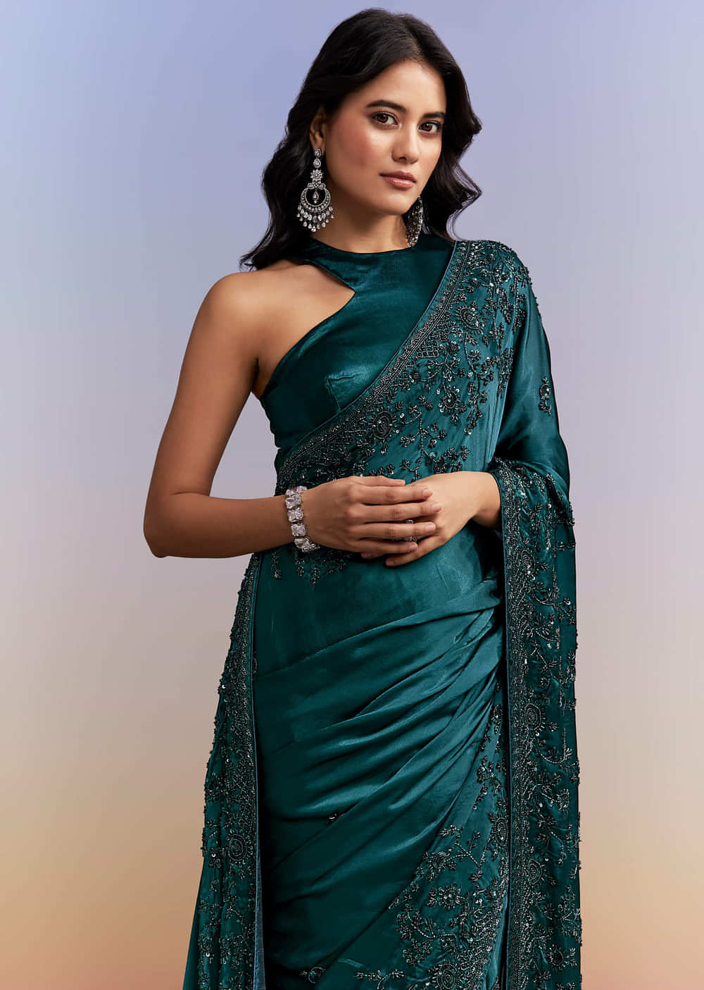 For nights built around dancing and easy pictures, this teal blue satin chinon saree stays sleek, light and ready to move. Tone-on-tone floral embroidery with sequins, cutdana and beads covers... More Product Details
