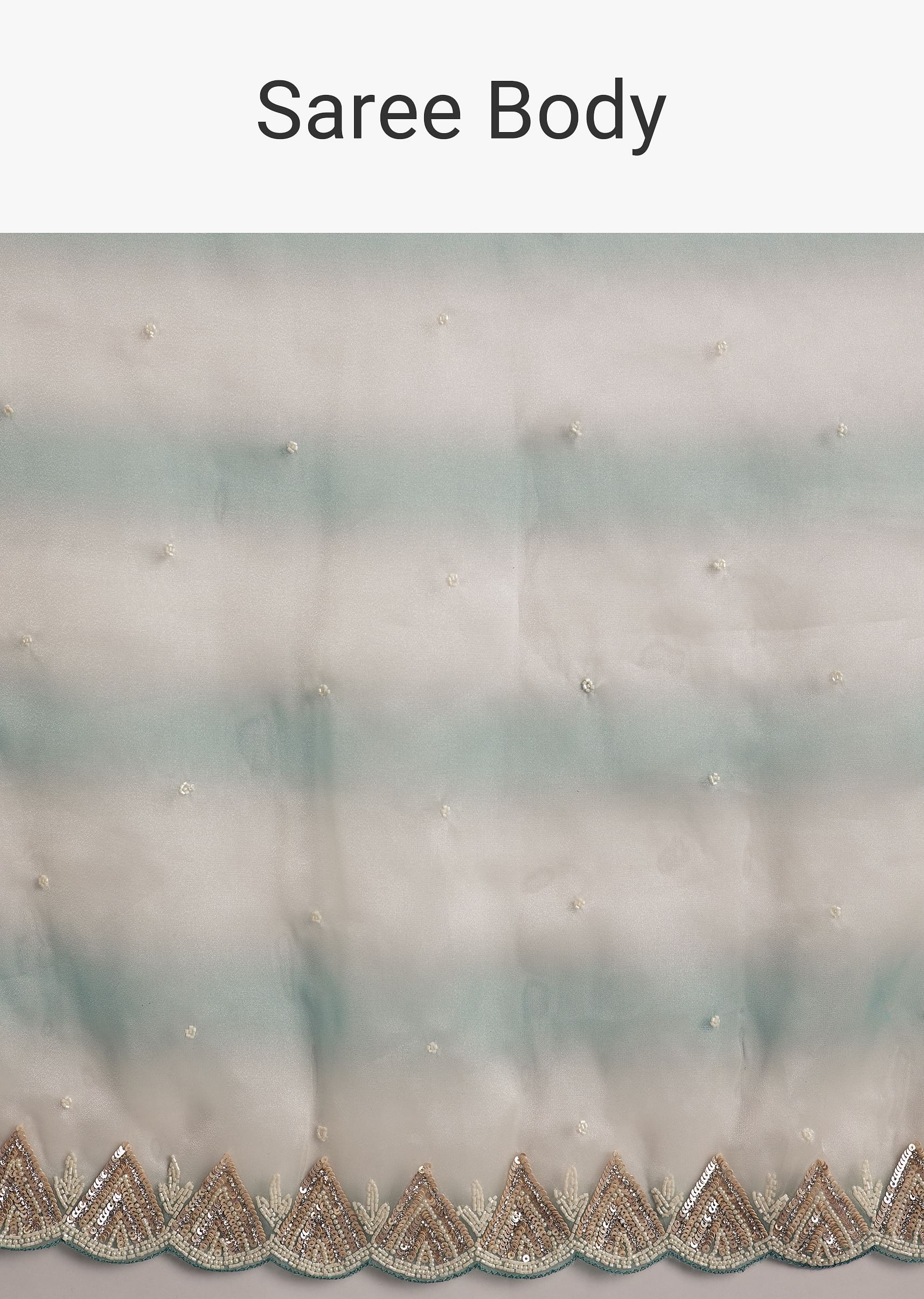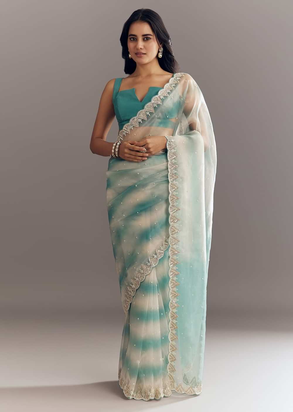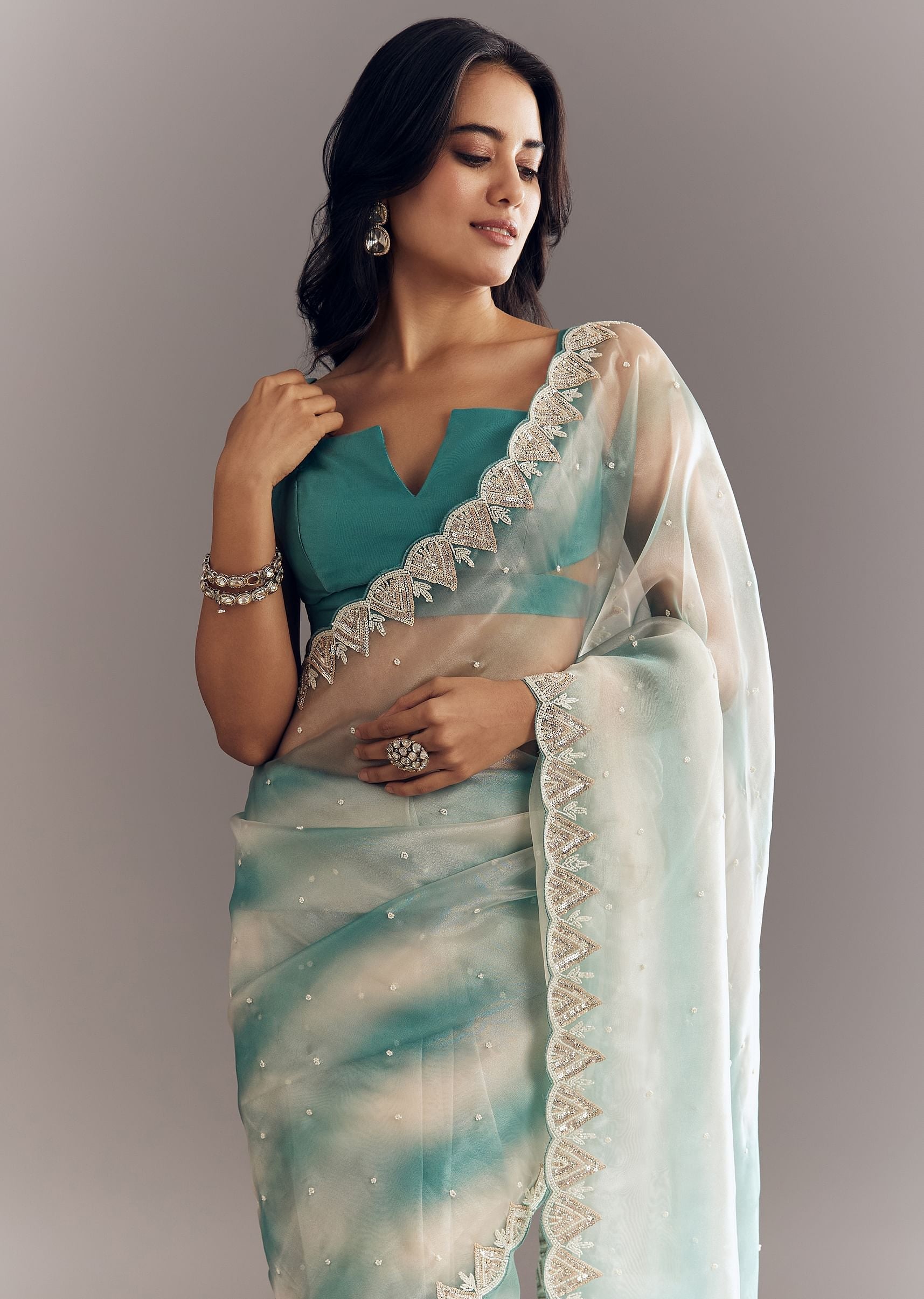 Teal Blue Shaded Organza Saree With Moti Stone Sequins Embroidery And Cutwork Scallop Border