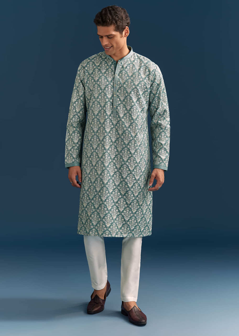 Teal Blue Silk Printed Kurta Set For Men With Thread Work
