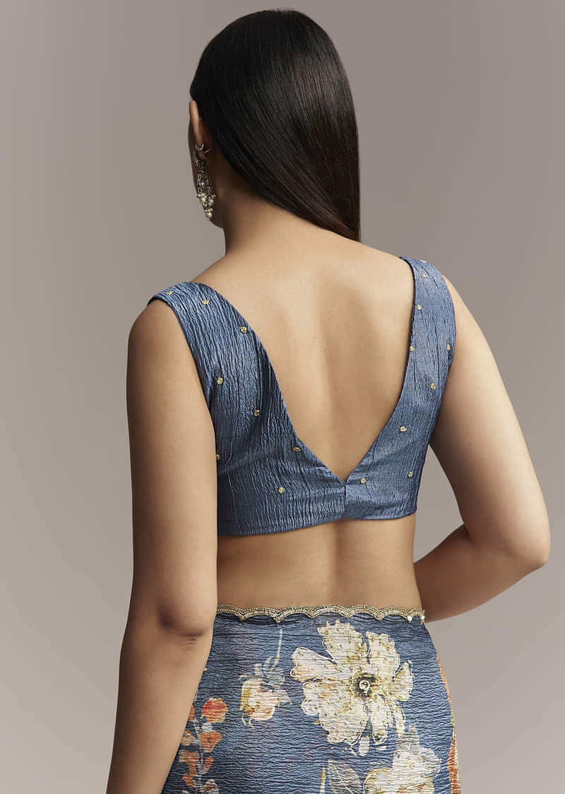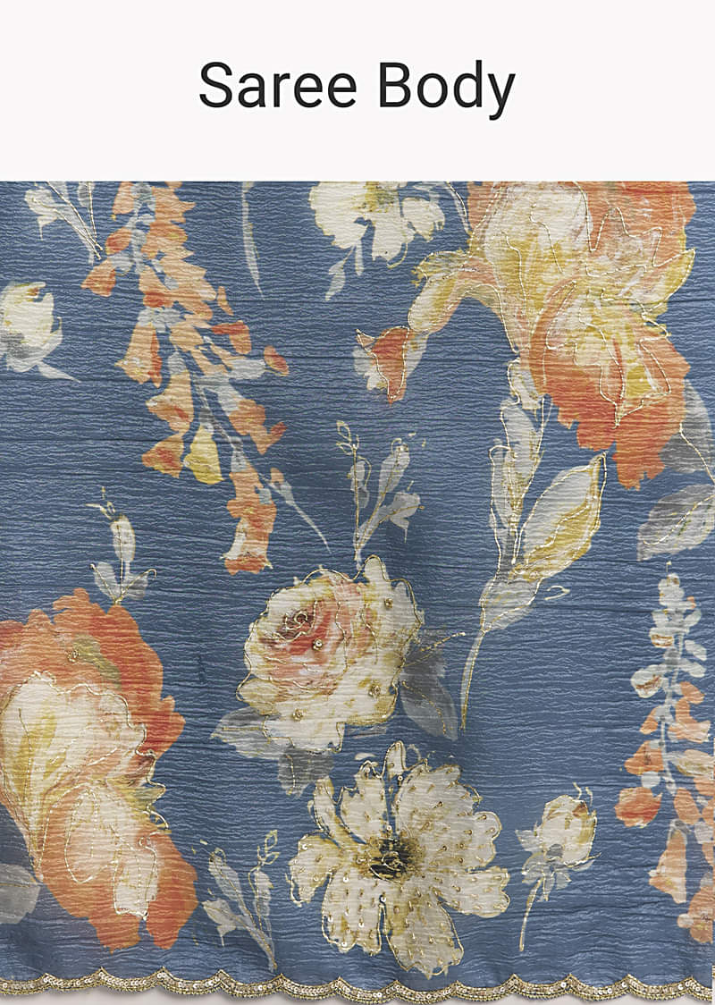 This crush tissue saree in teal blue is adorned with floral digital prints and golden highlights for that extra gleam. A scallop border embellished with cut dana and sequins adds a delicate shimmer. Awarded as the Most Trusted Brand, we're delivering styles you love, just as promised.