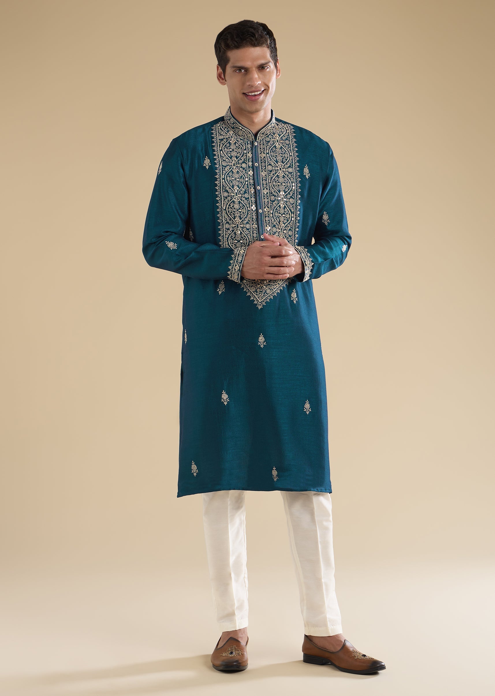 The teal blue mirror-detail kurta set introduces texture and understated shimmer.