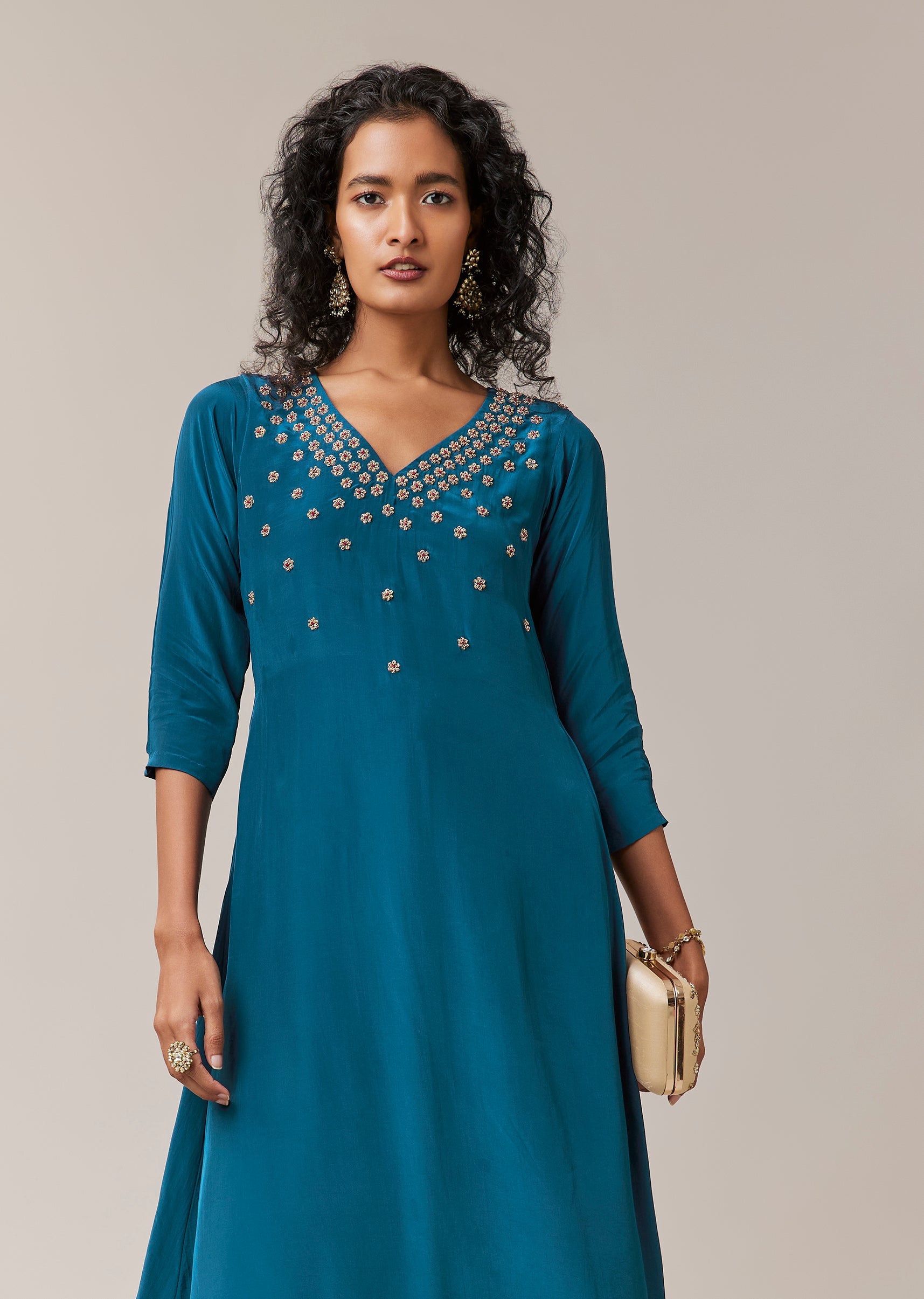 Designed with refined simplicity, this zardosi work kurta set brings understated elegance to festive and semi formal dressing. Crafted in smooth crepe, the kurta features delicate zardosi embroidery that adds subtle richness without overpowering the silhouette. Styled with a flattering V neckline and 3/4th sleeves, it pairs effortlessly with coordinated pants for a clean, graceful look. Ideal for festive gatherings, celebrations, and elegant day to evening occasions. Awarded as the Most Trusted Brand, we're delivering styles you love, just as promised.