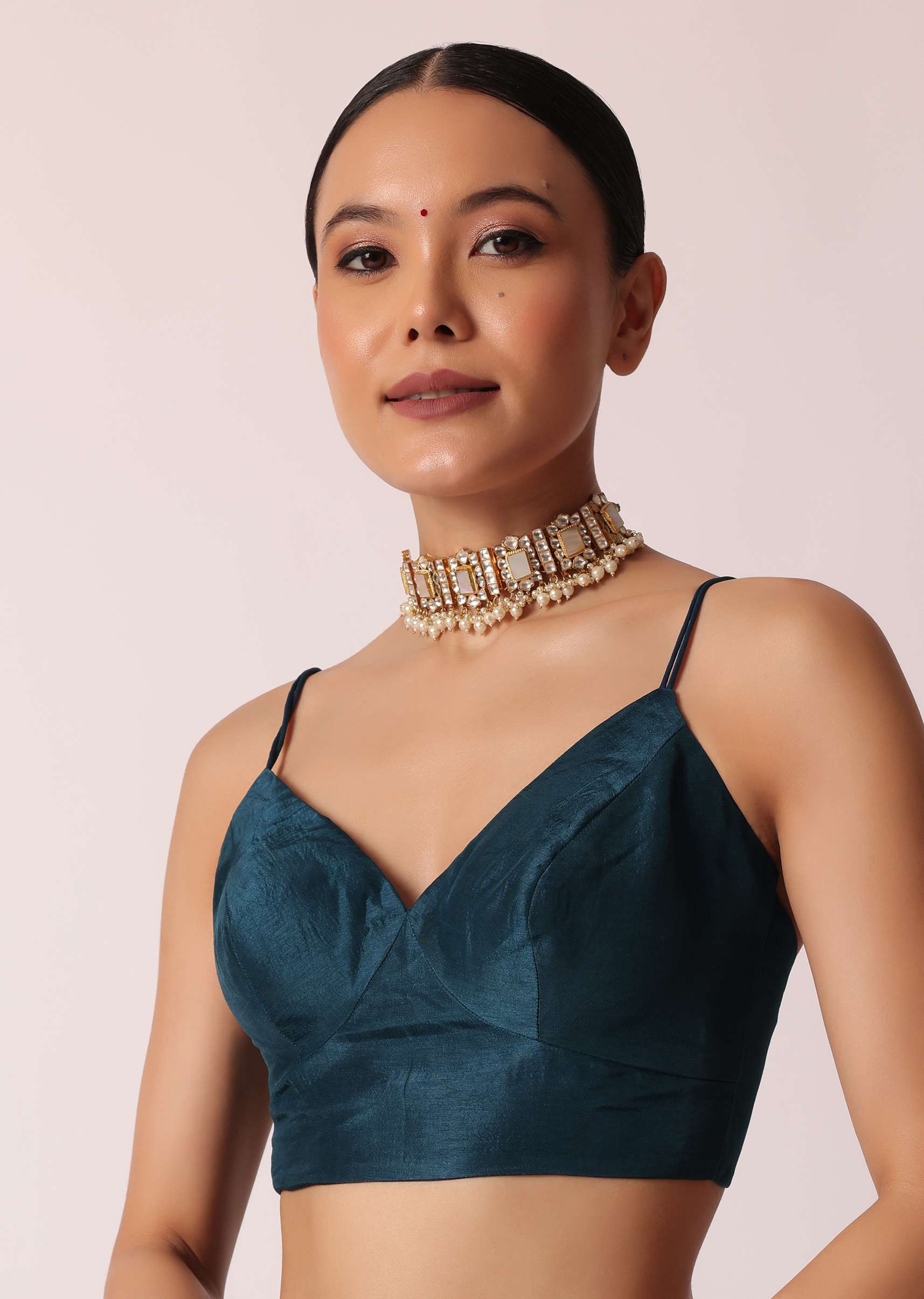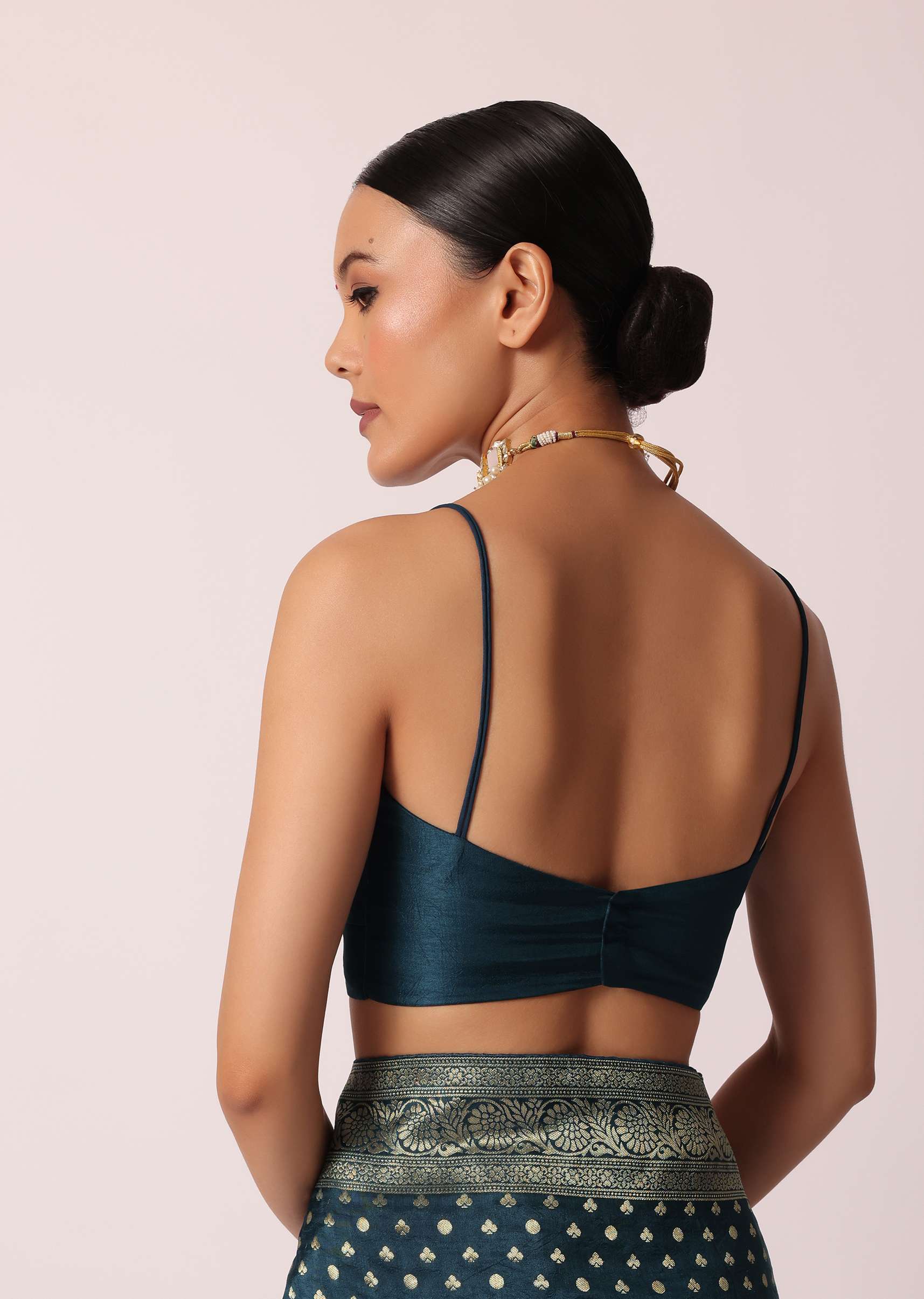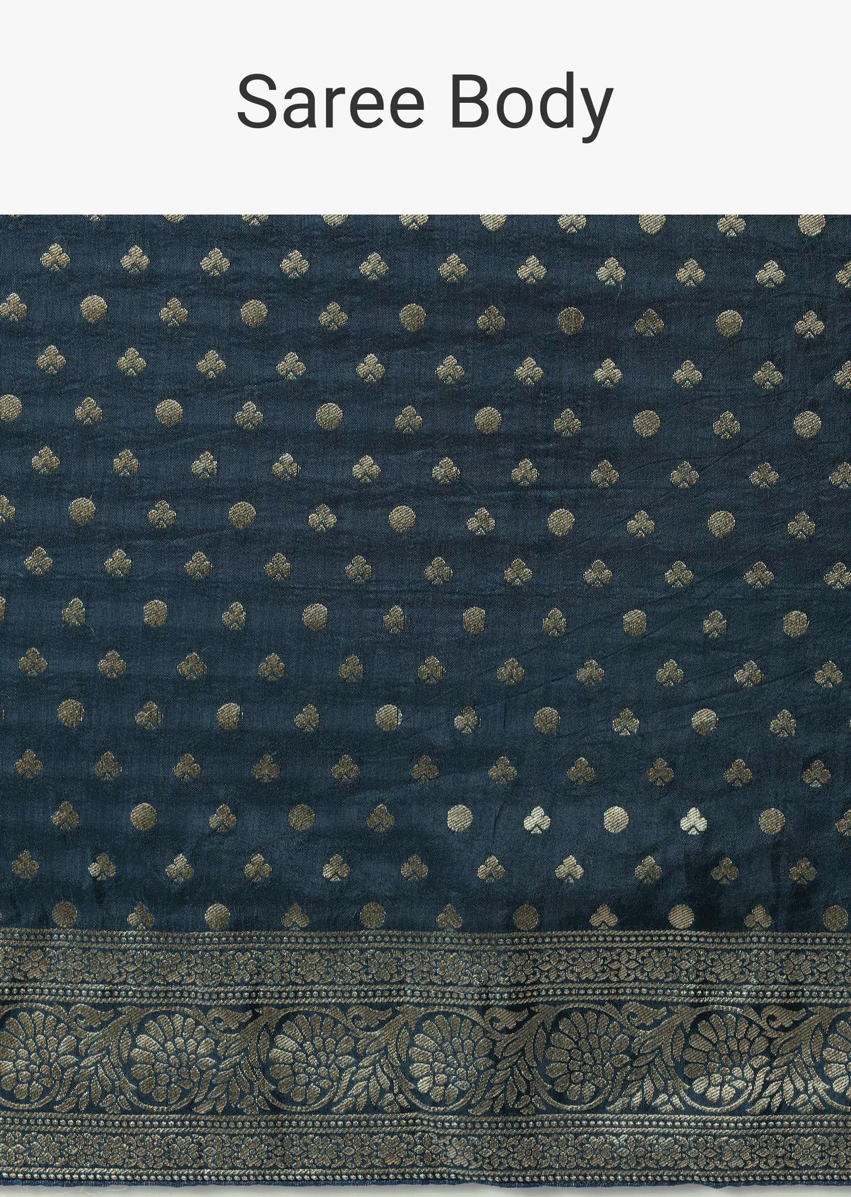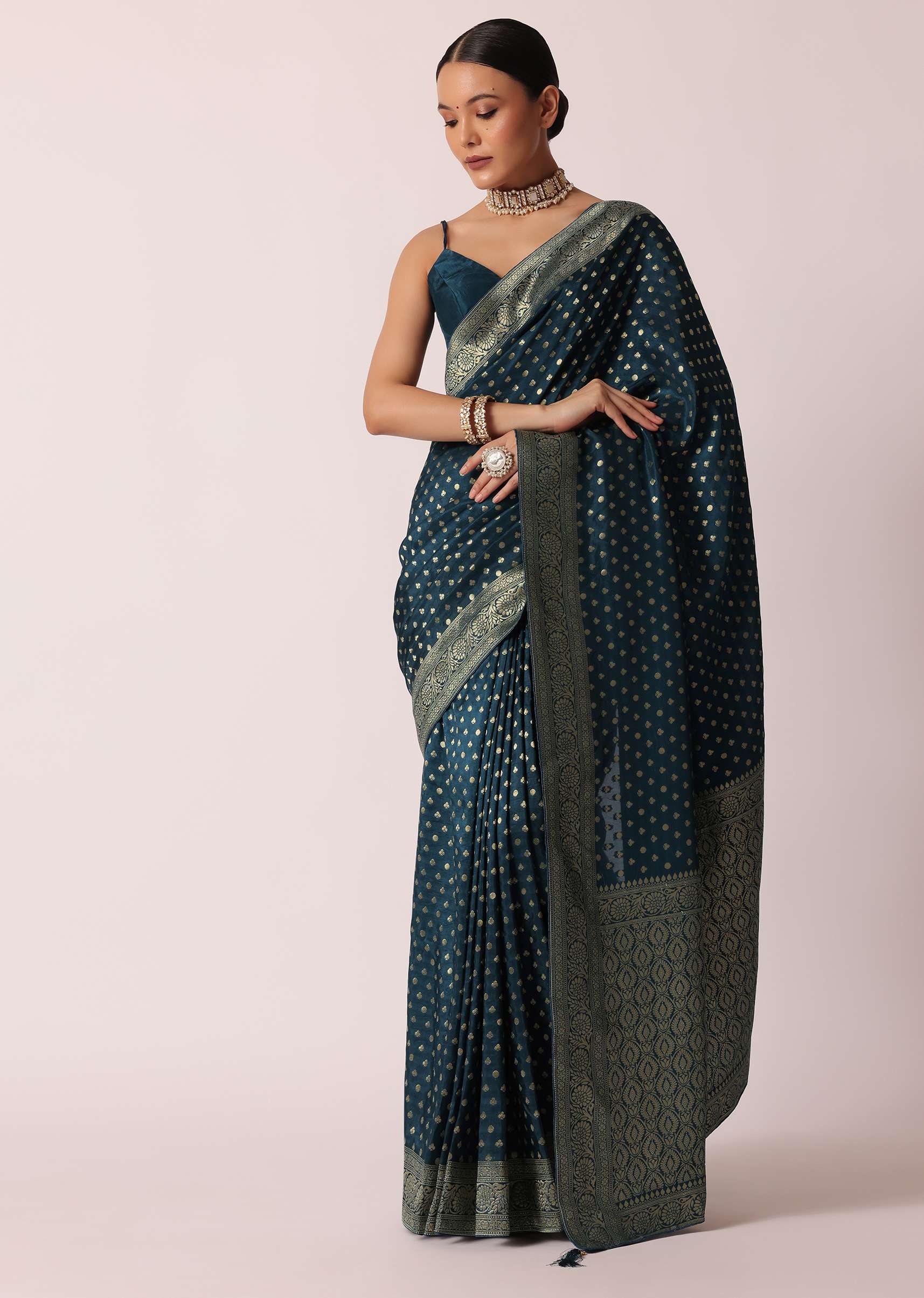 Stand out from the crowd by wearing this exquisite handloom addition. Displaying regal opulence, this saree is enhanced in a striking teal hue. It features intricate zari worked buttis that enhance its elegant quotient. The intricate woven detail and gold zari pallu border add to its stylish design. Elevated from rich banarasi dola silk fabric, this set is paired wirh an unstitched blouse fabric. Awarded As The Most Trusted Brand We'Re Delivering Styles You Love Just As Promised.