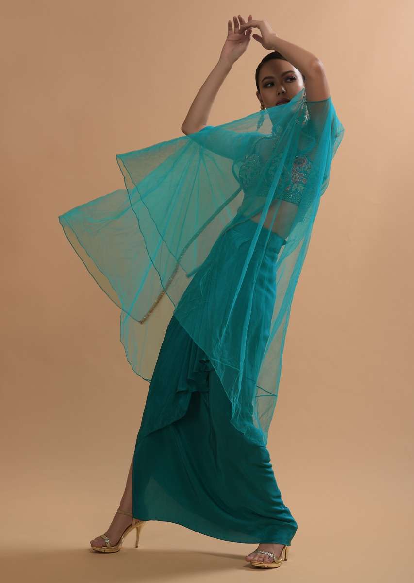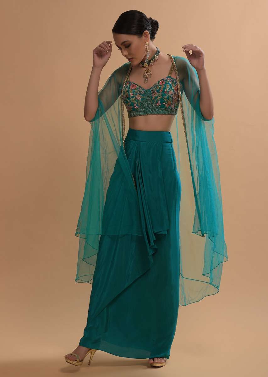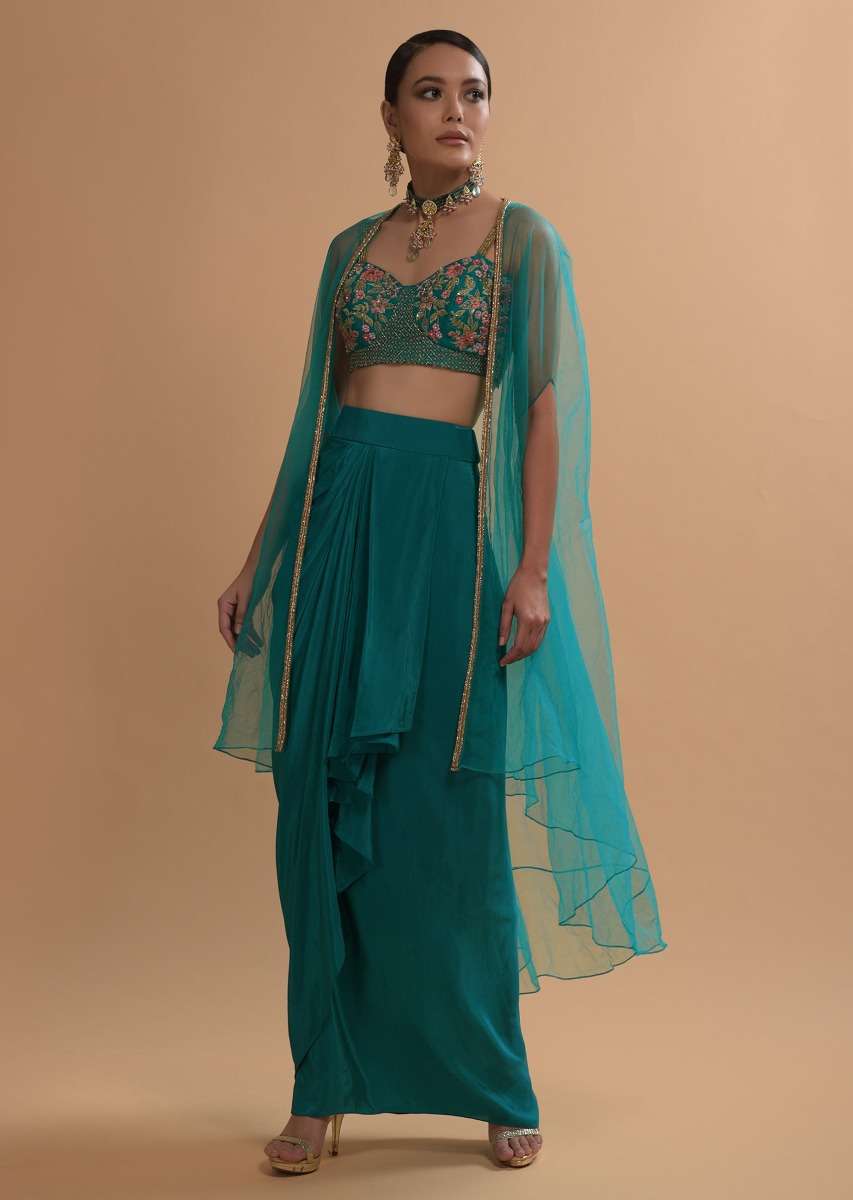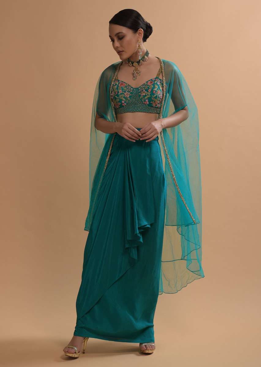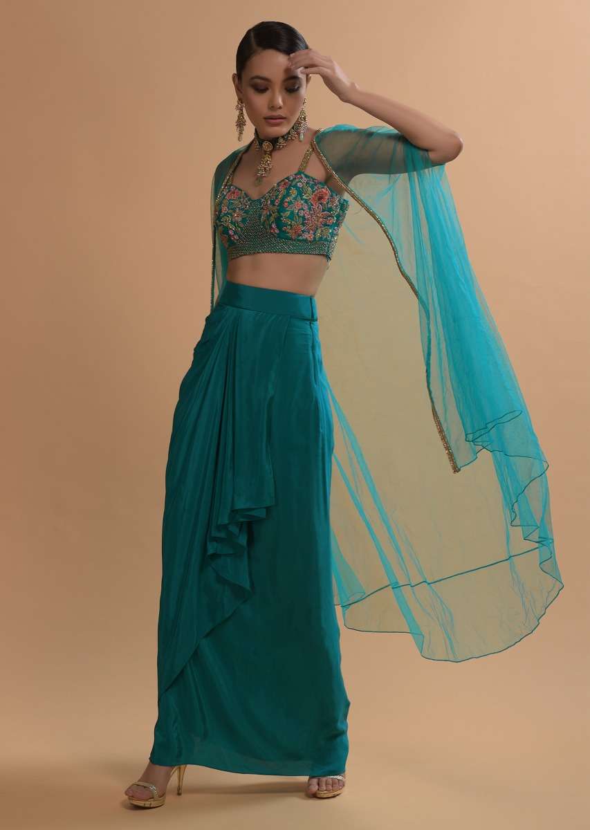Teal Drape Skirt And Crop Top With Matching Cape And Colorful Resham Embroidered Spring Blooms