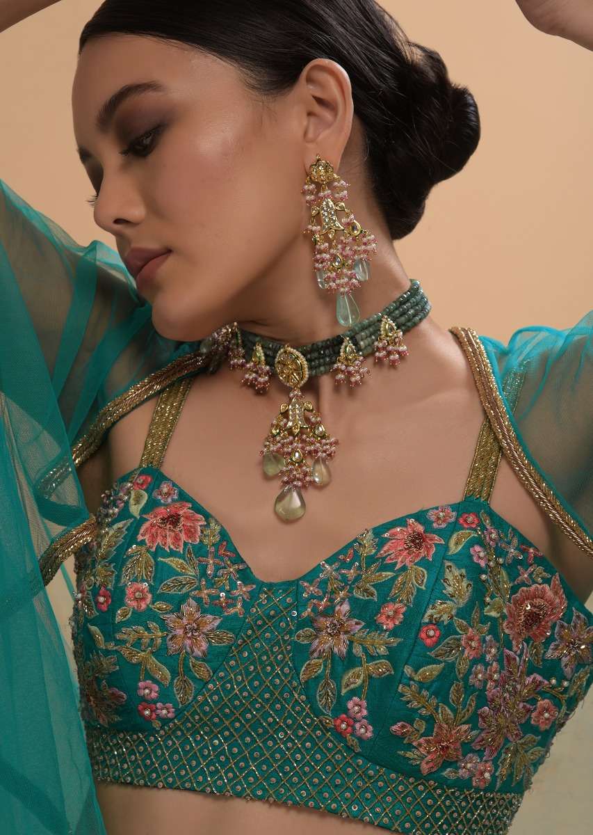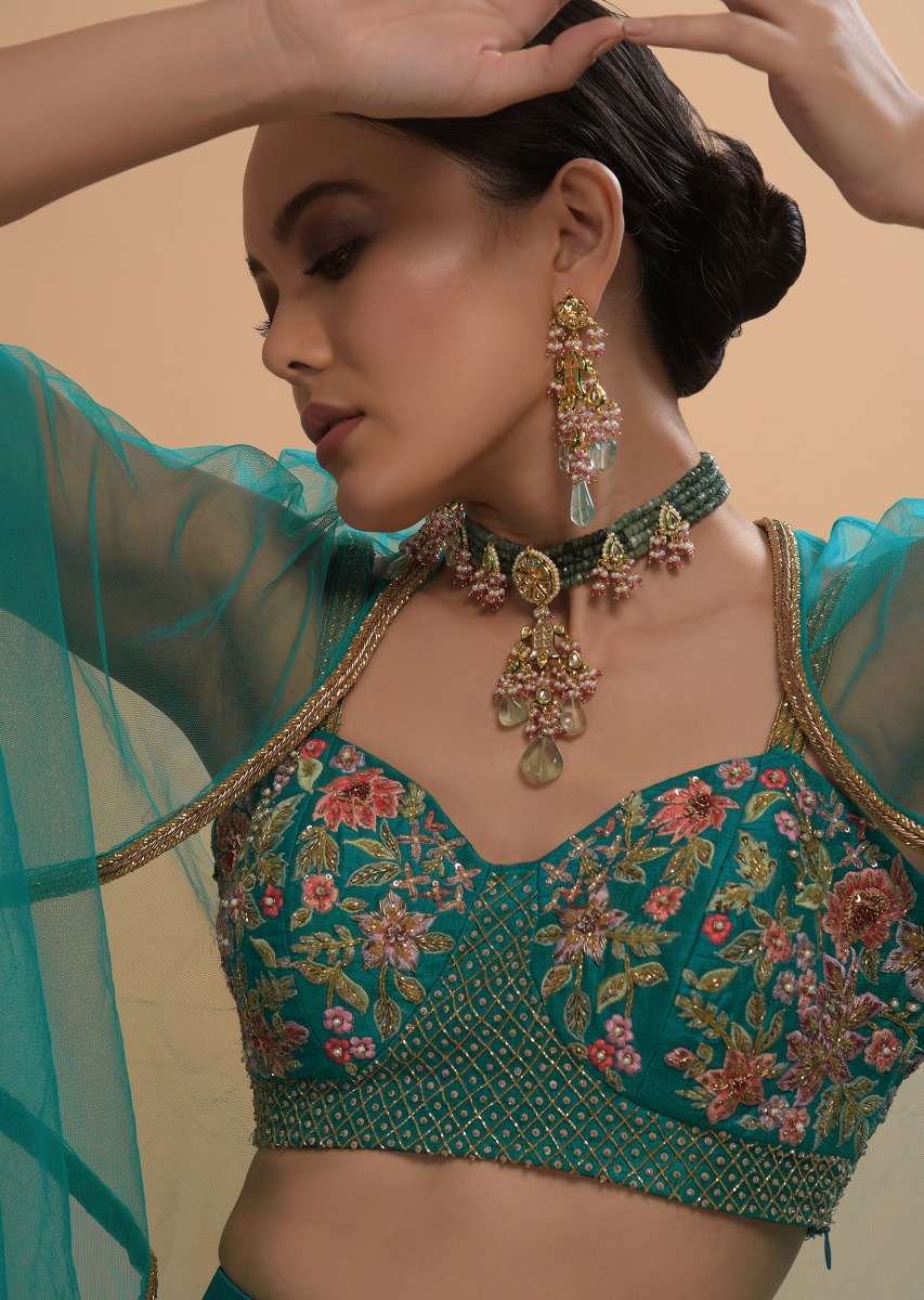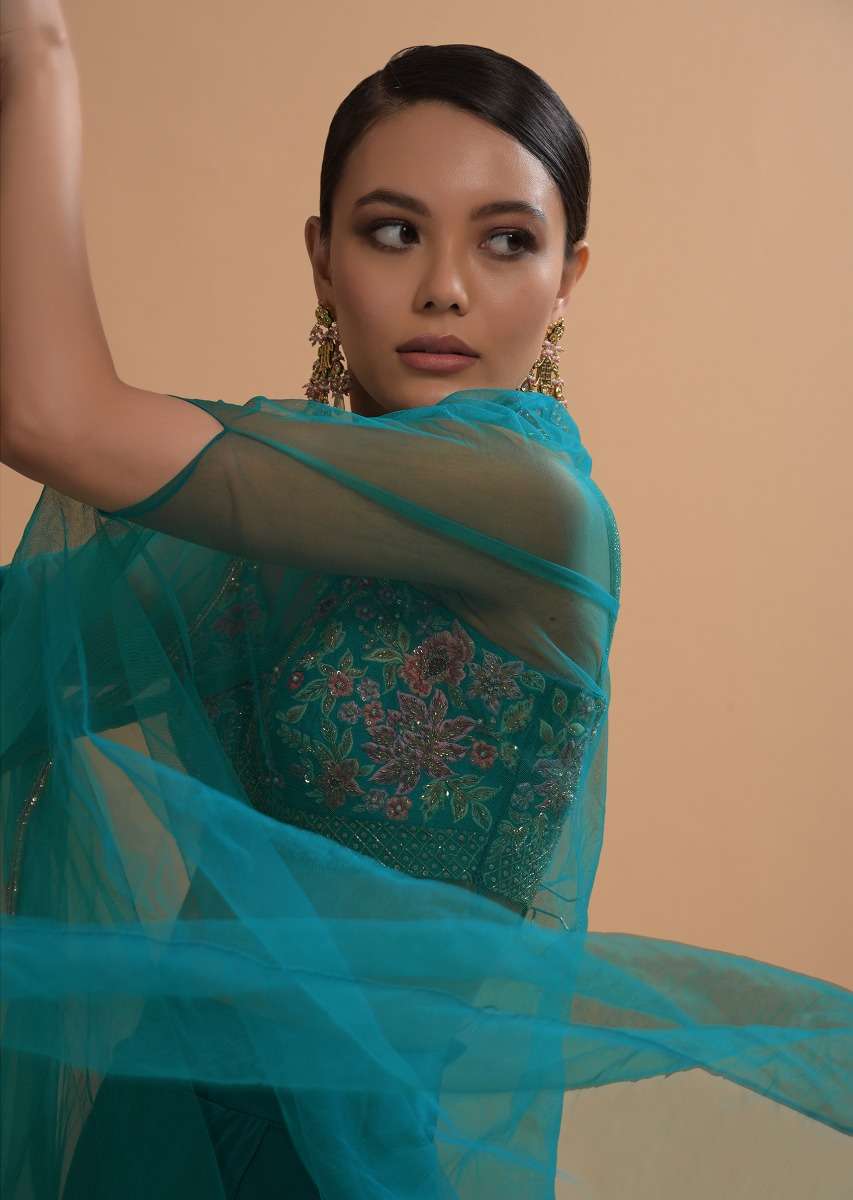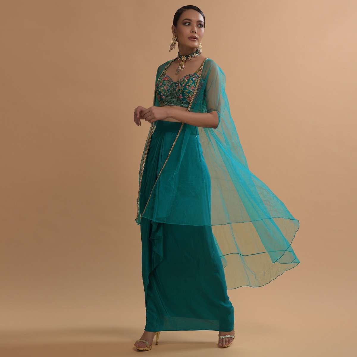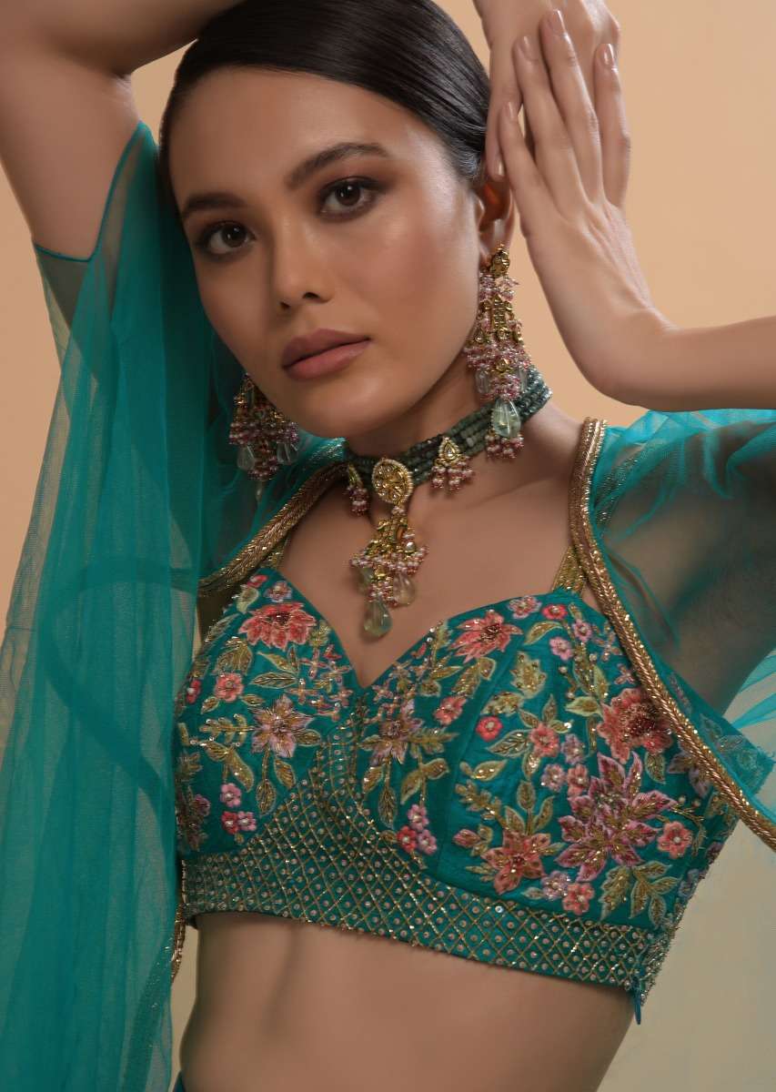 Teal Drape Skirt And Crop Top With Matching Cape And Colorful Resham Embroidered Spring Blooms