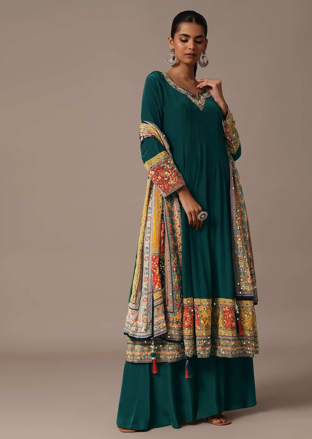 • Dive into a world of whimsical elegance with this enchanting teal green embroidered kurta palazzo set.