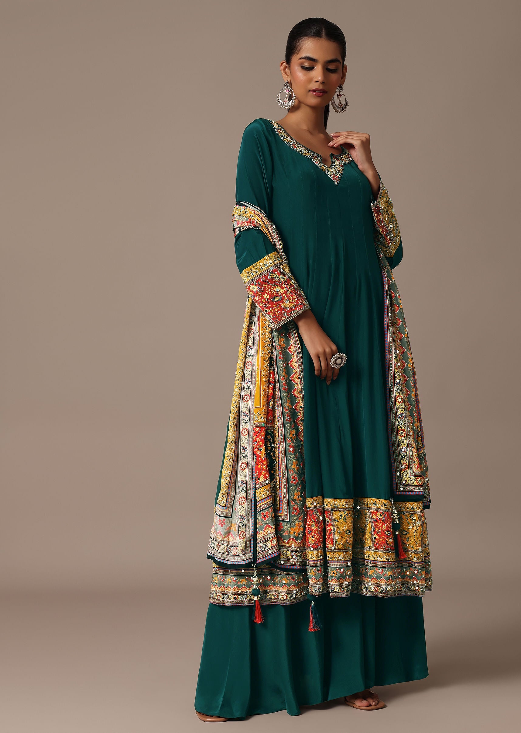 Teal Embroidered Kurta Palazzo Set With Mirror Work Dupatta