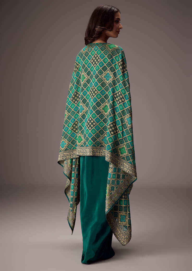 Teal Green Draped Skirt With Embroidered Blouse And Tassel Cape