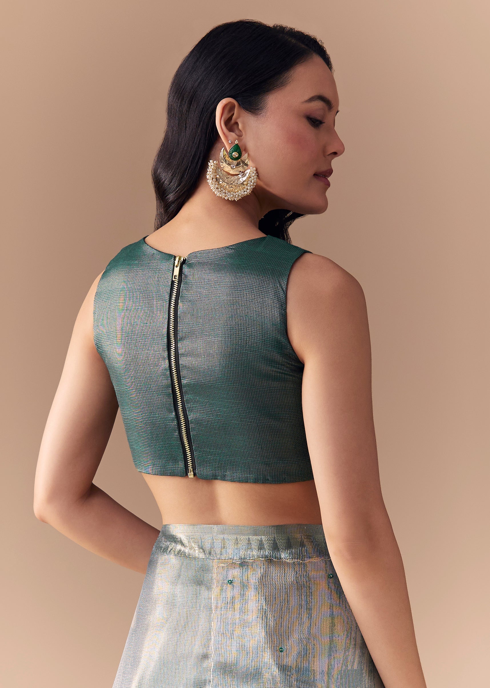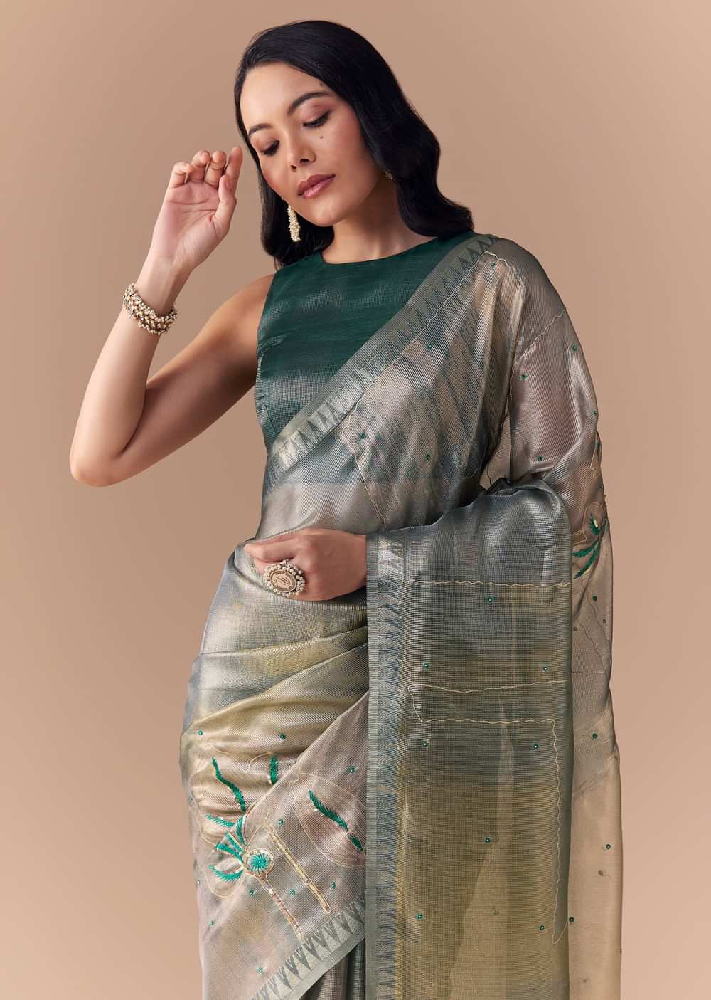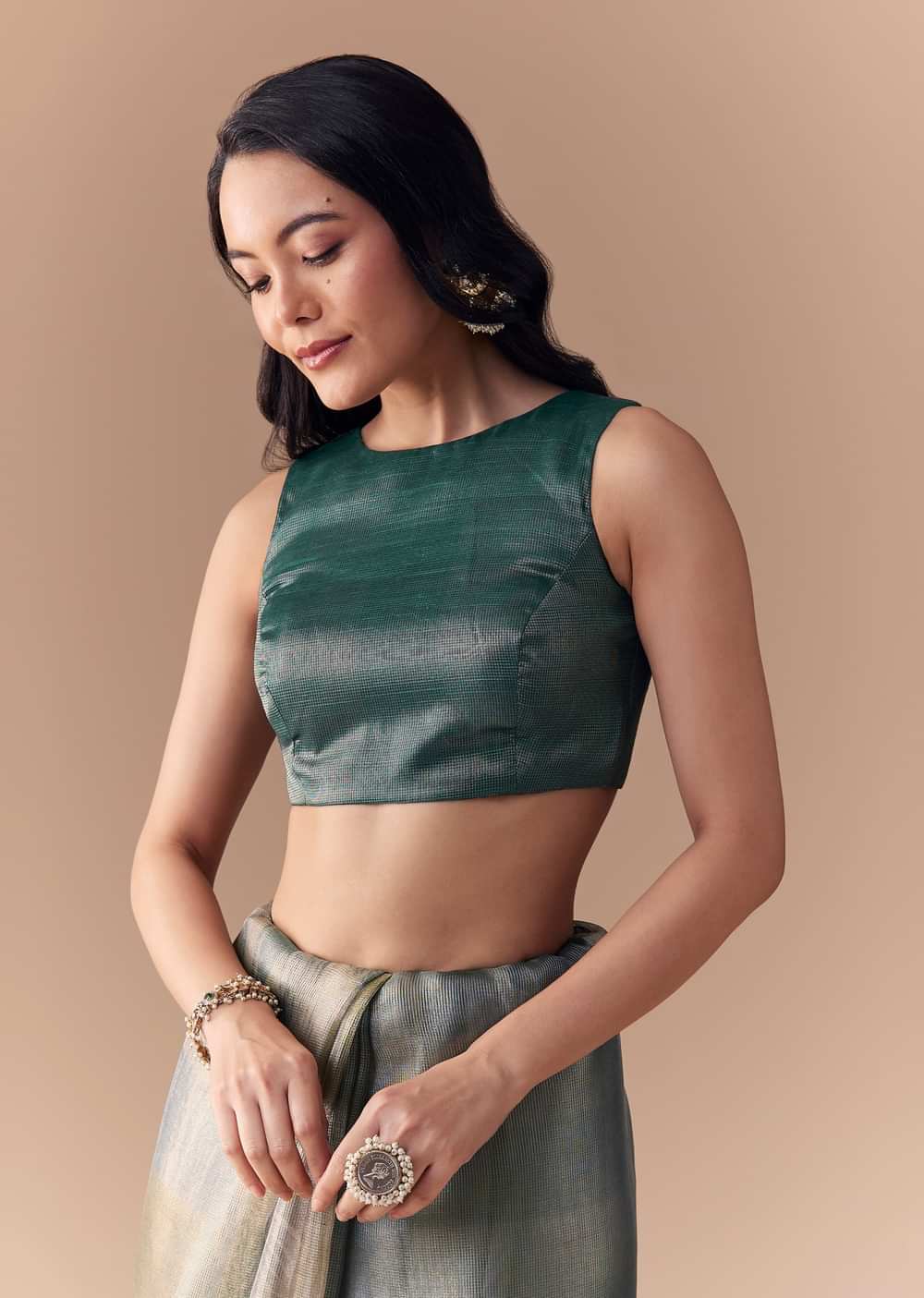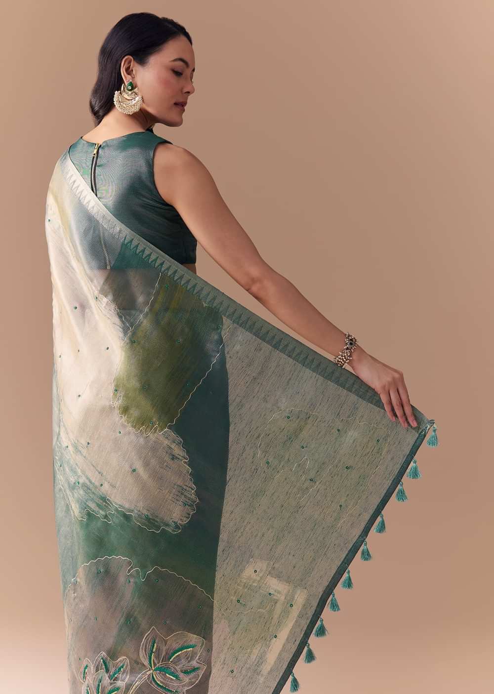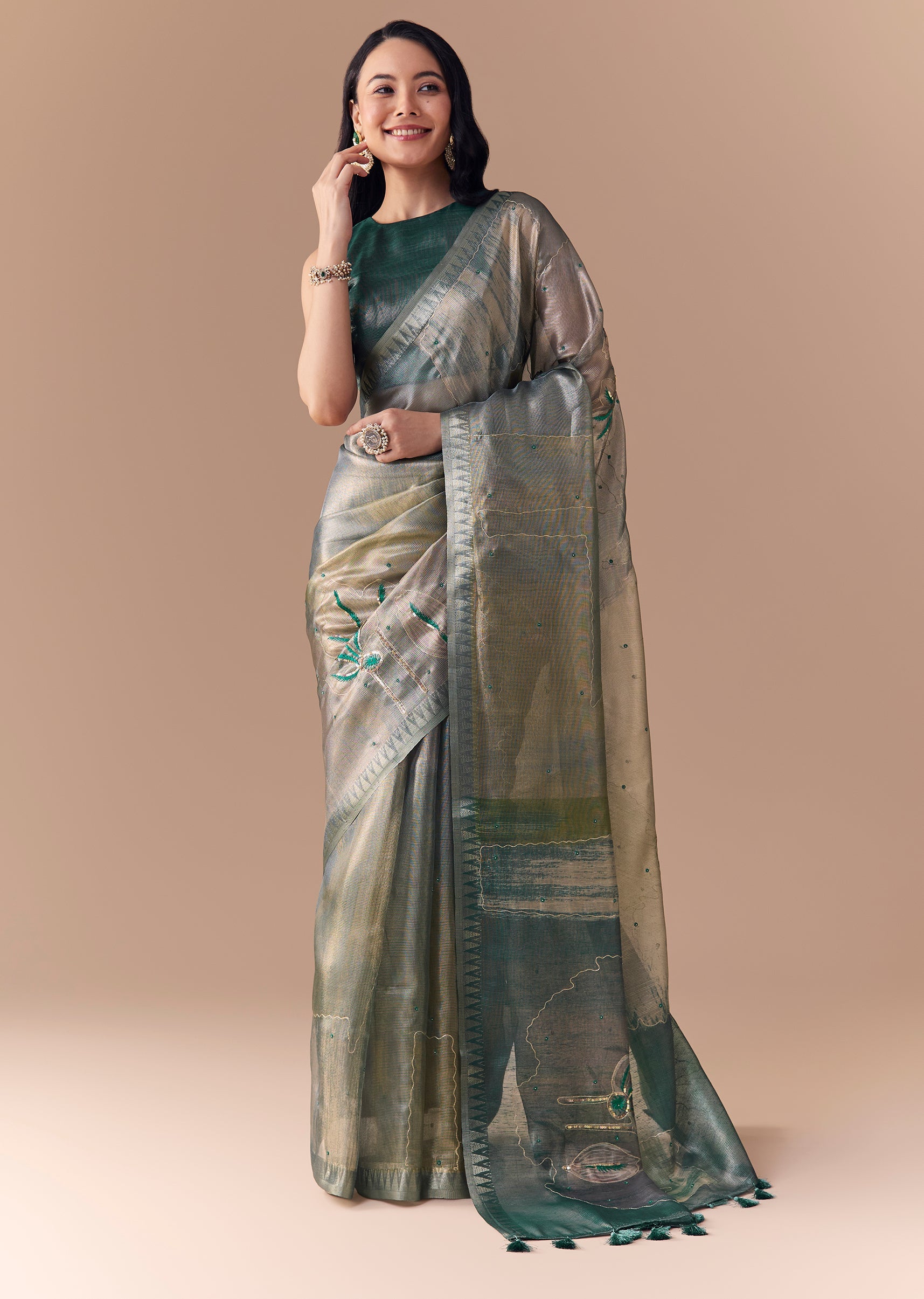 Teal Green Organza Silk Saree with Unstitched Blouse