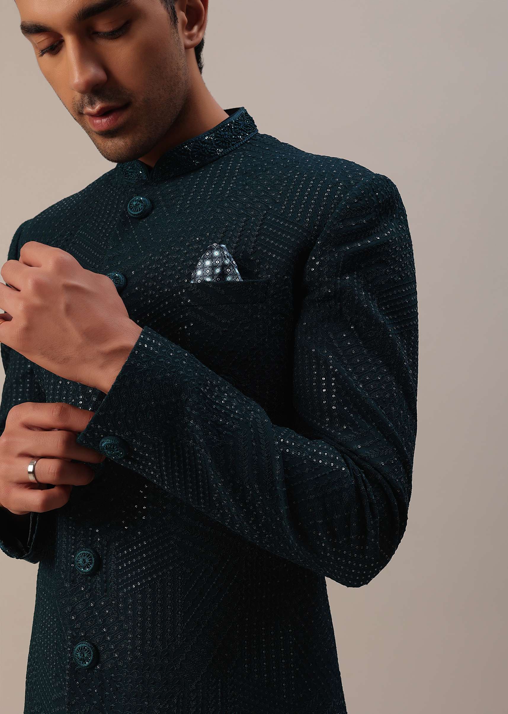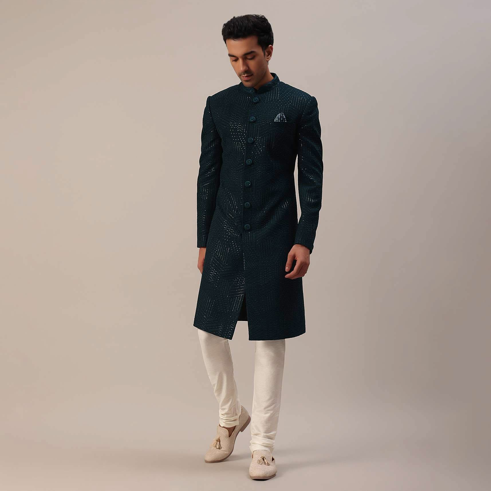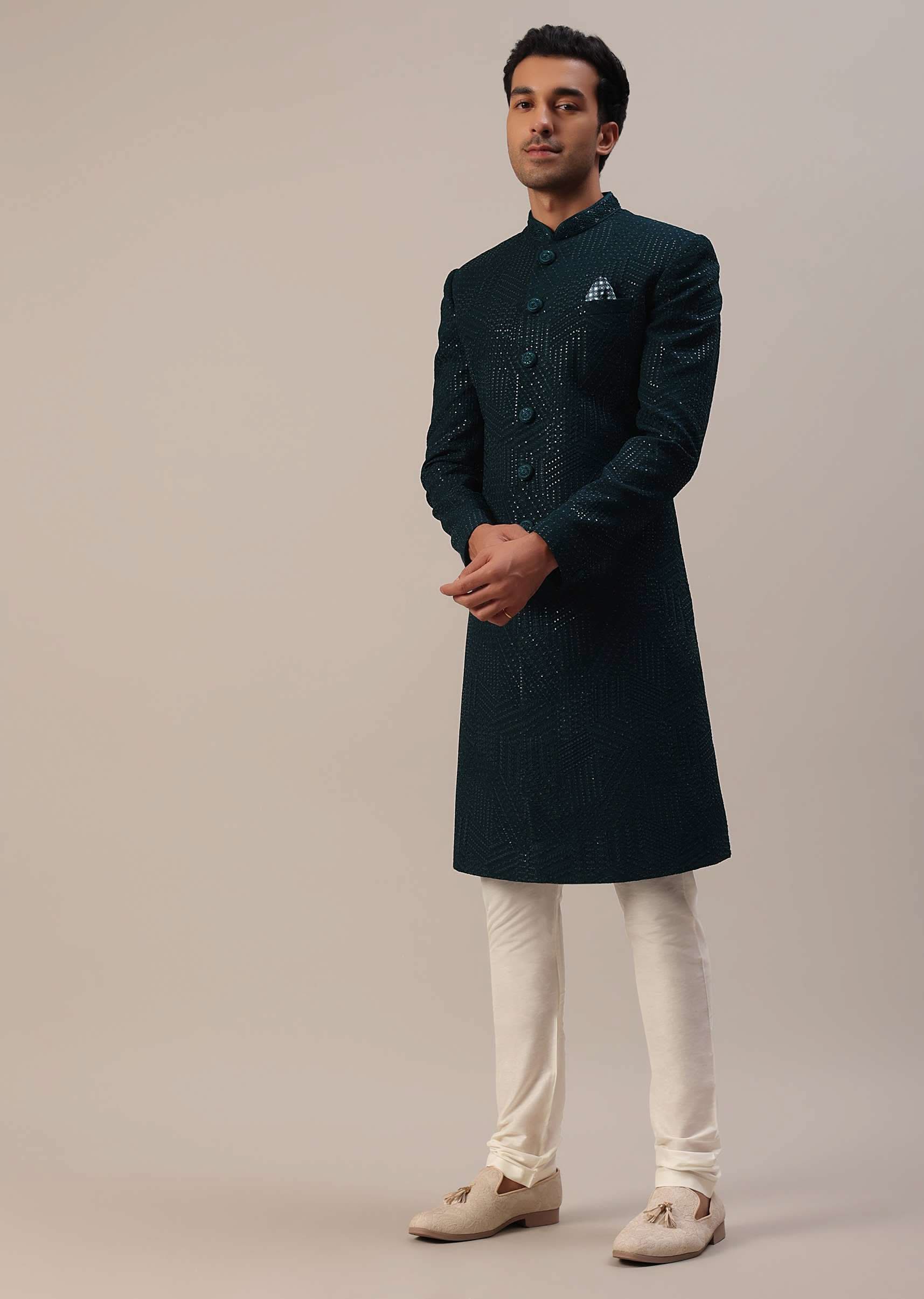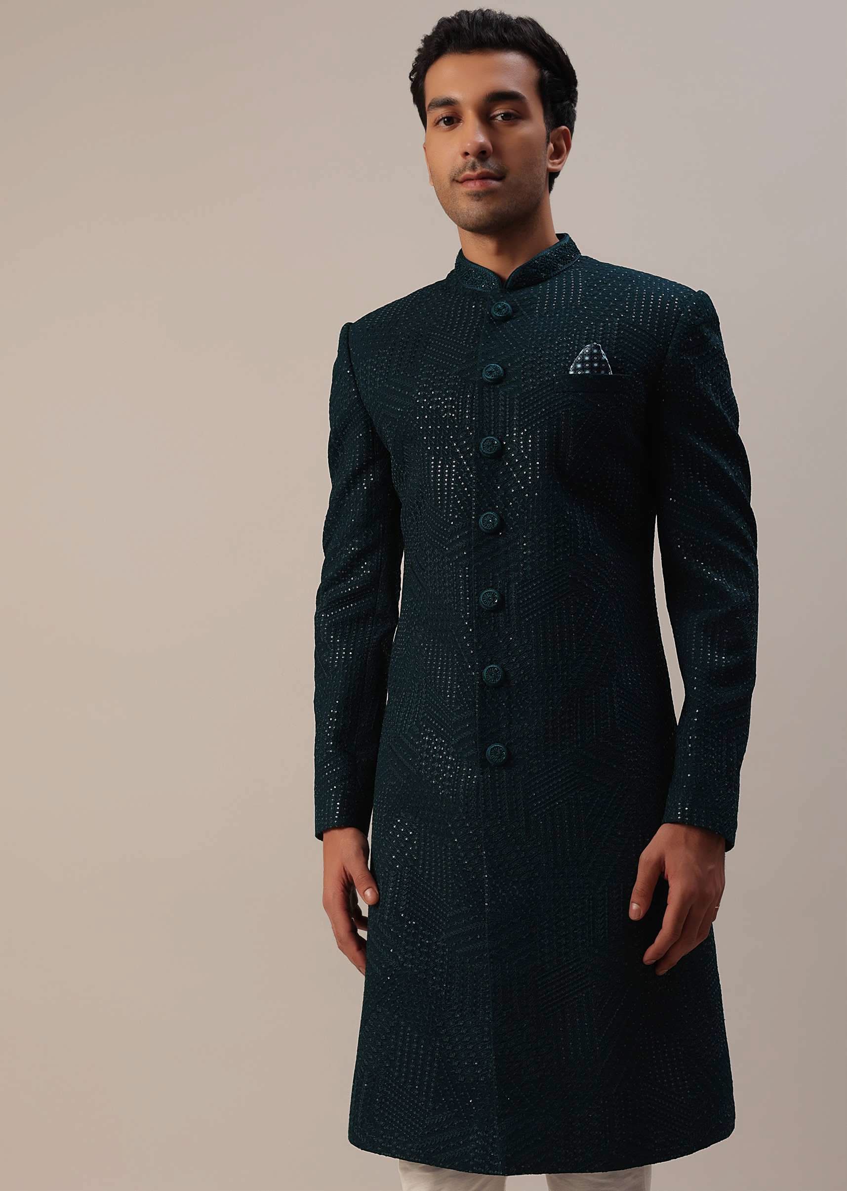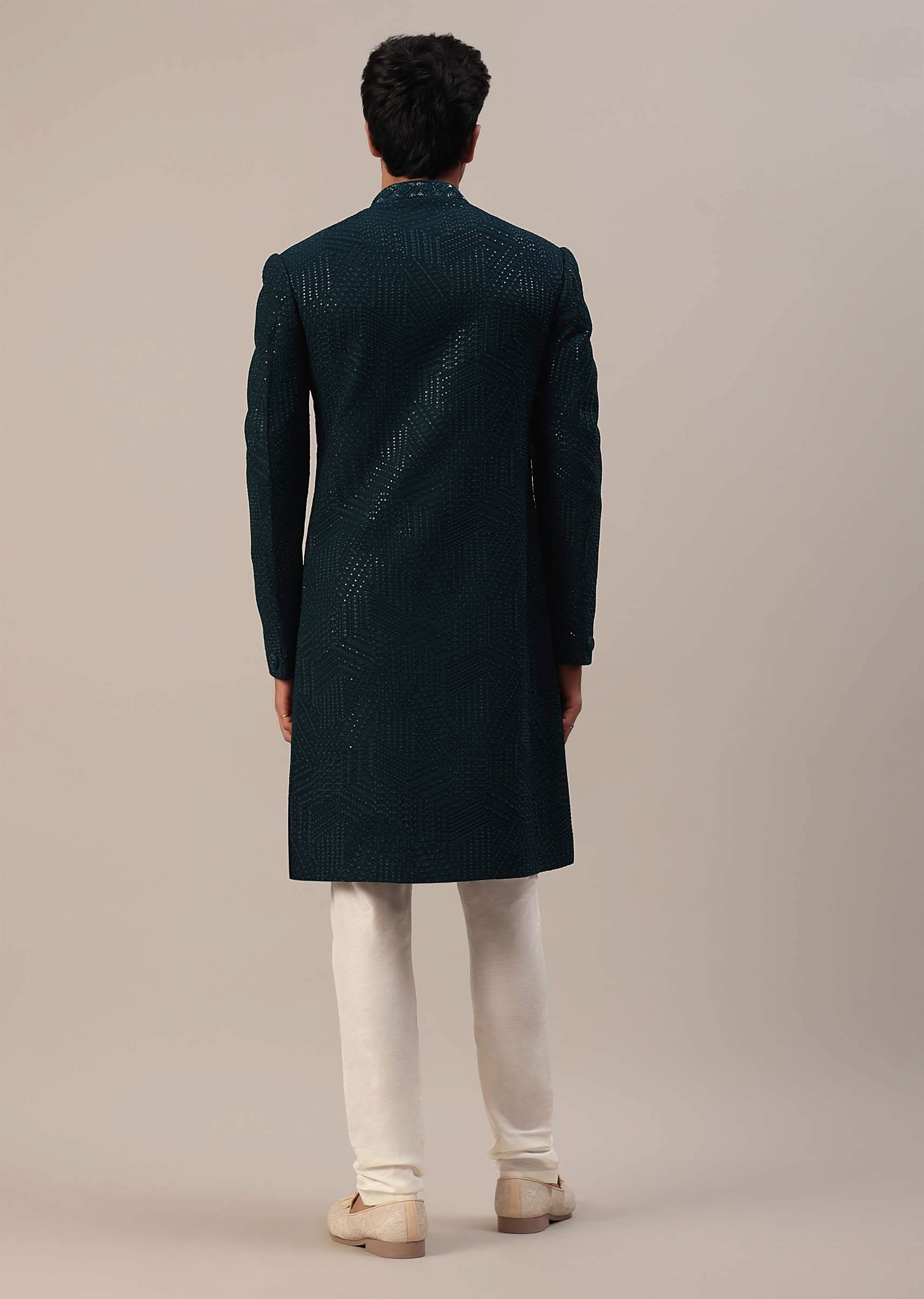 Teal Green Sherwani Set With Thread And Sequins Embroidery