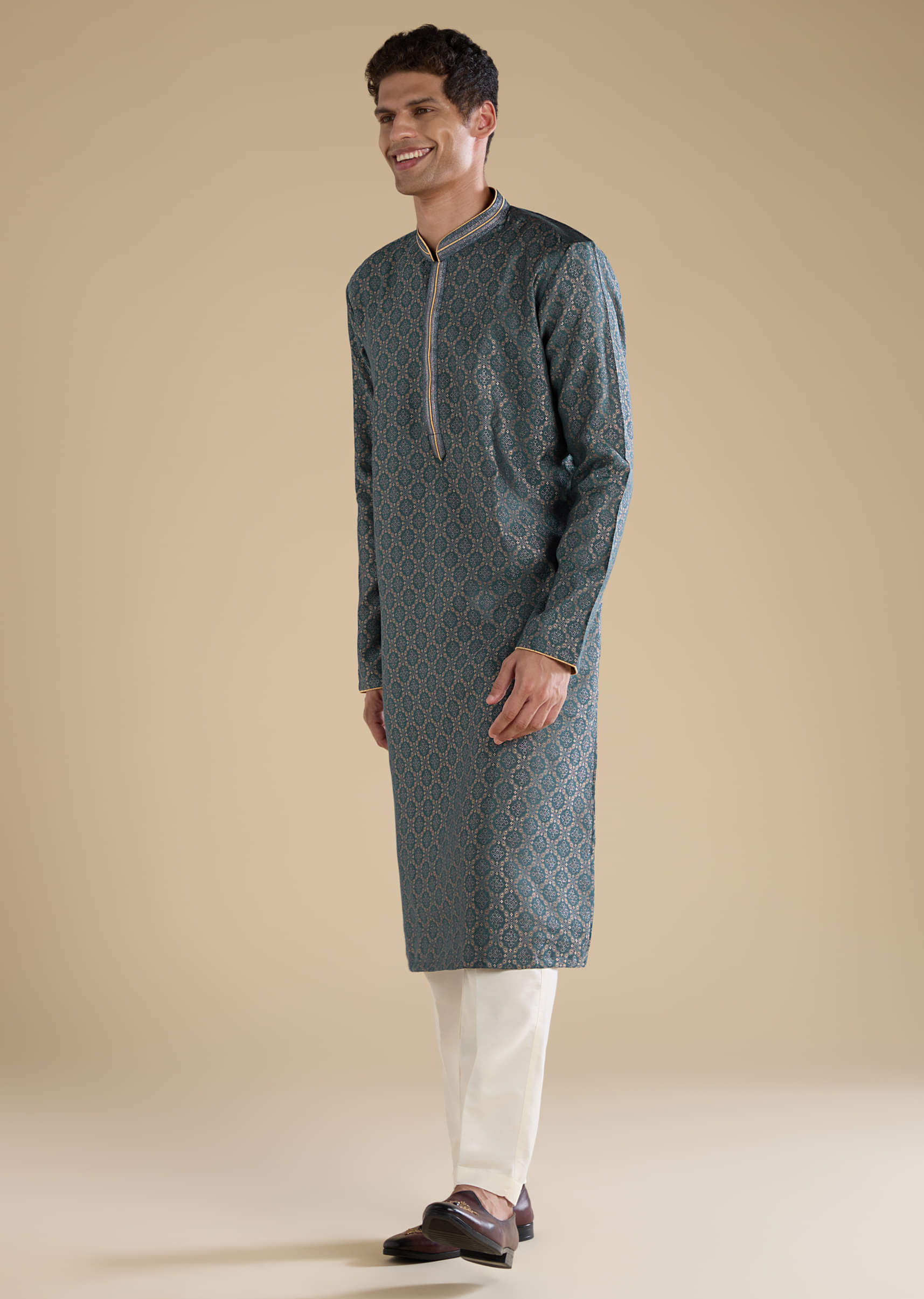 Embrace refined sophistication with this teal jacquard men’s kurta set, featuring an intricately woven self pattern that adds texture and a regal touch. The luxurious silk fabric offers a smooth sheen, while the mandarin collar enhances its modern, elegant appeal. Perfect for weddings, festive occasions, or cultural celebrations, this ensemble combines traditional craftsmanship with contemporary style. Awarded as the Most Trusted Brand, we're delivering styles you love, just as promised.