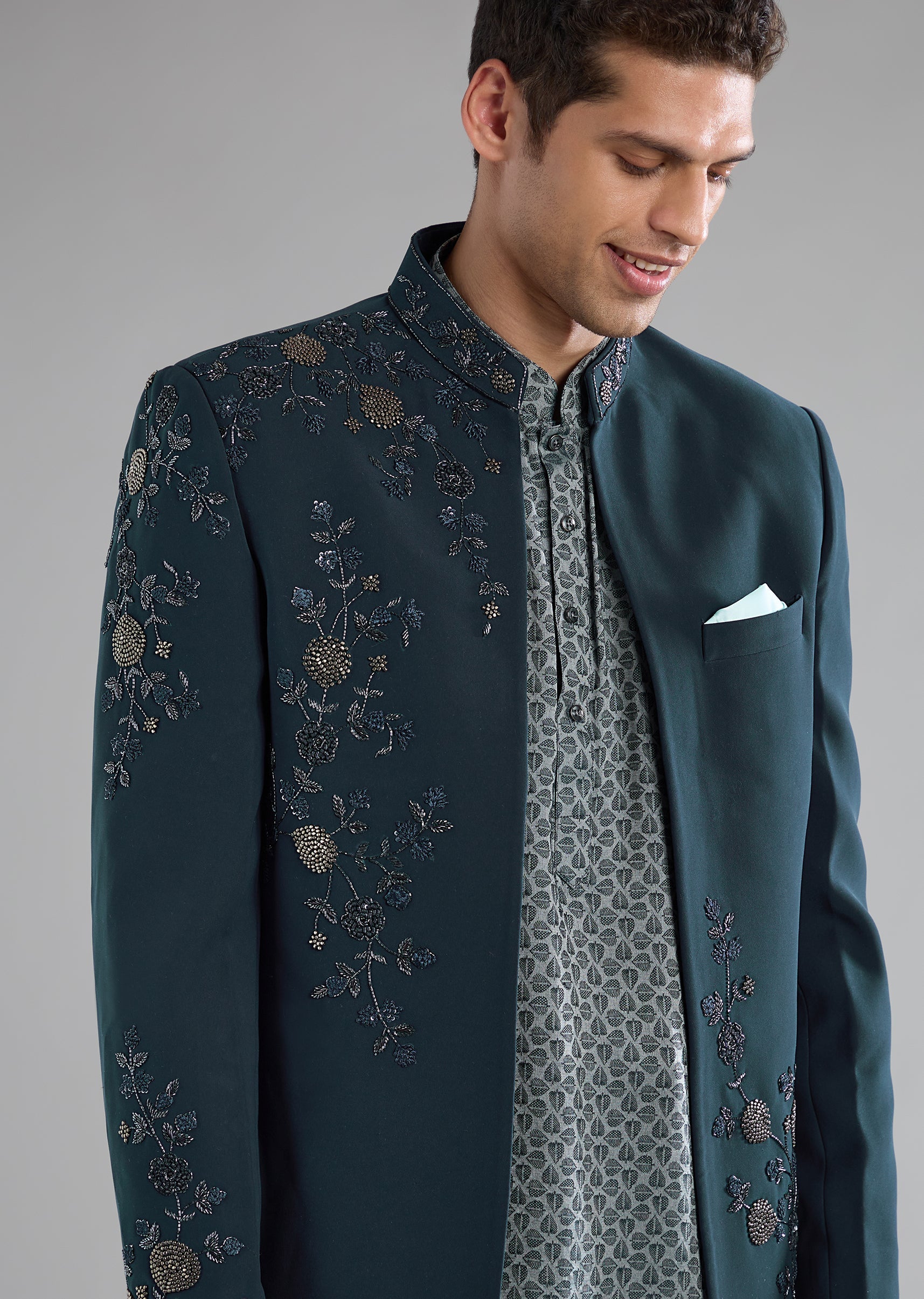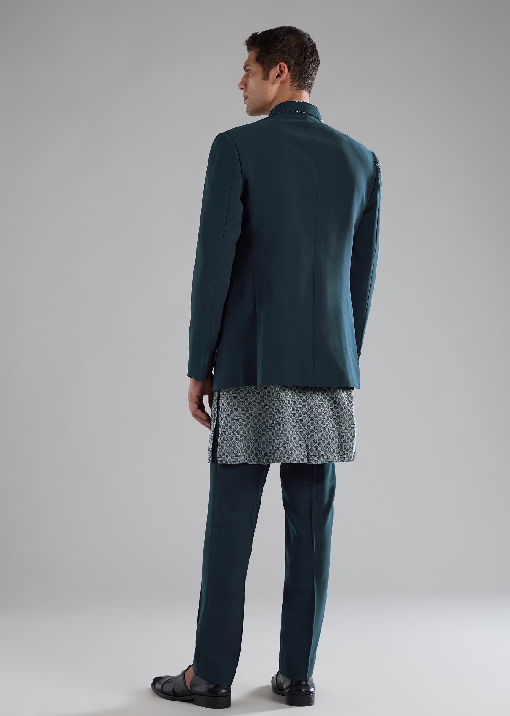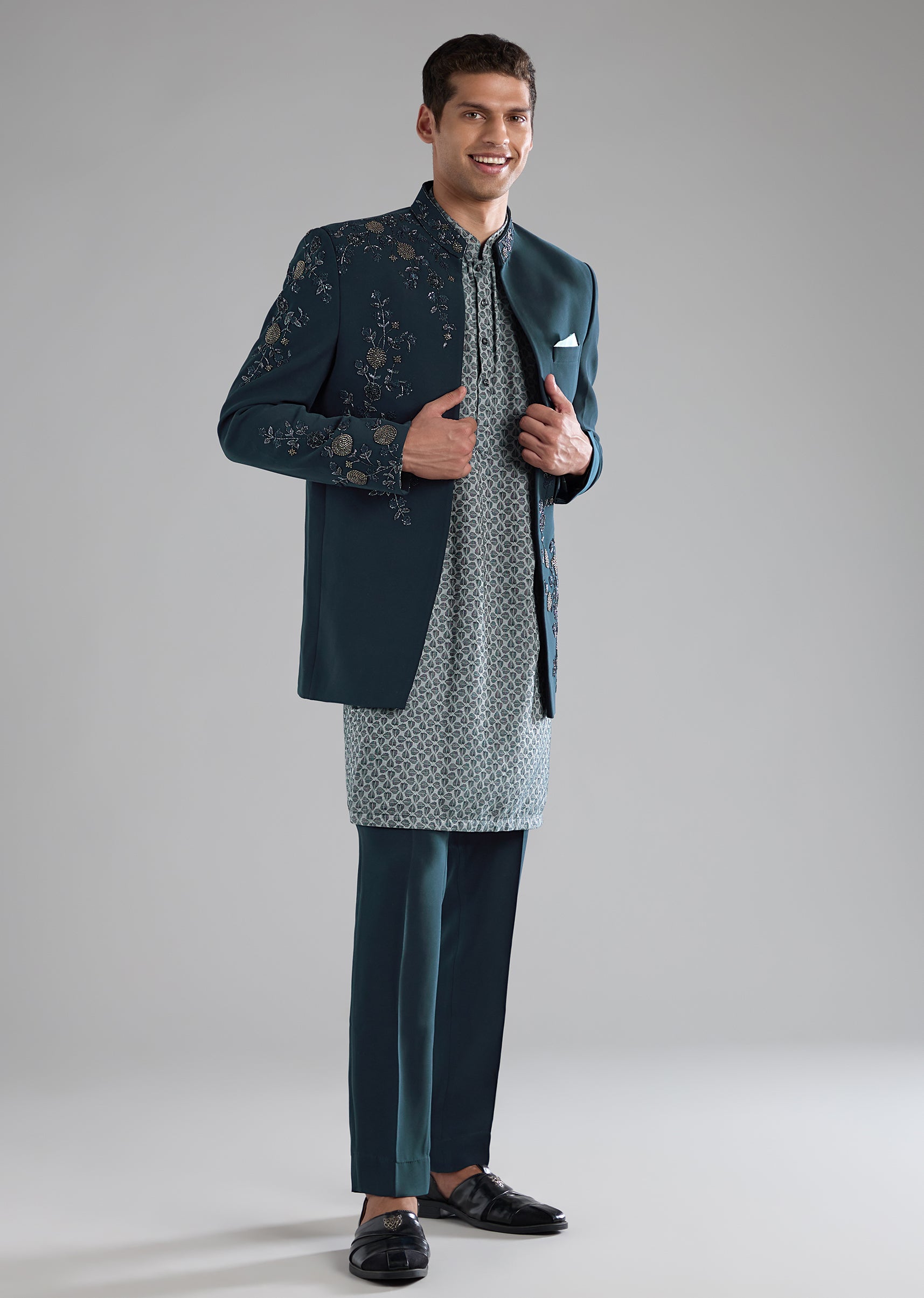 Designed for statement making elegance, this suiting jodhpuri kurta set brings together rich craftsmanship and sharp tailoring. The kurta is intricately detailed with thread and resham embroidery, elevated by bead,... More Product Details