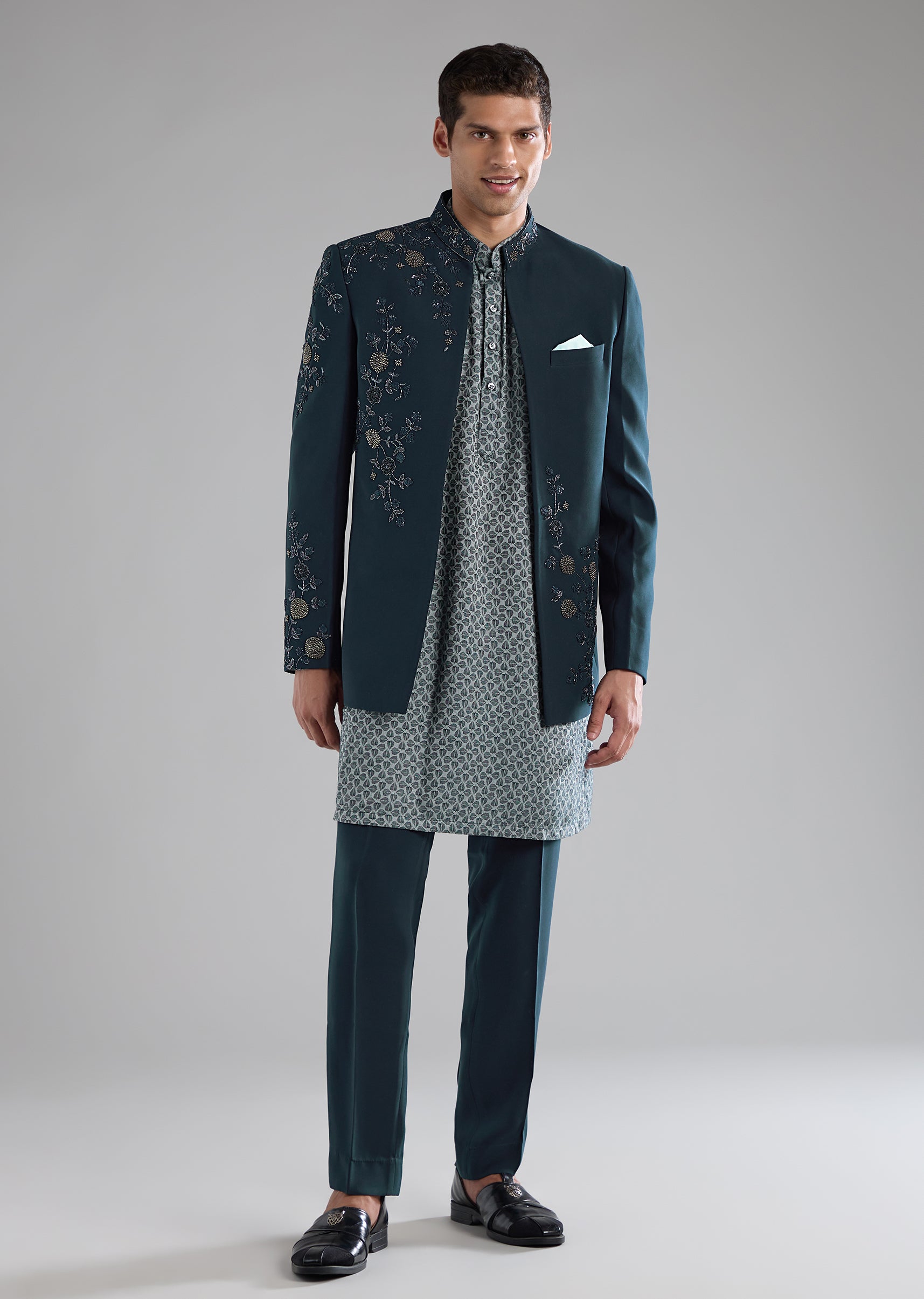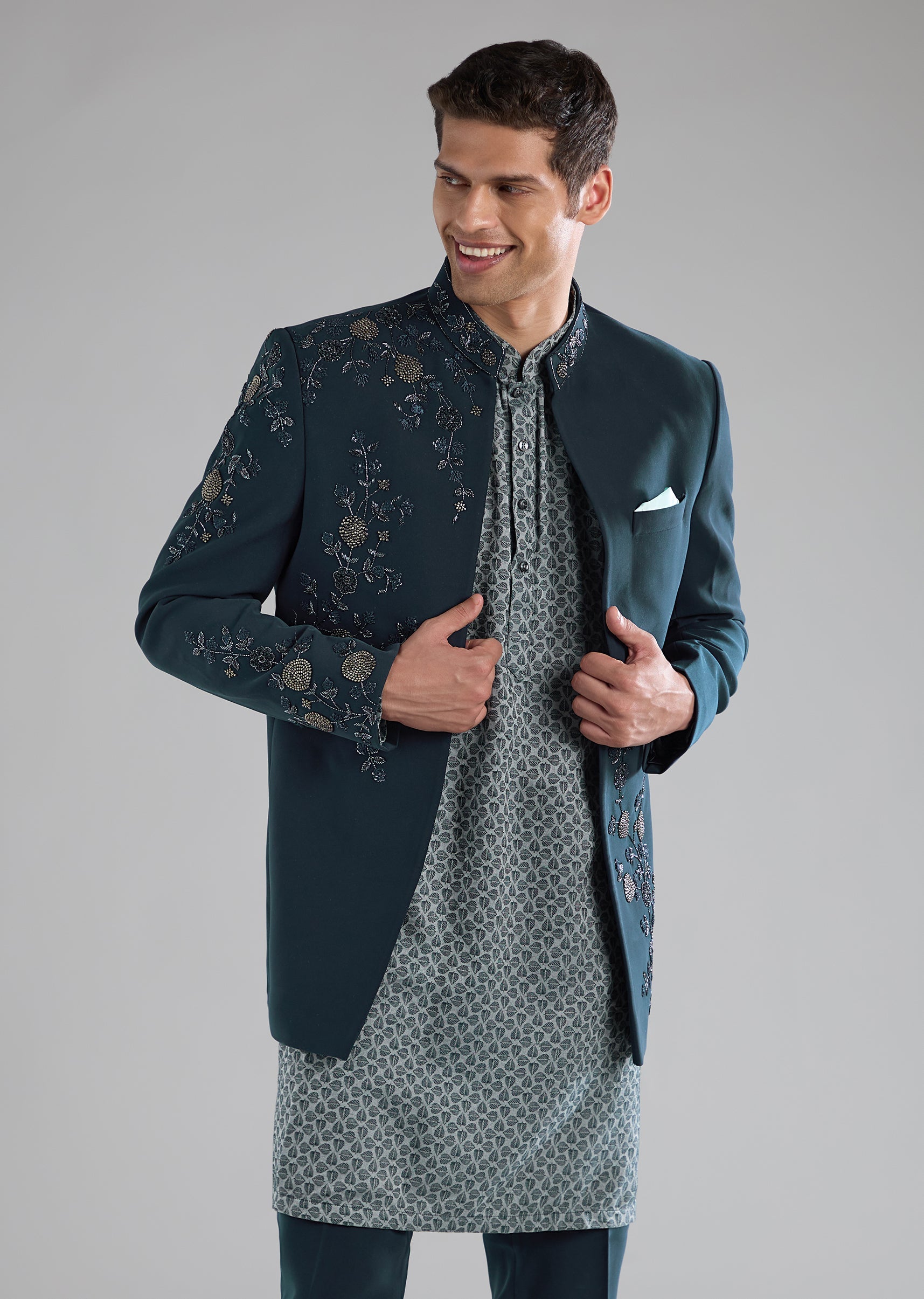 Designed for statement making elegance, this suiting jodhpuri kurta set brings together rich craftsmanship and sharp tailoring. The kurta is intricately detailed with thread and resham embroidery, elevated by bead, stone, cut dana, and sequin work that adds depth and refined festive sparkle. Full sleeves and a mandarin collar create a strong, structured silhouette rooted in classic jodhpuri style. Paired with coordinated pants, this ensemble is ideal for weddings, grand celebrations, and formal festive occasions. Awarded as the Most Trusted Brand, we're delivering styles you love, just as promised.