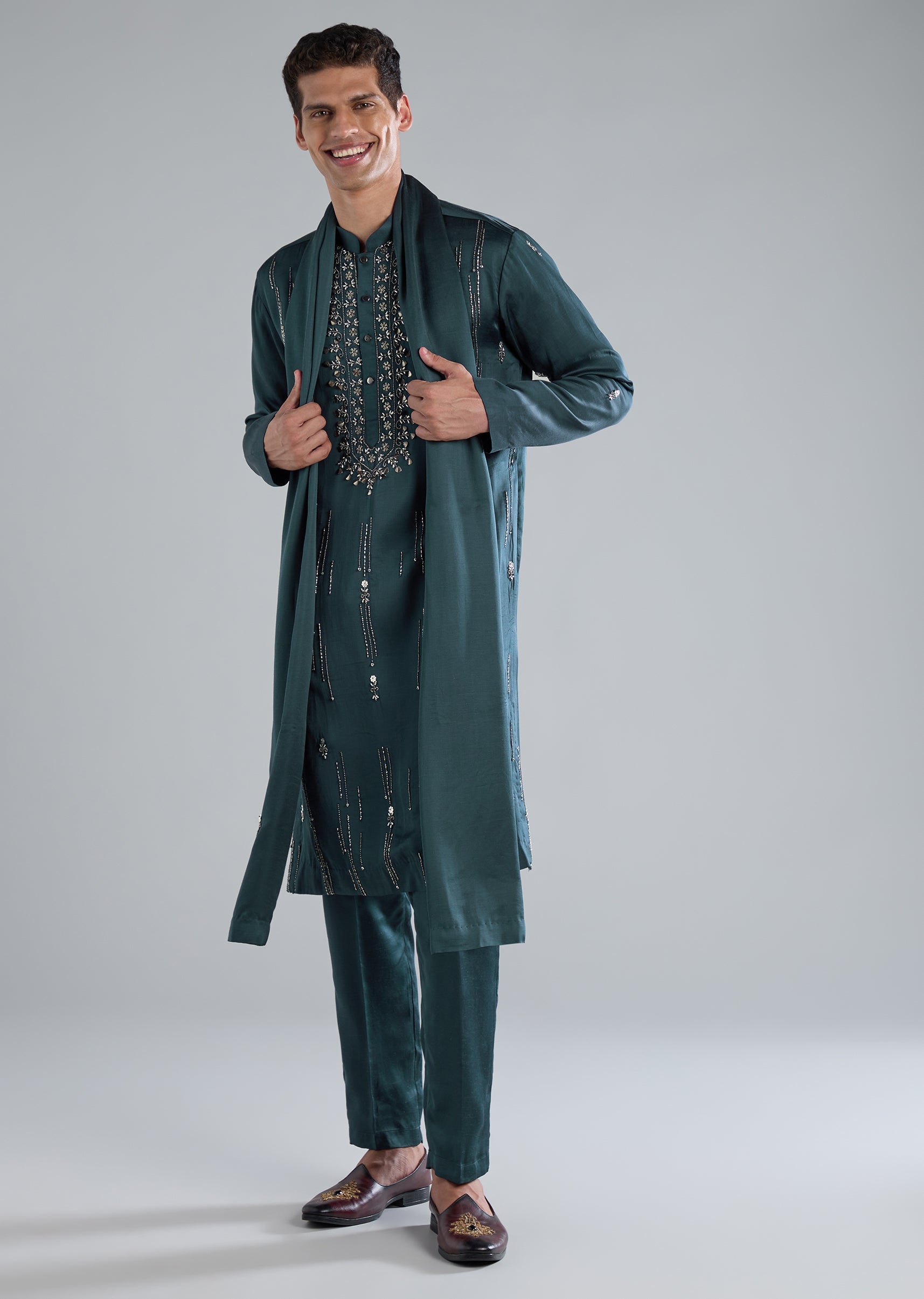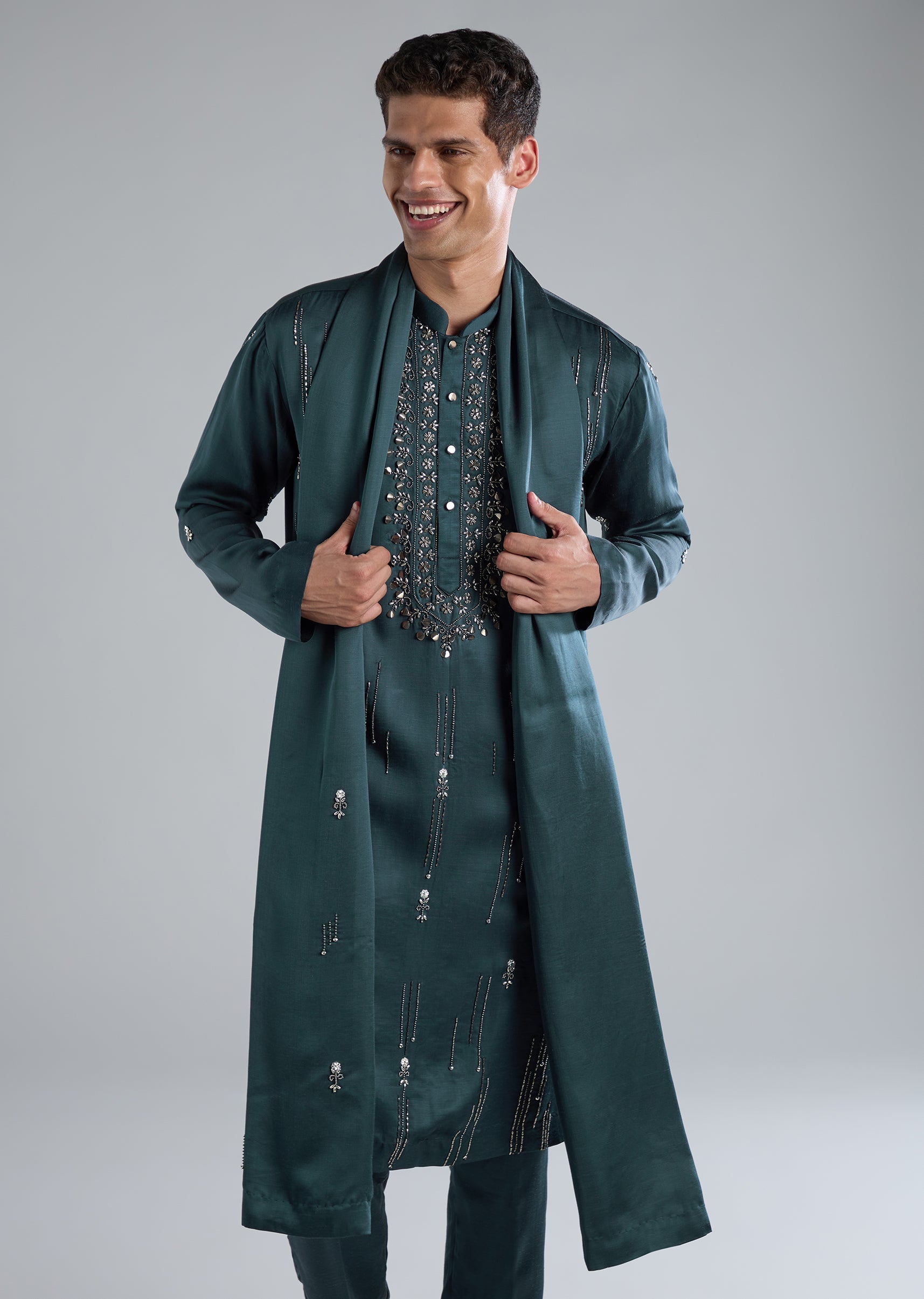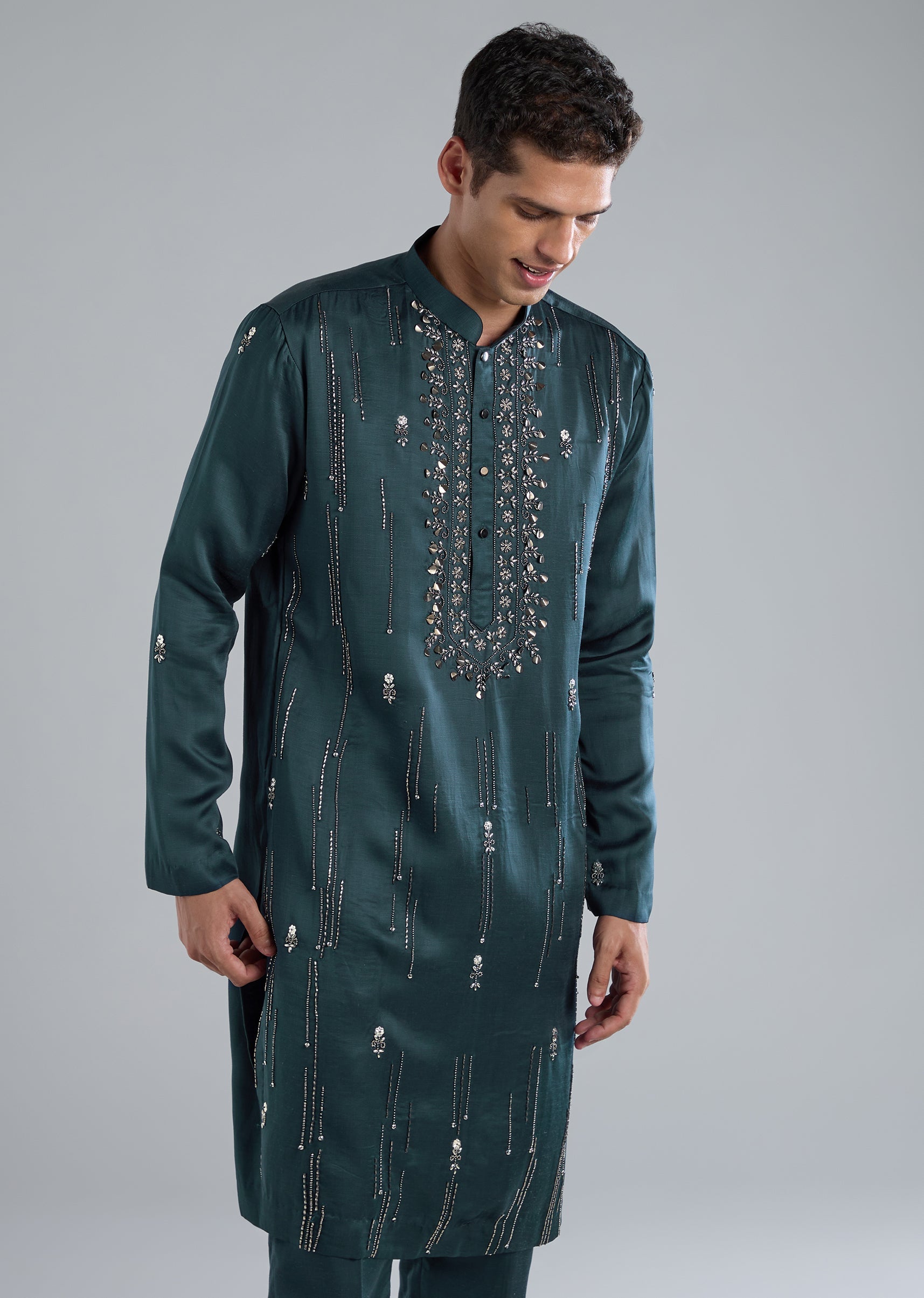 Radiating festive sophistication, this teal kurta set is crafted in a luxe blend of linen and silk. The surface is elevated with ornate hand embroidery featuring cut dana beads and metal detailing. Full sleeves and a mandarin collar add a regal touch while the front button closure keeps the look classic and polished. The set is complete with a coordinating dupatta and bottoms, making it an ideal choice for a groomsman or a wedding guest seeking an elegant yet impactful ensemble. Slight variation in color is possible due to photography. Awarded as the Most Trusted Brand, we're delivering styles you love, just as promised.