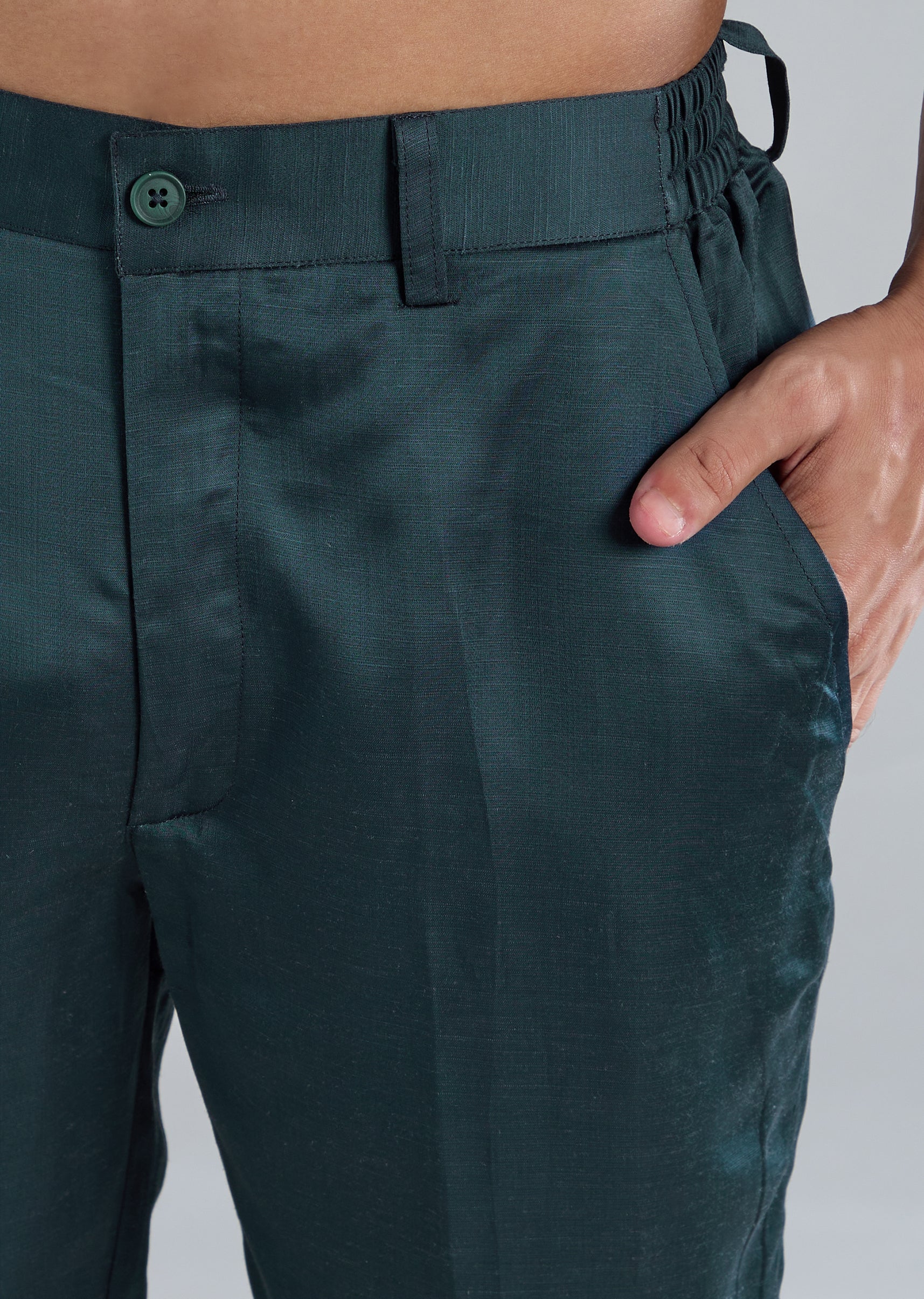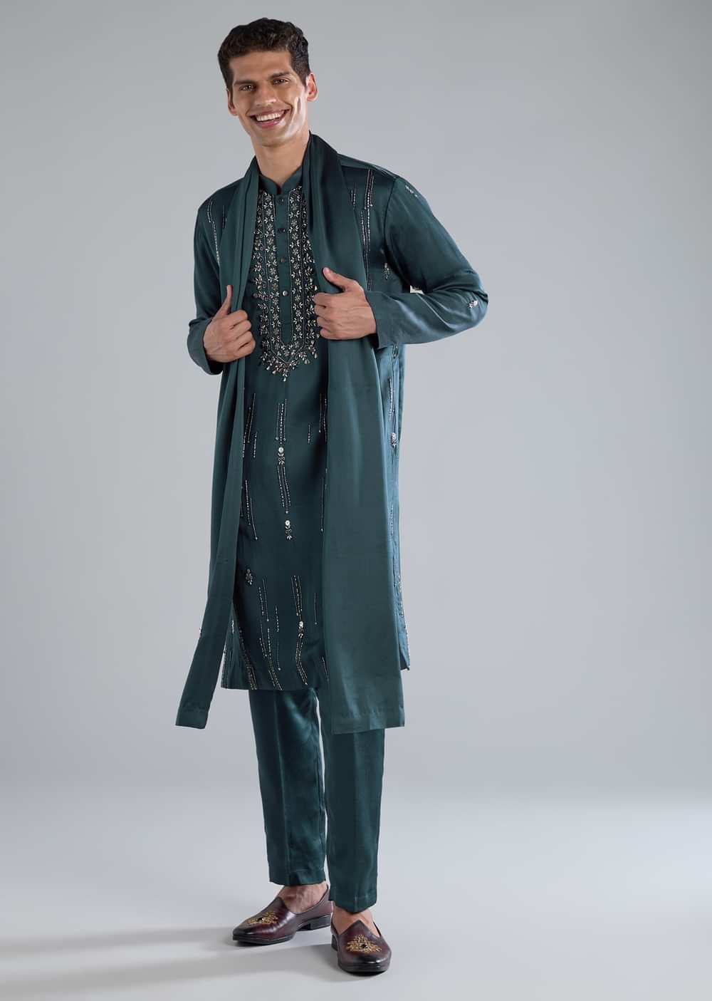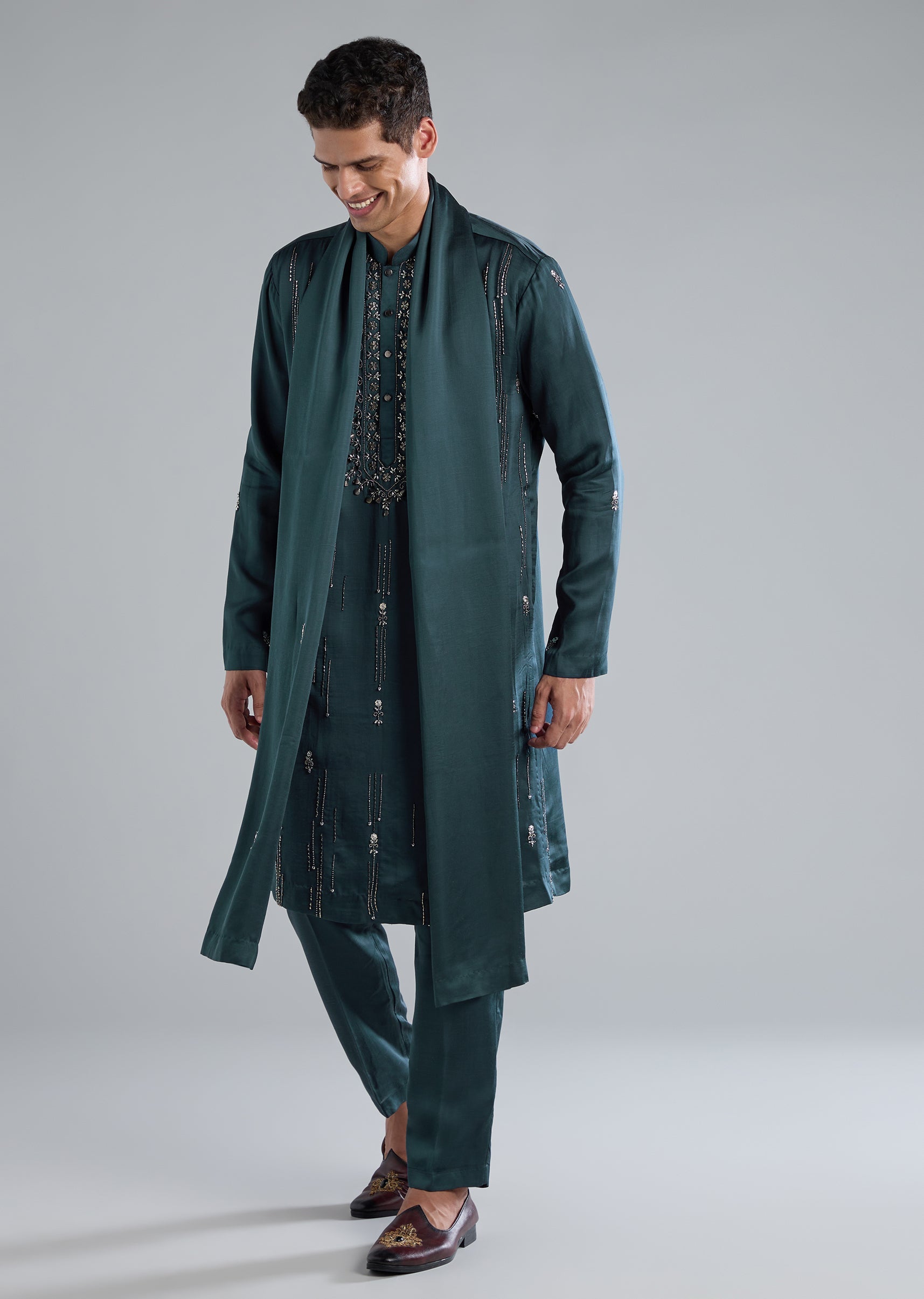 Radiating festive sophistication, this teal kurta set is crafted in a luxe blend of linen and silk. The surface is elevated with ornate hand embroidery featuring cut dana beads and metal detailing. Full sleeves and a mandarin collar add a regal touch while the front button closure keeps the look classic and polished. The set is complete with a coordinating dupatta and bottoms, making it an ideal choice for a groomsman or a wedding guest seeking an elegant yet impactful ensemble. Slight variation in color is possible due to photography. Awarded as the Most Trusted Brand, we're delivering styles you love, just as promised.