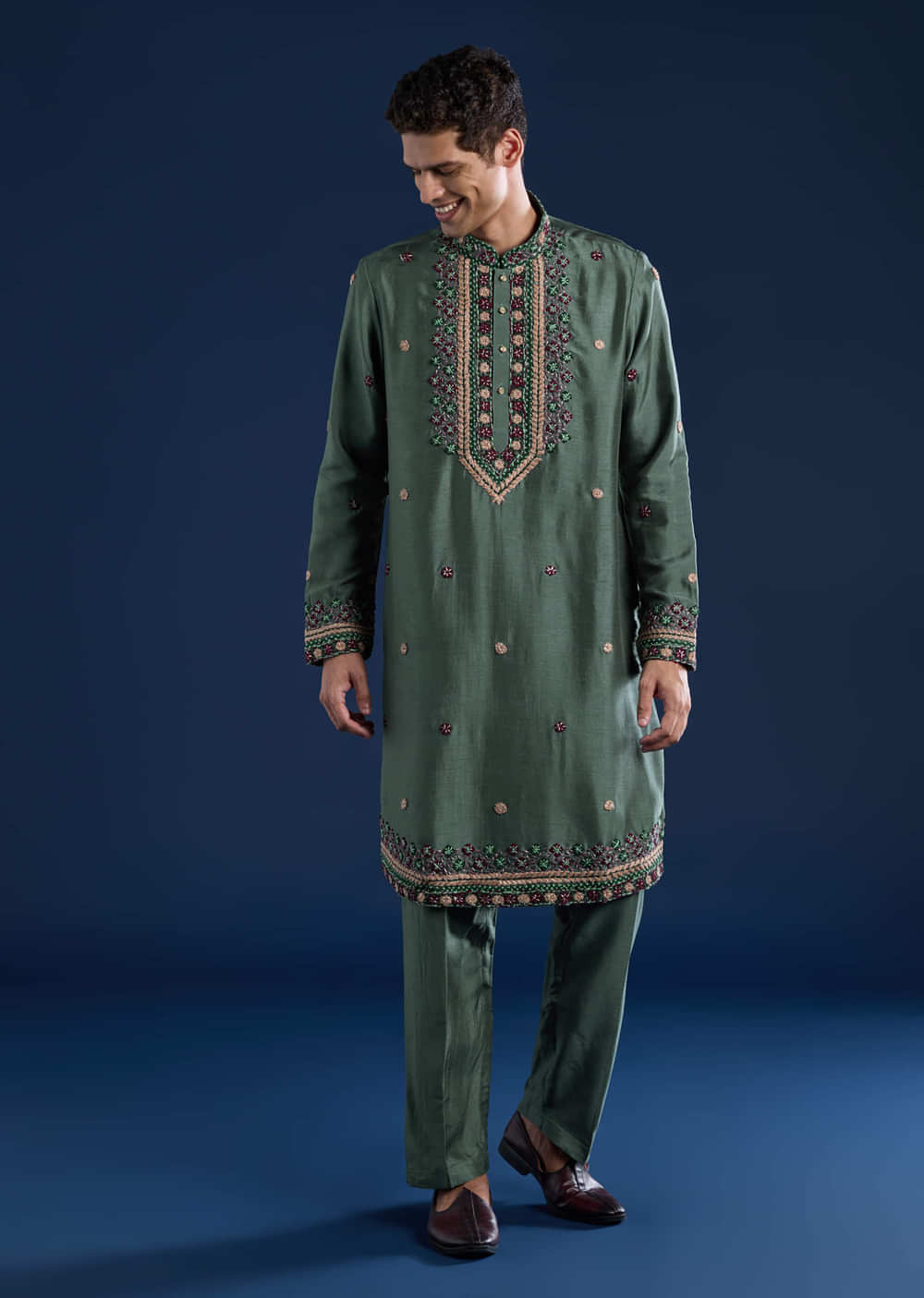 Teal Resham Embroidered Mens Kurta and Pant Set