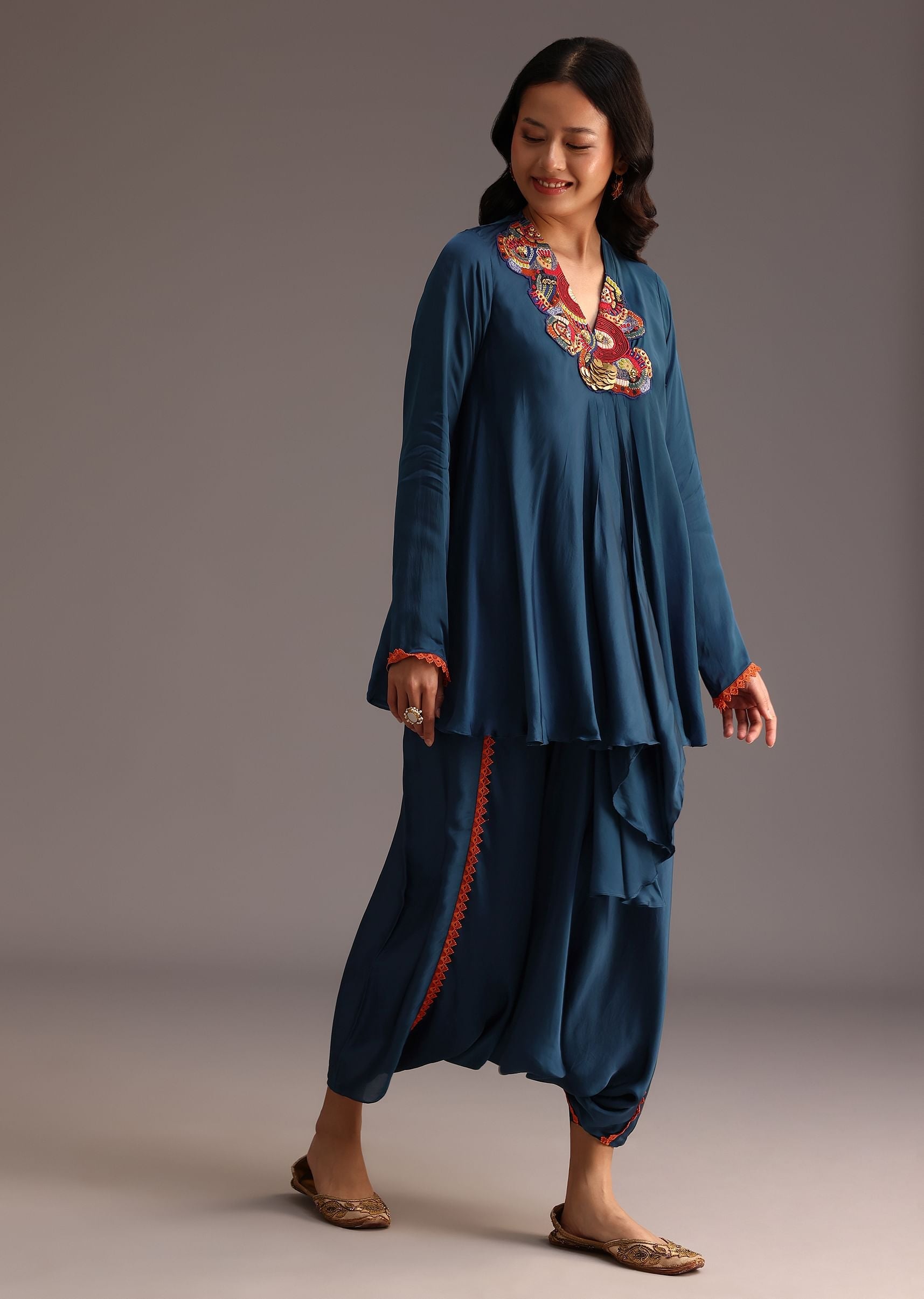 A teal tapestry a boho dream. Adorned with delicate thread and beadwork dancing gracefully over a laceembellished dhoti. The satin fabric shimmers like moonlight while the teal hue adds a... More Product Details