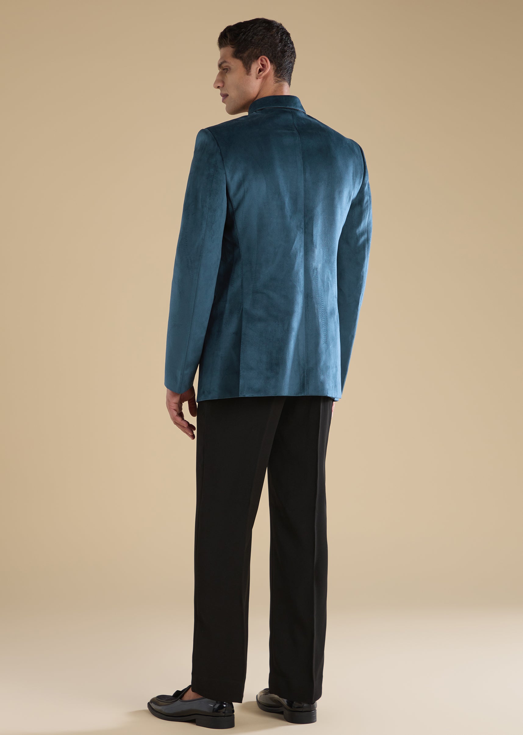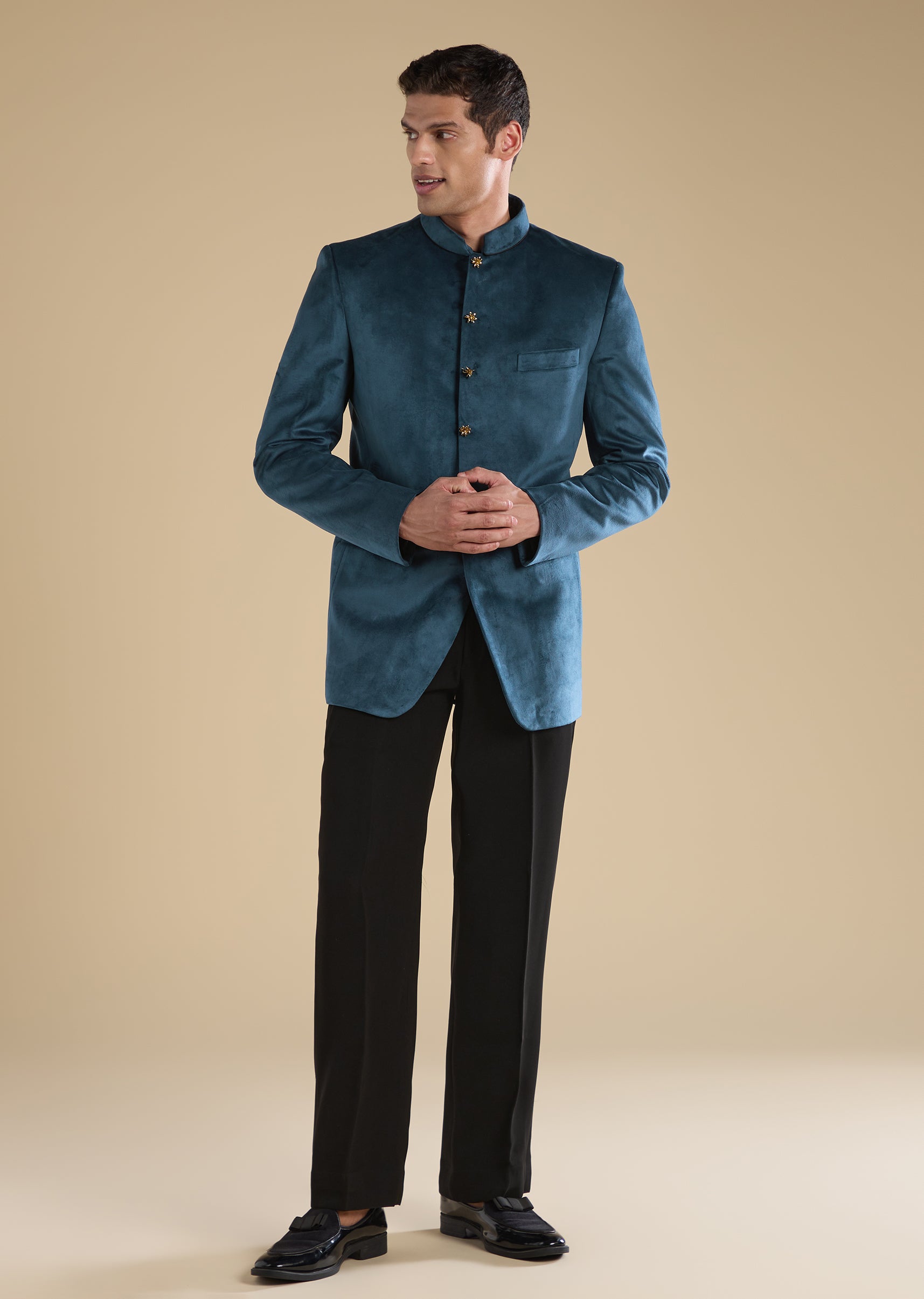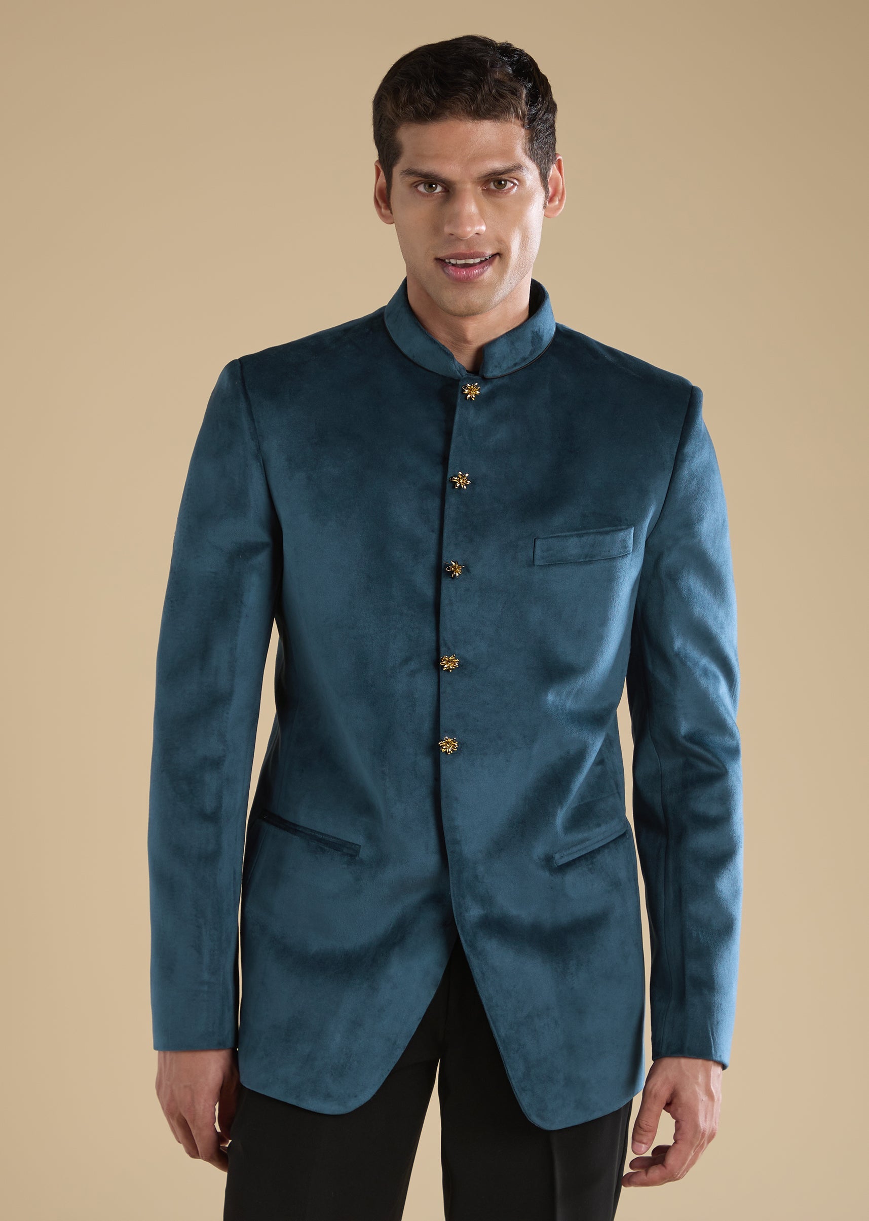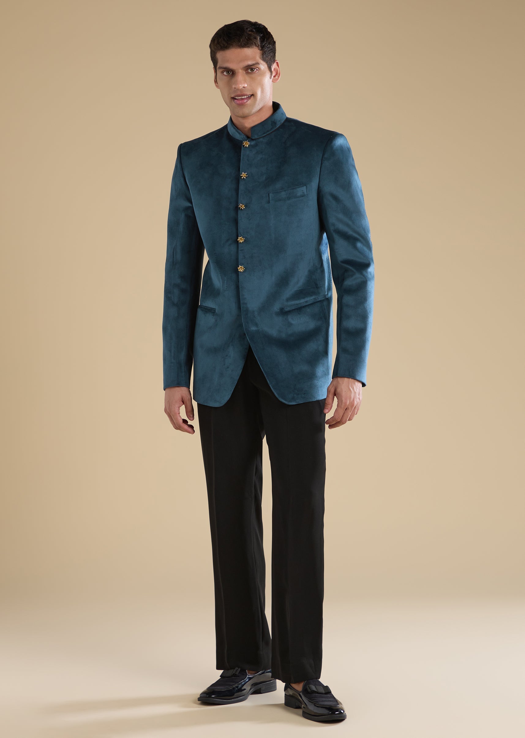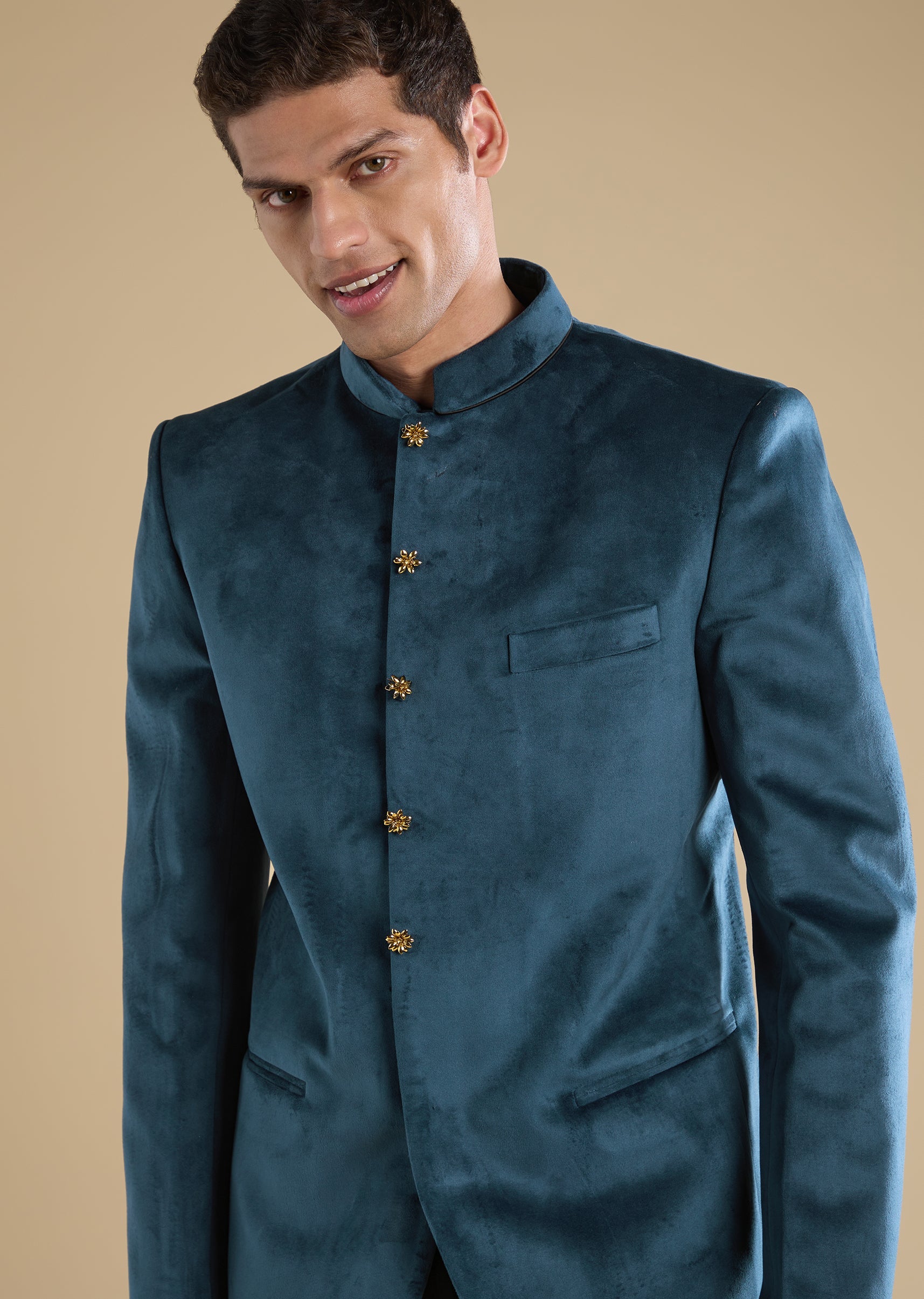 Crafted in luxe suede fabric, this teal tuxedo set offers a sleek, contemporary appeal. Featuring a mandarin collar, full sleeves and front button and hook-eye closure, it is paired with... More Product Details