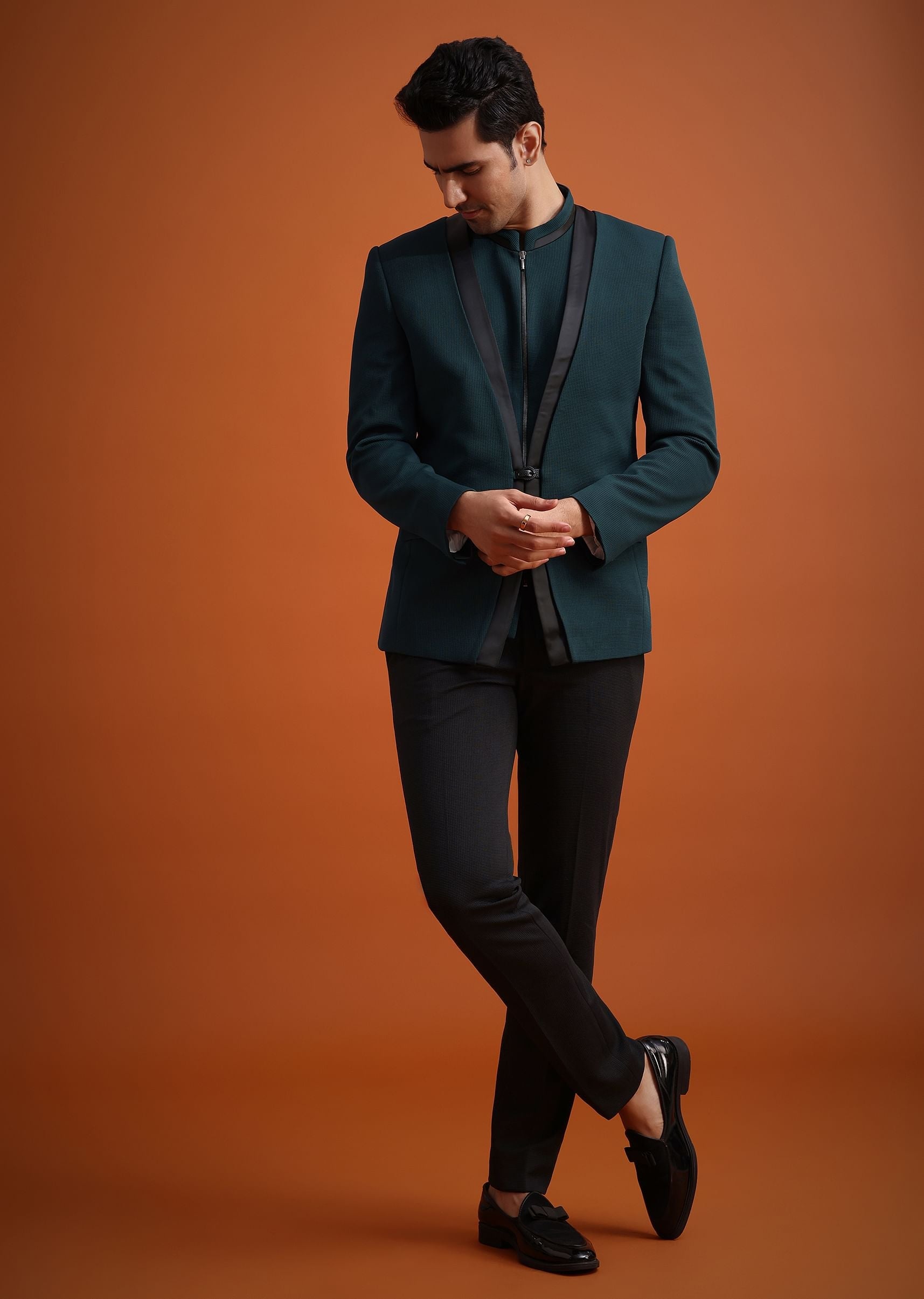 Exude sophistication and charm by stepping out in this jewel tone teal tuxedo set. Crafted with front buttons and a contrast panel collar this sleek design is tailored from rich... More Product Details