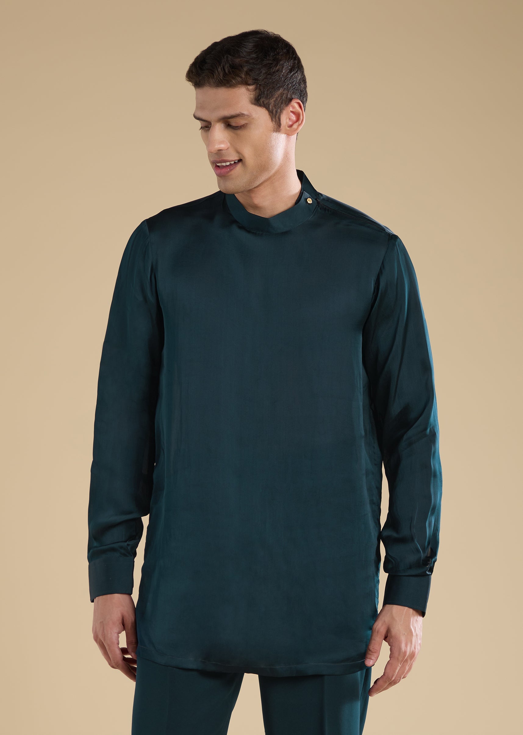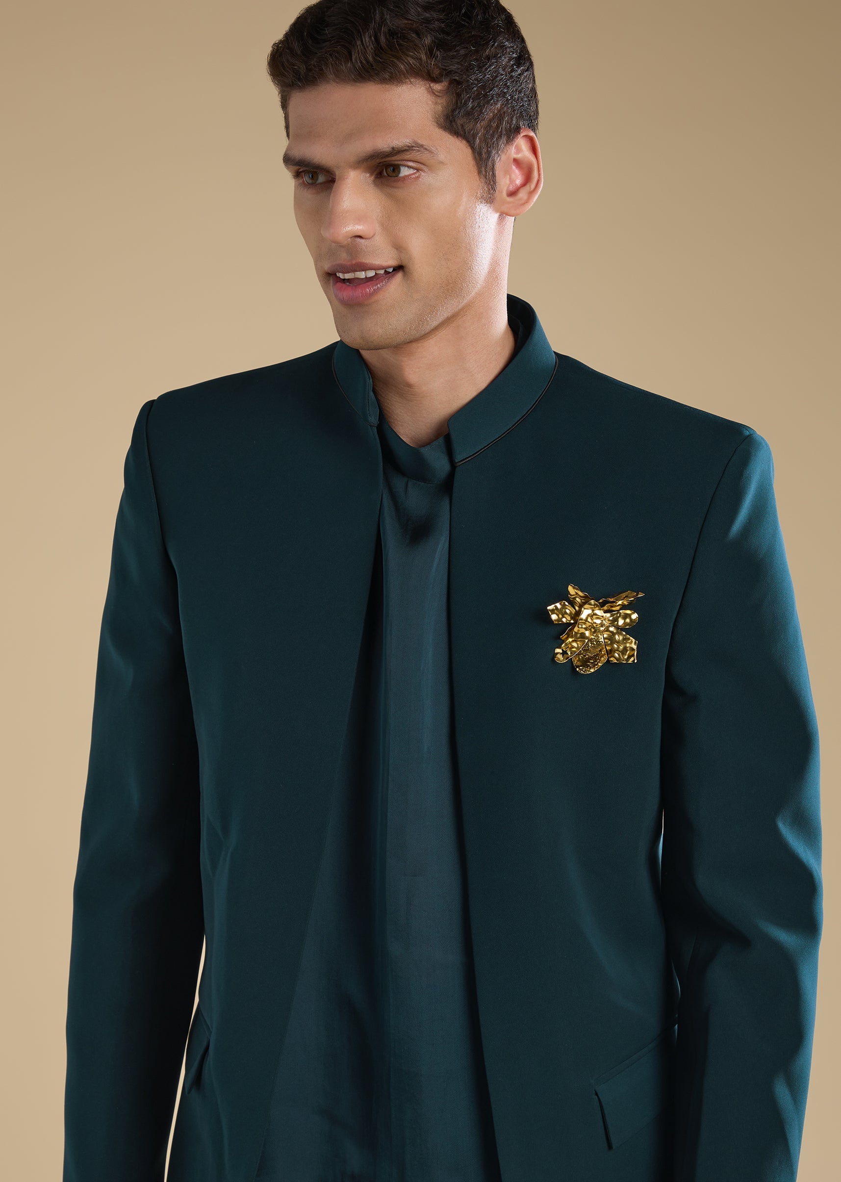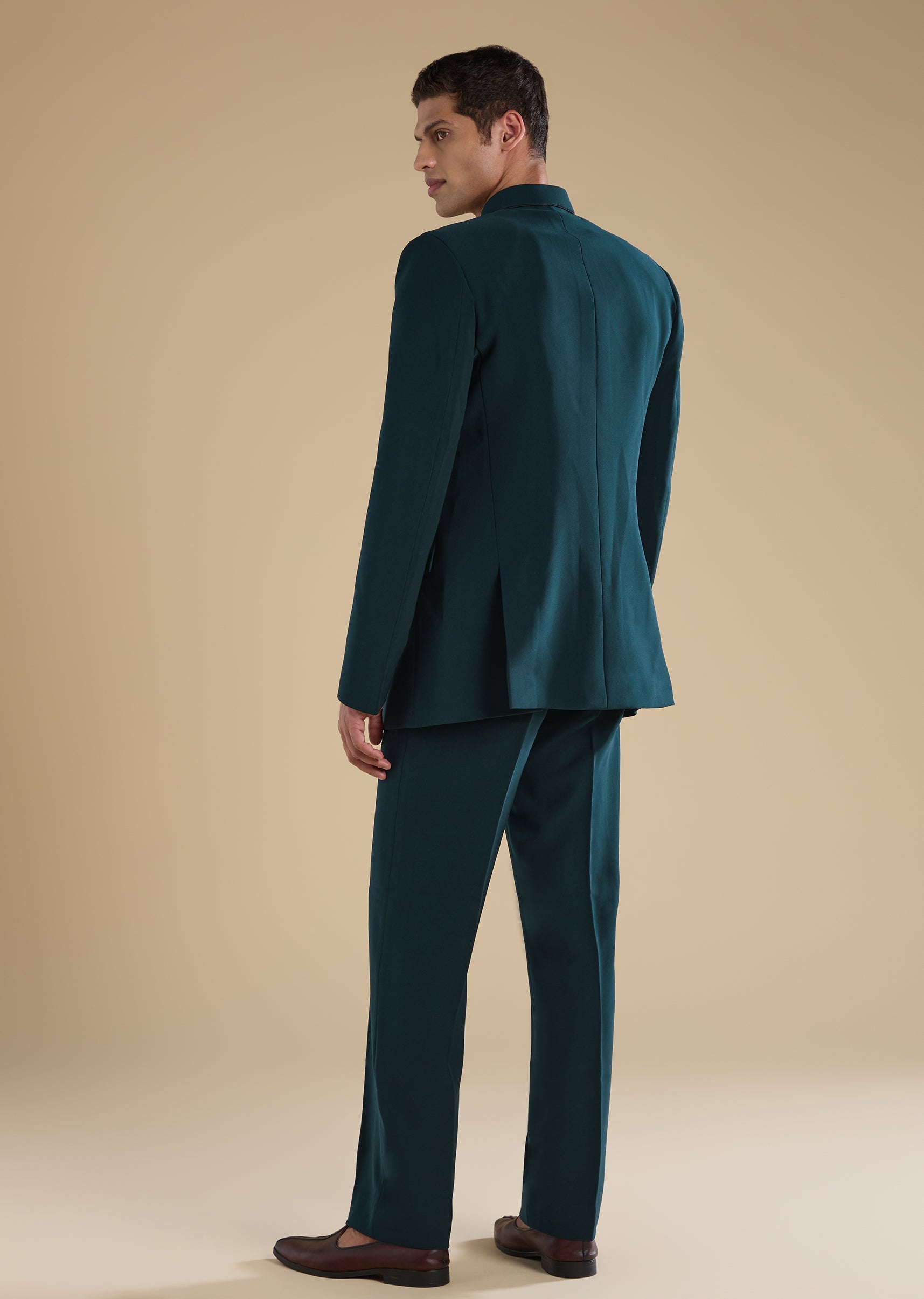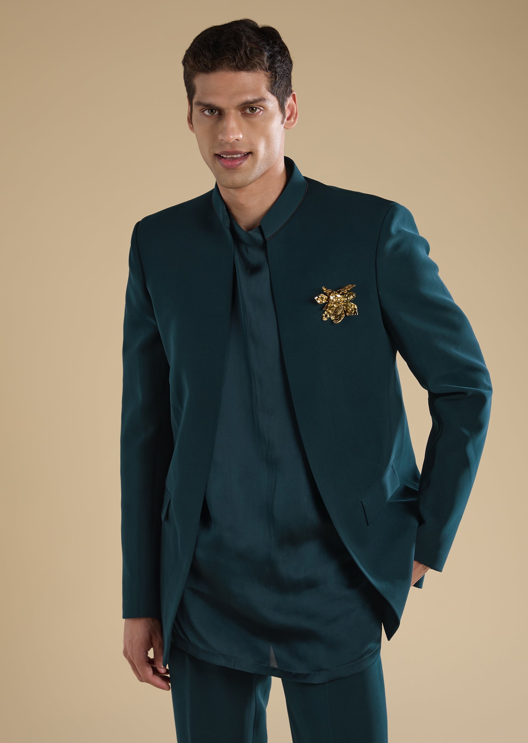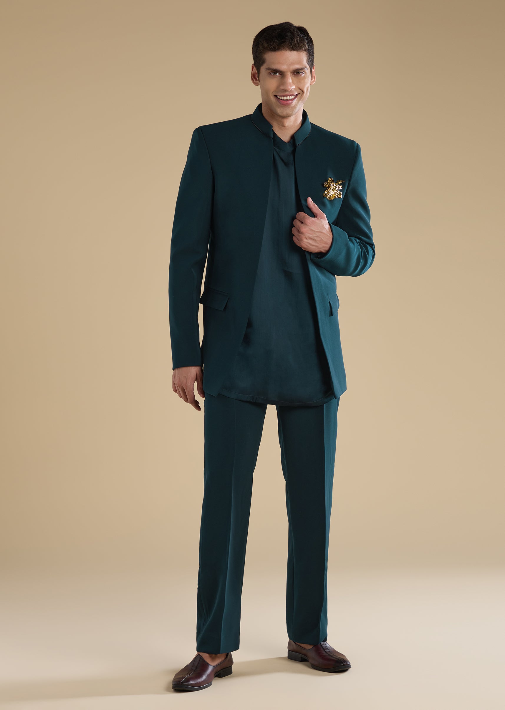Crafted in suiting fabric, this teal tuxedo set features subtle metallic detailing for a modern edge. Designed with a mandarin collar and full sleeves, it comes paired with a coordinated... More Product Details