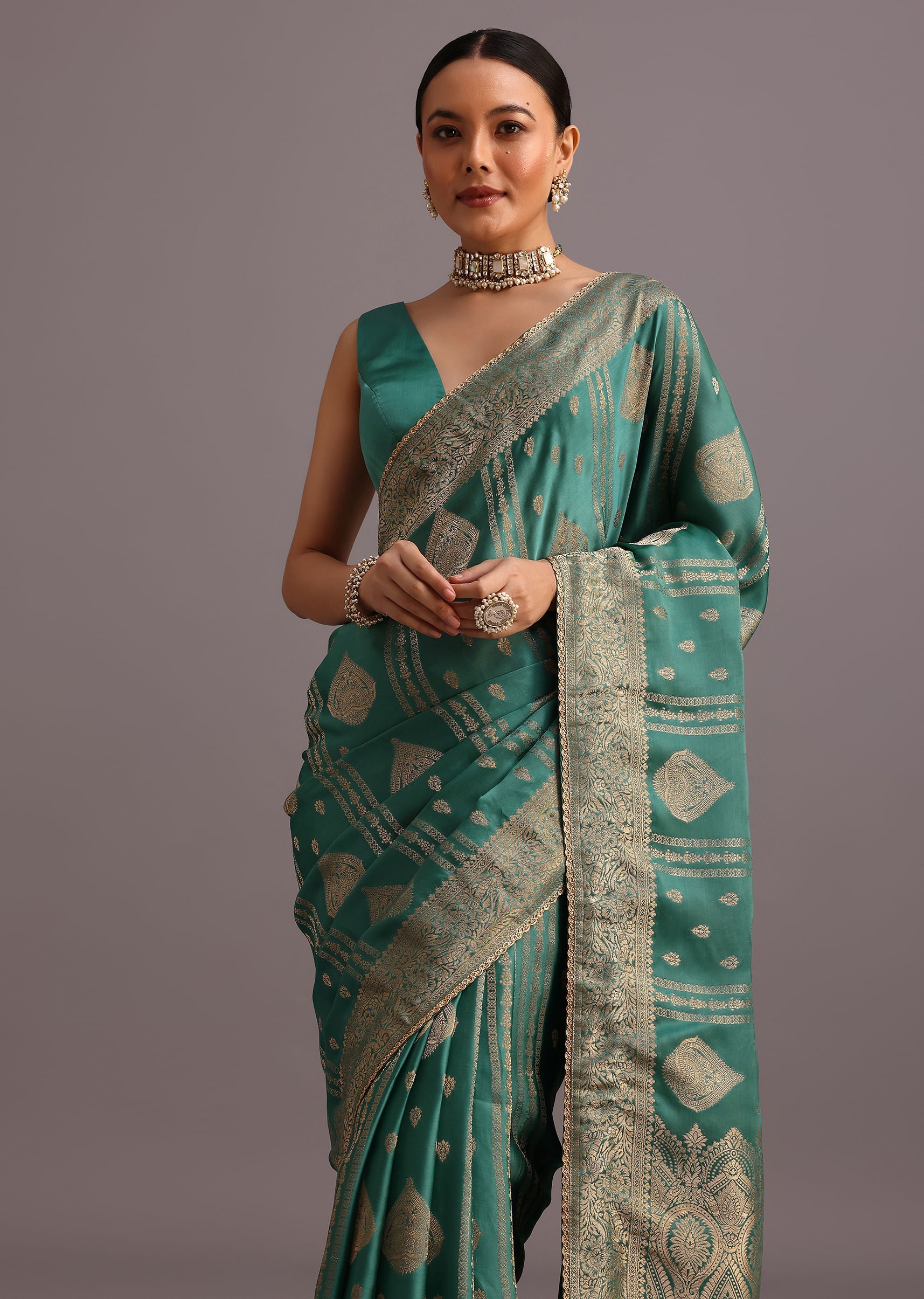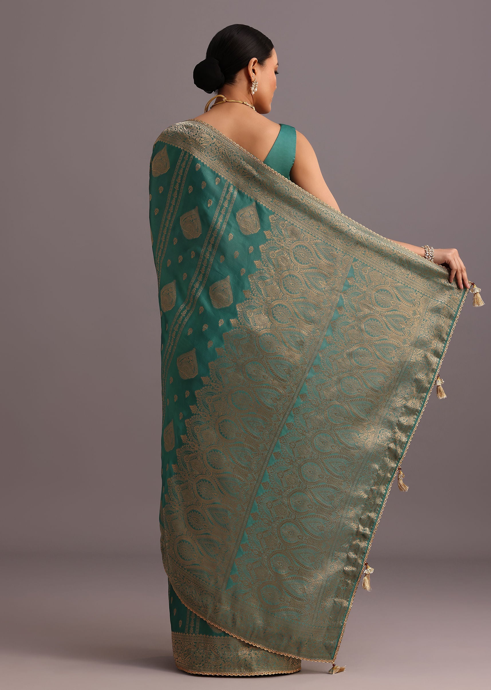 Teal Zari Work Satin Silk Woven Saree And Brocade Border