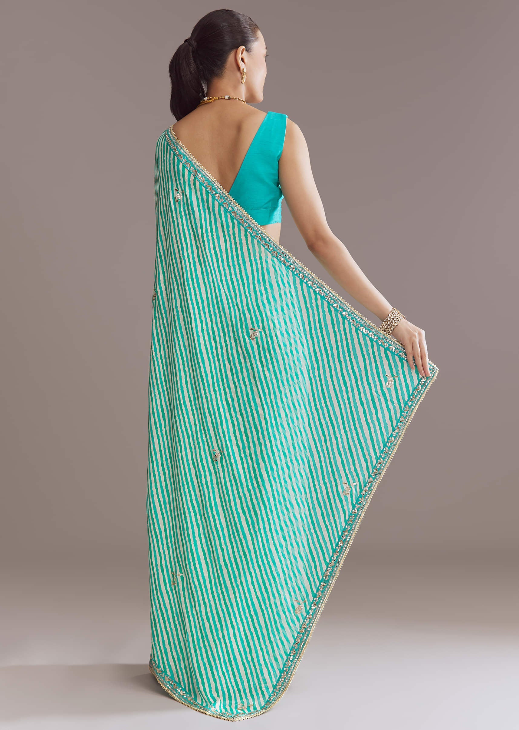 Turquoise Blue Chinon Saree With Leheriya And Gota Work