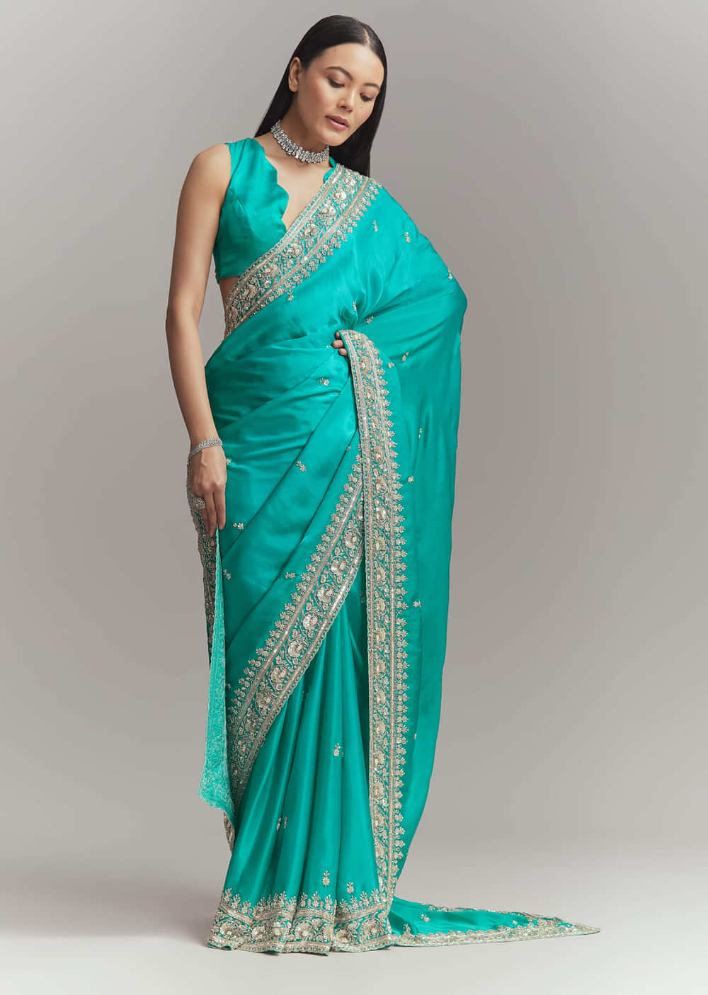 Vivid tones speak volumes, and this turquoise blue satin embroidered saree sets a celebratory mood. Small buttis flow across the fabric with a detailed zardosi and cutdana border finished with... More Product Details
