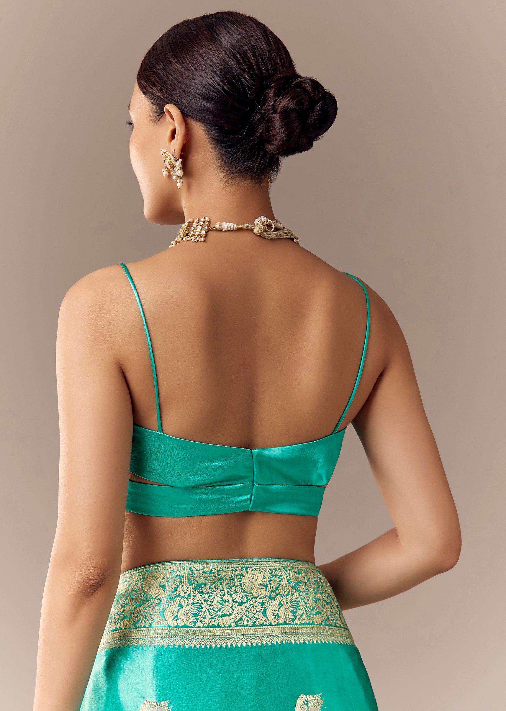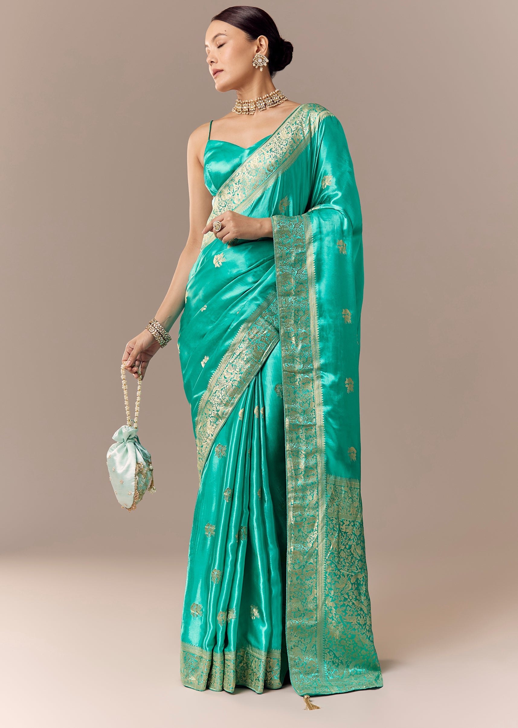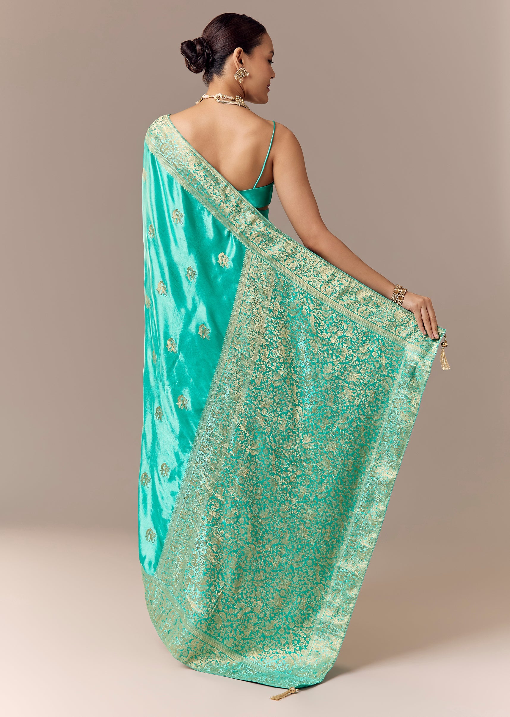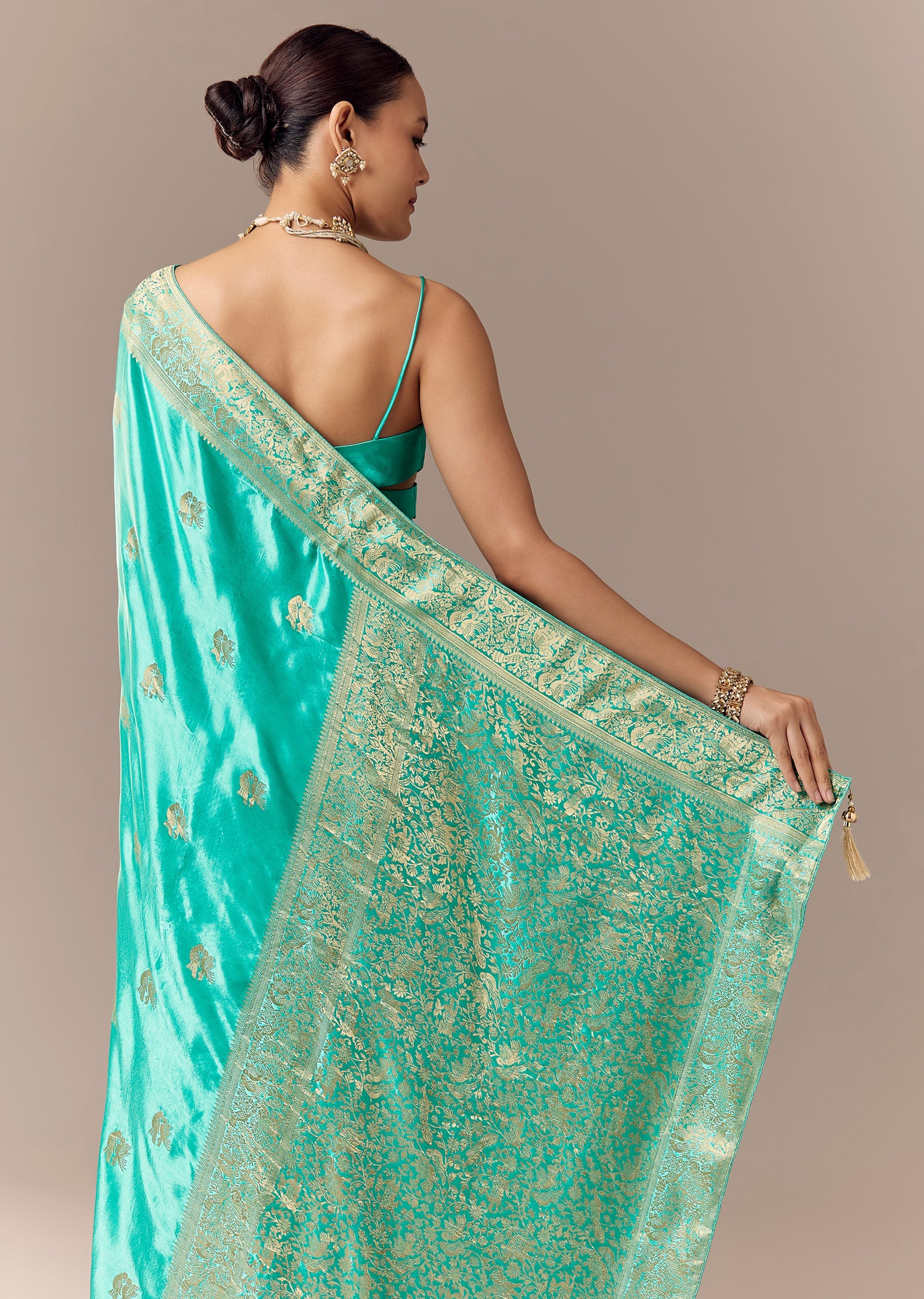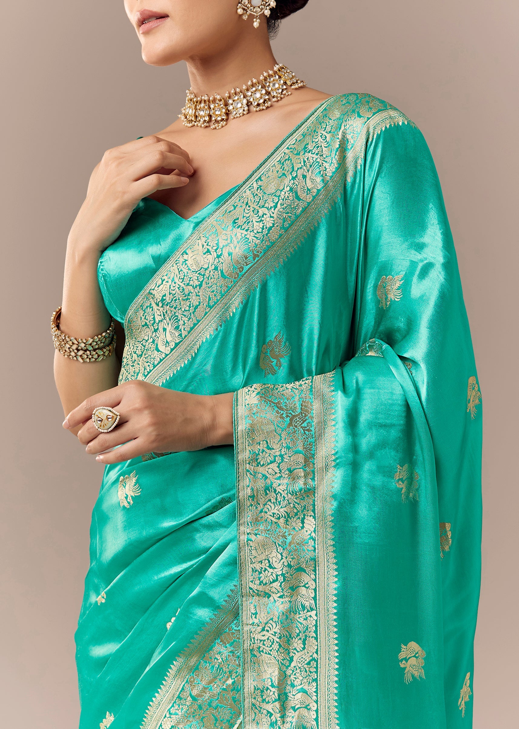 A turquoise satin silk saree with heavy zari woven butti and border, highlighted with bird motifs across the saree and pallu—paired with unstitched blouse fabric for traditional styling. Awarded as the Most Trusted Brand, we're delivering styles you love, just as promised.