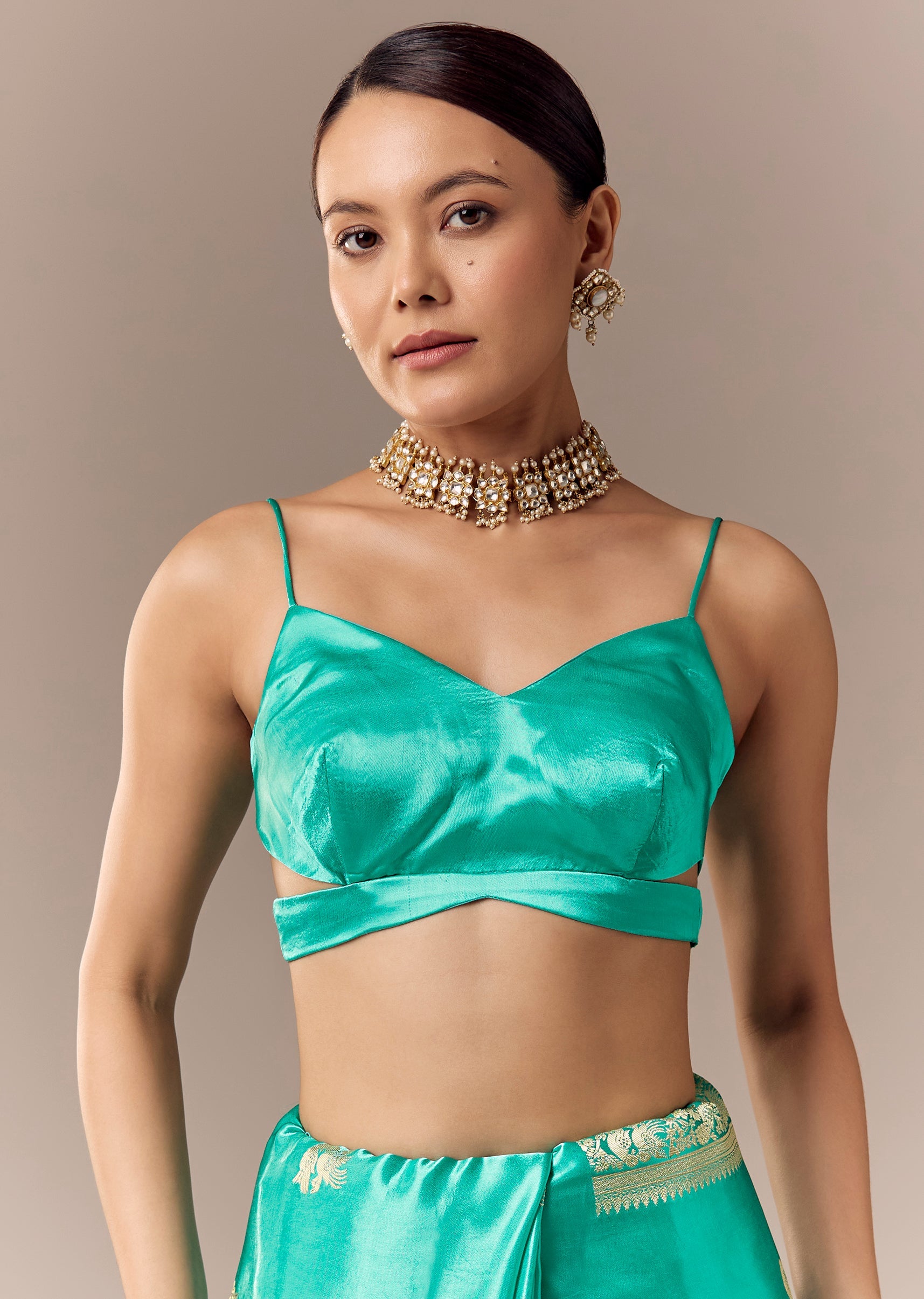 A turquoise satin silk saree with heavy zari woven butti and border, highlighted with bird motifs across the saree and pallu—paired with unstitched blouse fabric for traditional styling. Awarded as... More Product Details