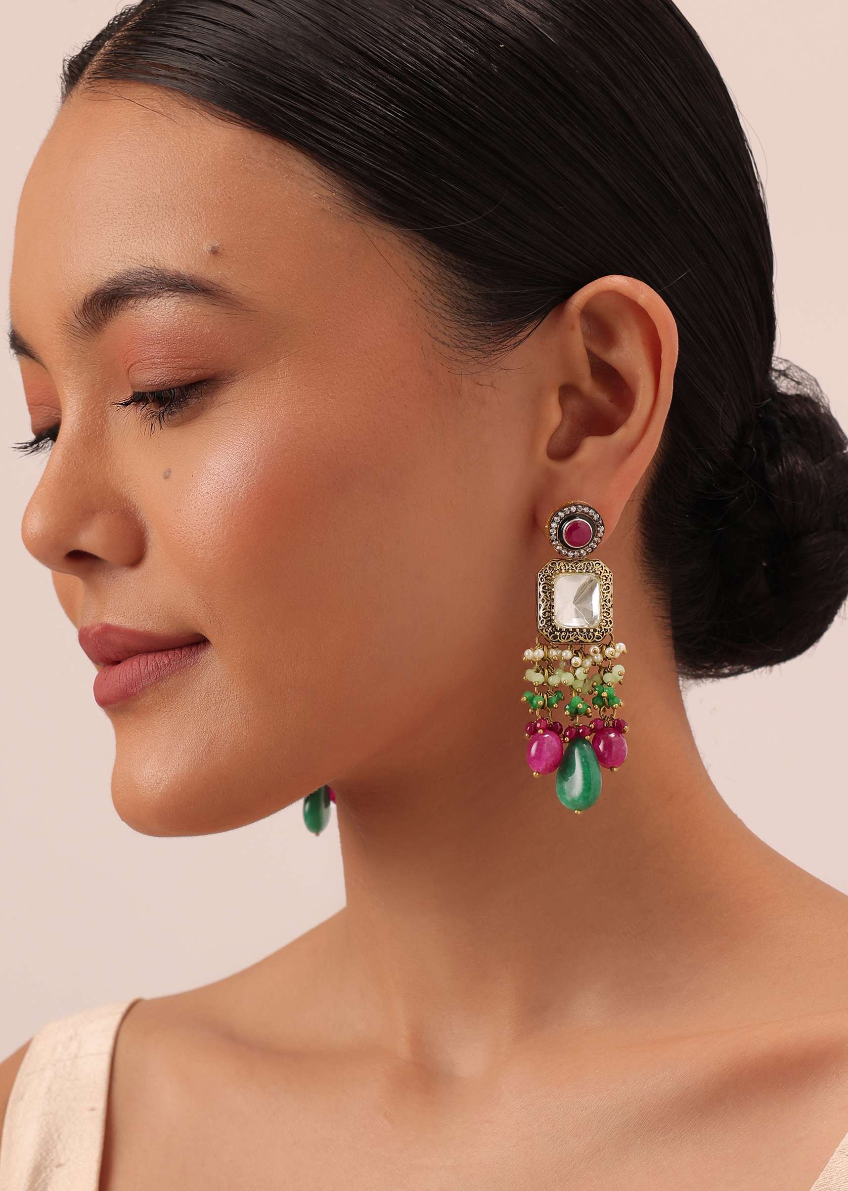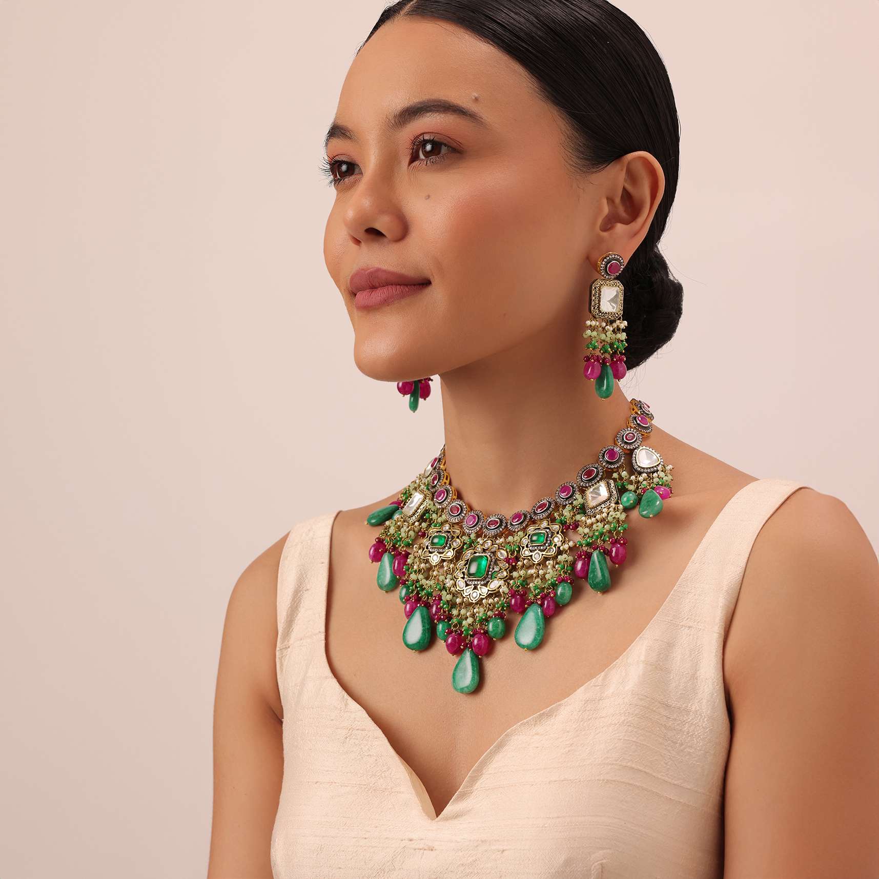 Two Tone Finish Kundan Necklace Set With Meenakari And Green Stone Drops