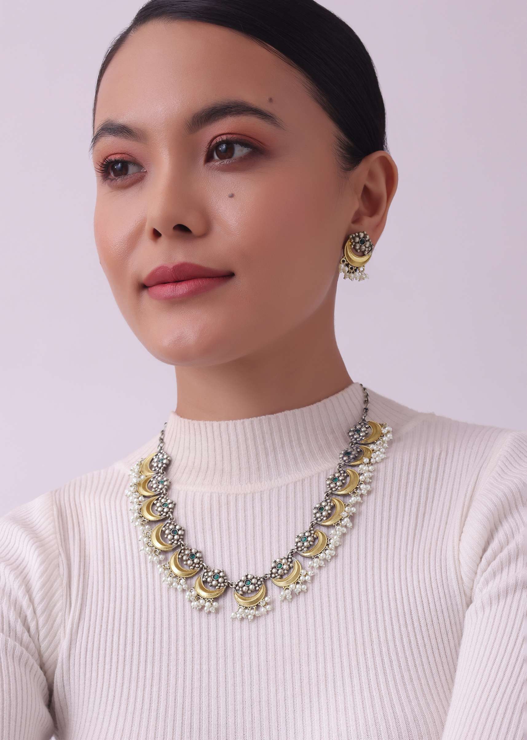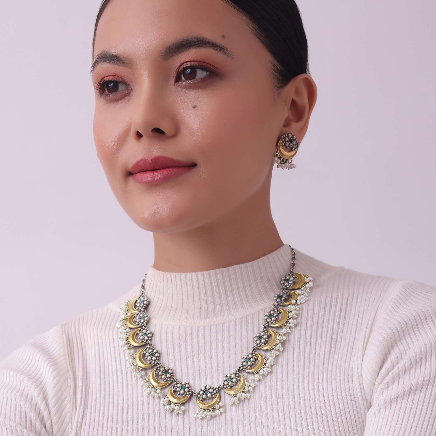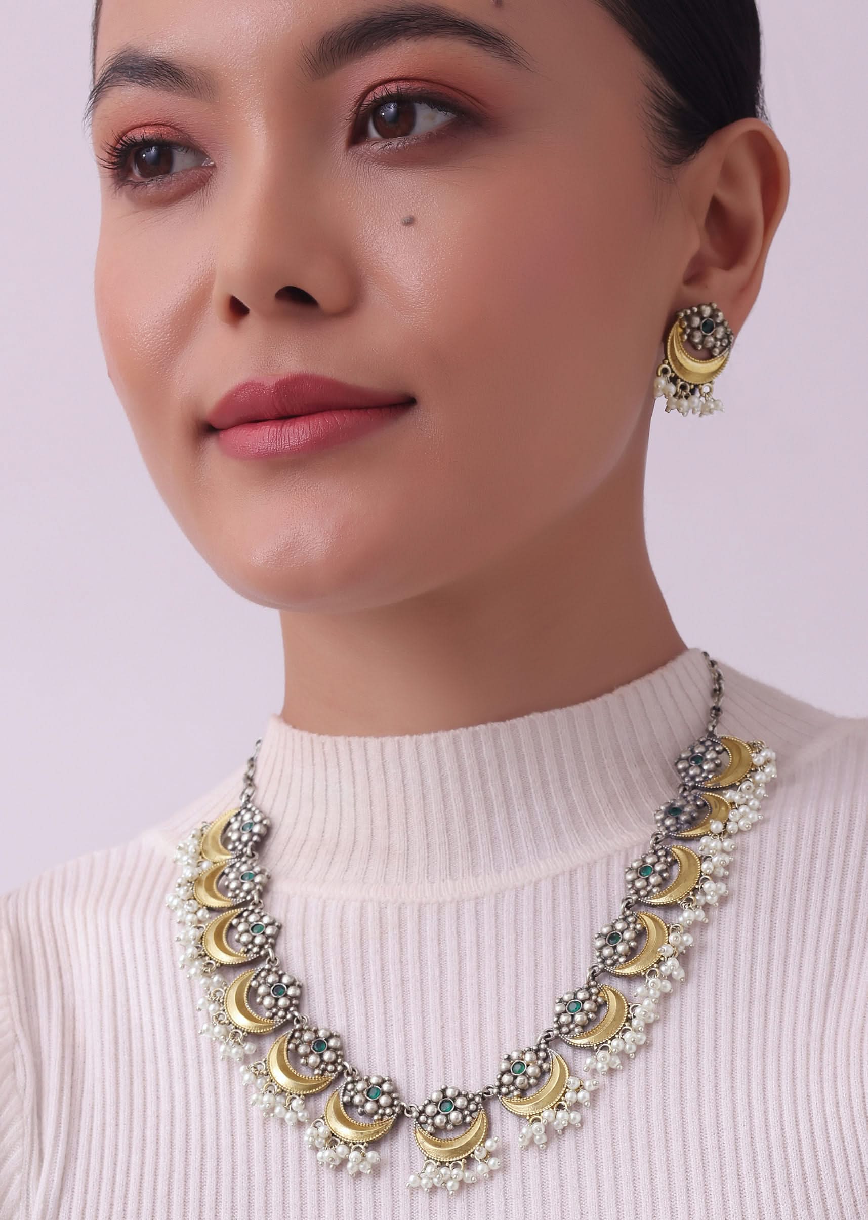 Two Tone Oxidised Necklace And Earrings Set With Pearls