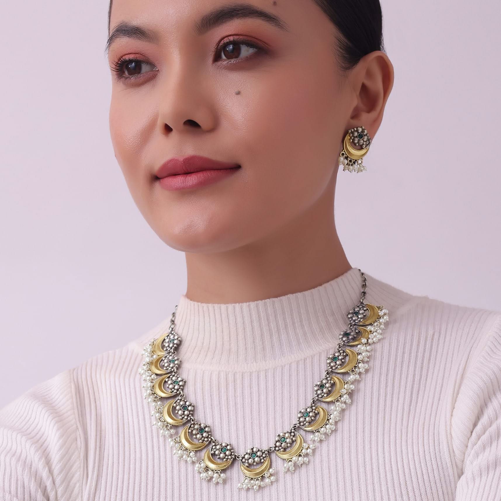 Indulge in the captivating allure of our oxidised short necklace and earring set. The two-tone finish adorned with lustrous pearls adds a touch of elegance and sophistication. EVENT - Whether you're attending a special occasion or looking to elevate your everyday style this necklace and earring set is a perfect choice for those seeking a luxurious accessory.Store in a dust bag. Keep away from moisture perfume alcohol and harsh chemicals. Spot clean only. Keep away from sharp objects. Actual color may slightly vary due to photographic lighting sources and device screen settings. Awarded as the Most Trusted Brand, we're delivering styles you love, just as promised.