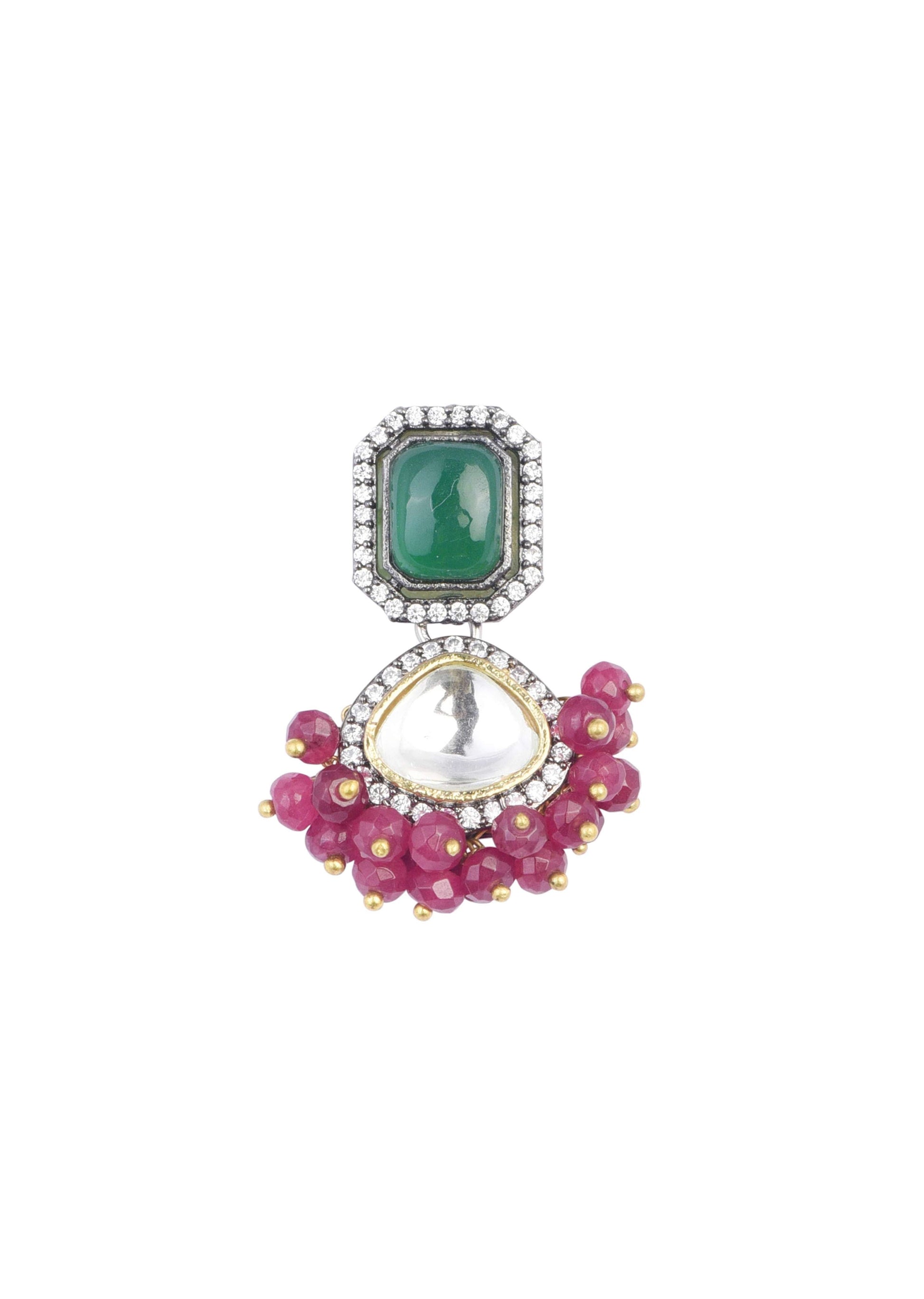 Showcasing our opulent necklace set, that boasts of exquisite artistry. Featuring multi-color stones set in a mix metal base, it displays captivating geometric motifs and a cluster of multi-color bead... More Product Details