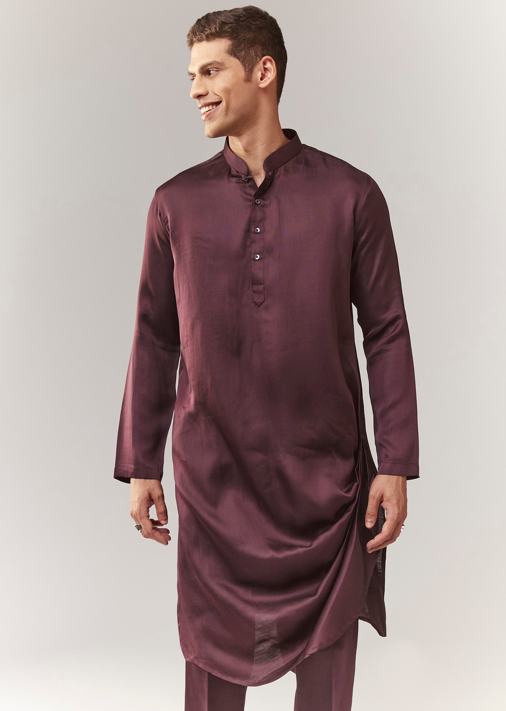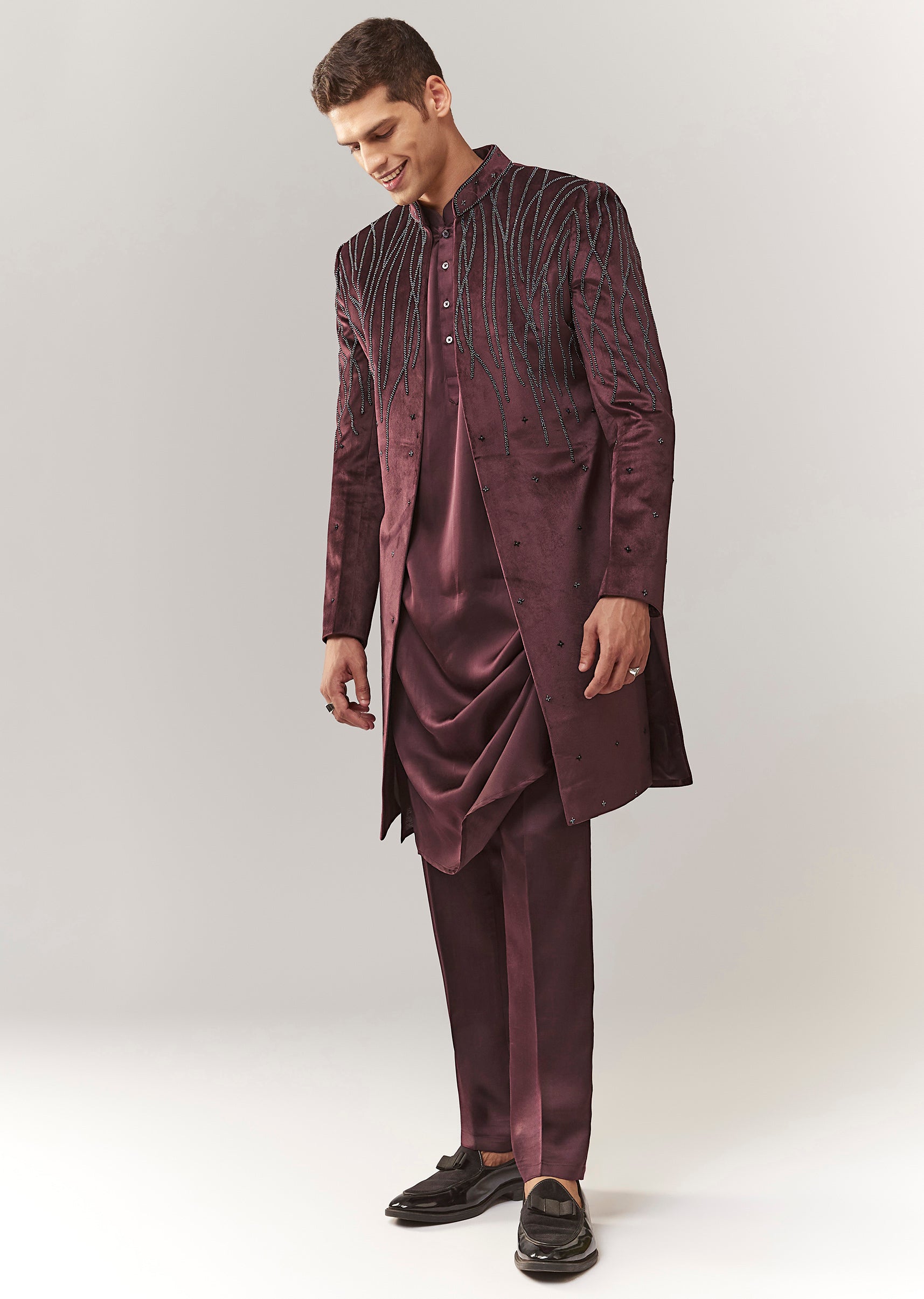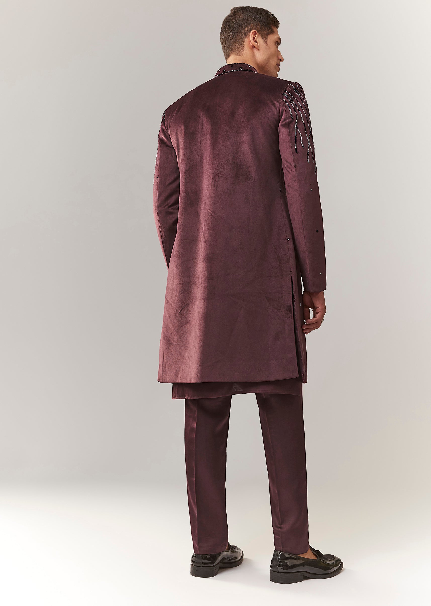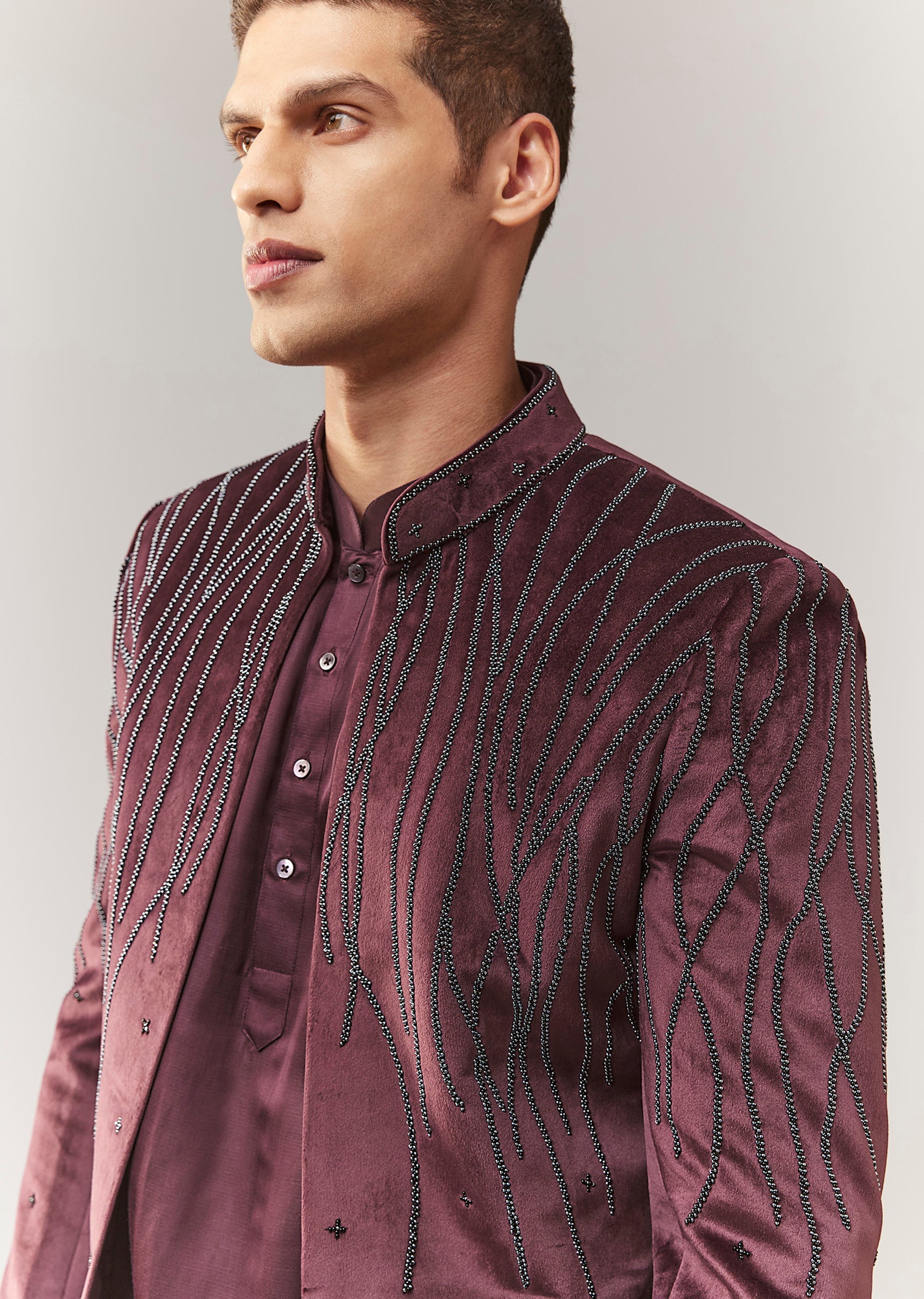 A rich velvet indo-western set in wine tones with bead embellishment. Features a mandarin collar, full sleeves, and front button closure for a structured festive look. Comes with kurta/jacket styling... More Product Details