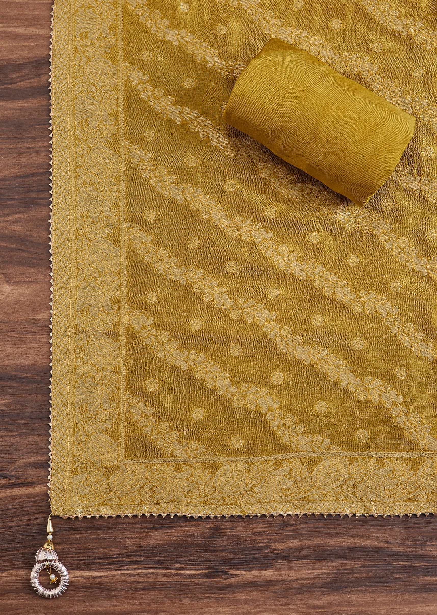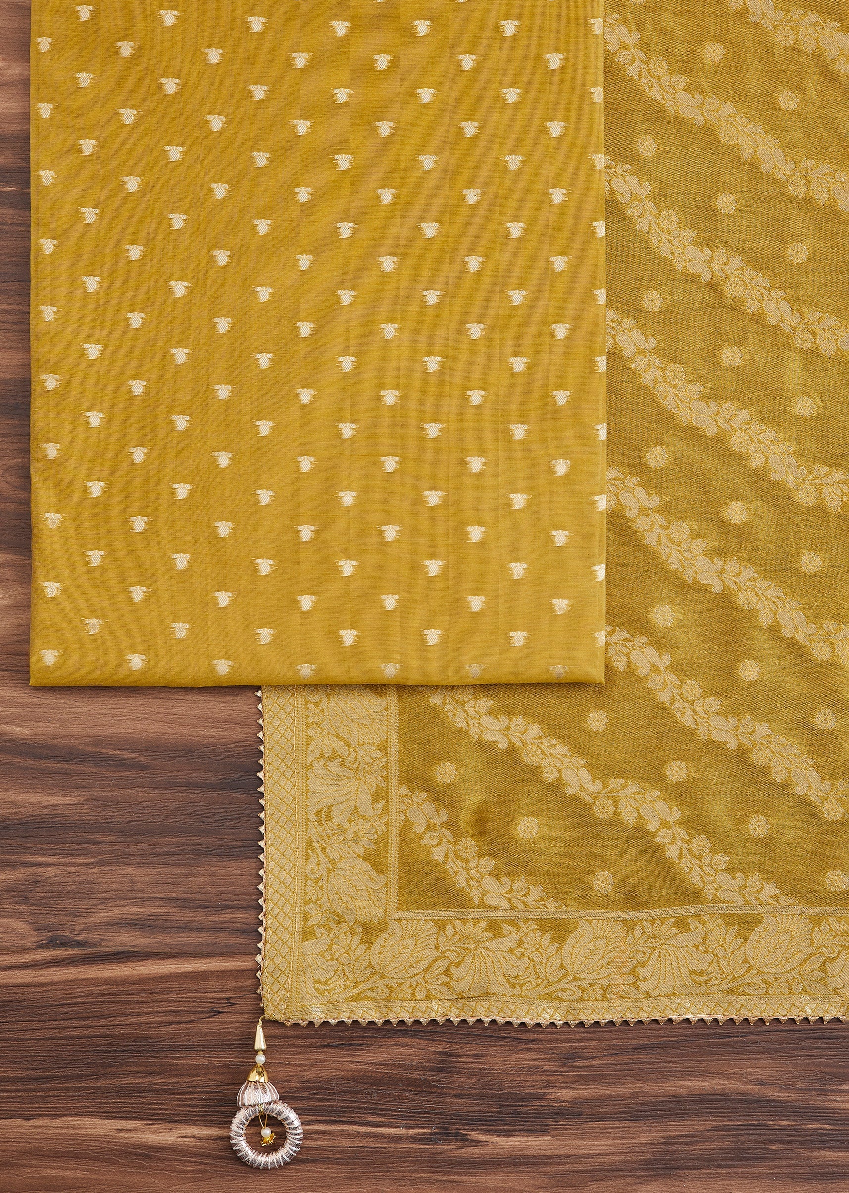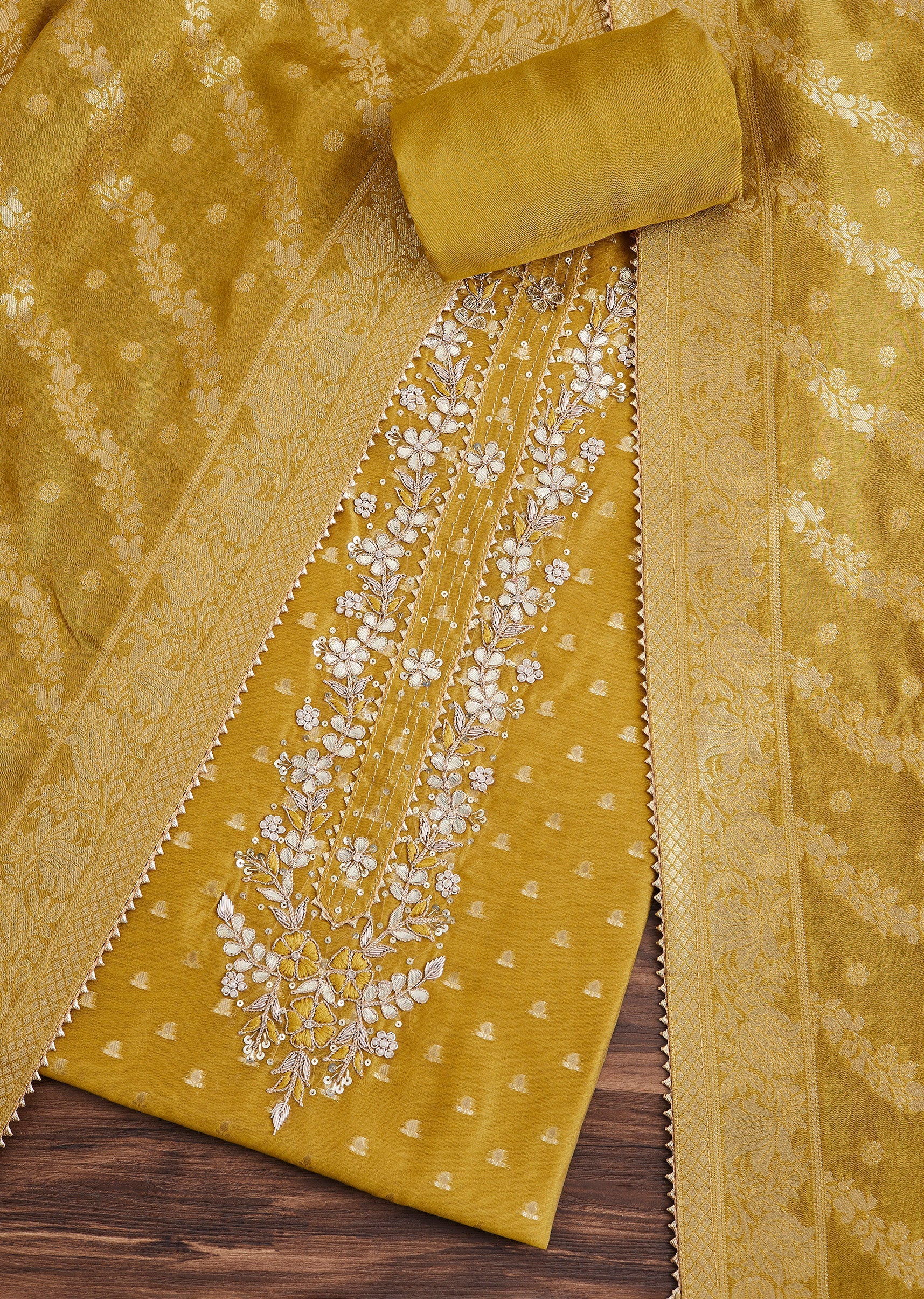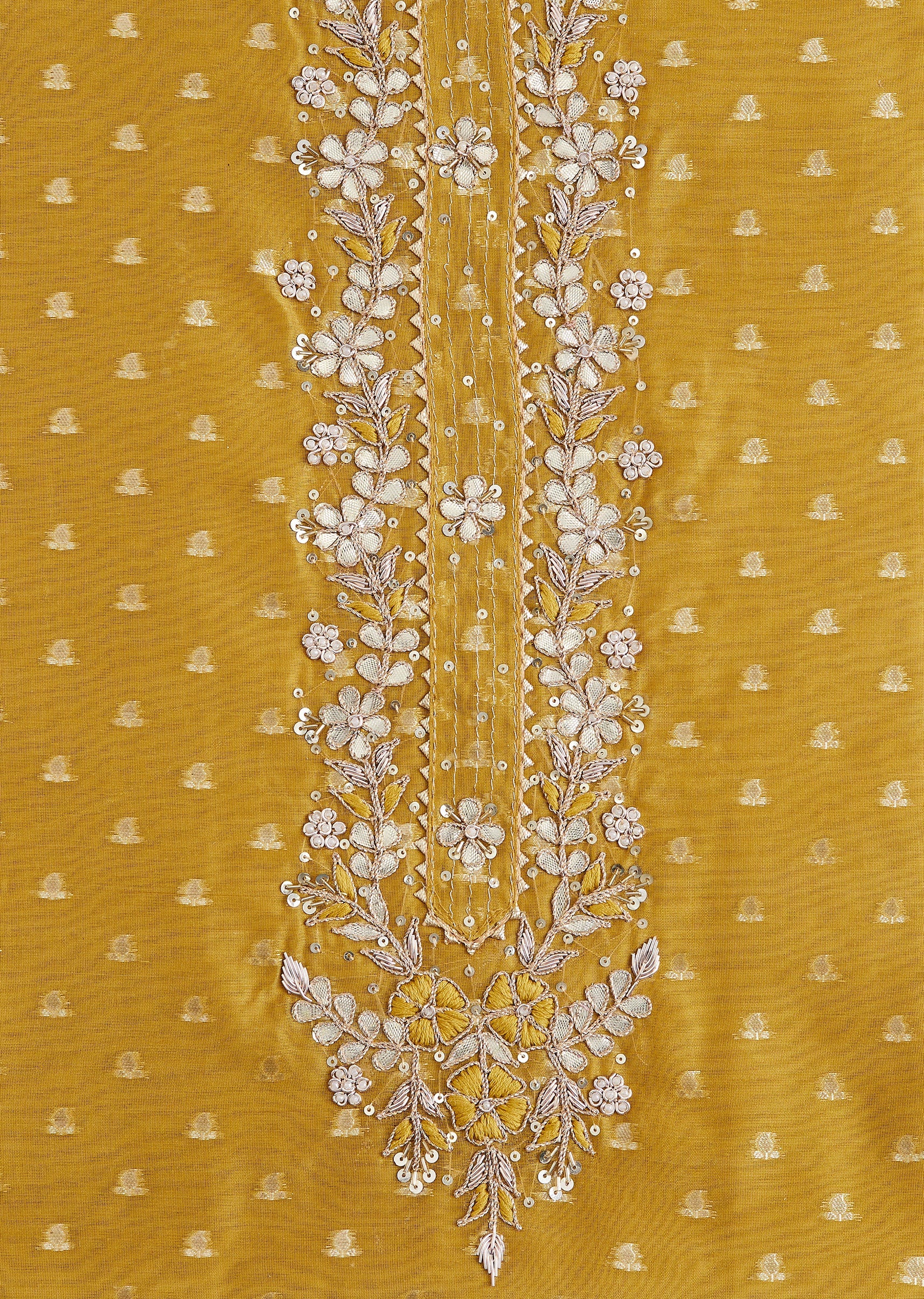 Designed in premium chanderi fabric, this mustard yellow unstitched suit set is enhanced with embroidery that lends richness to its bright tone. Includes matching bottom fabric and dupatta for a... More Product Details