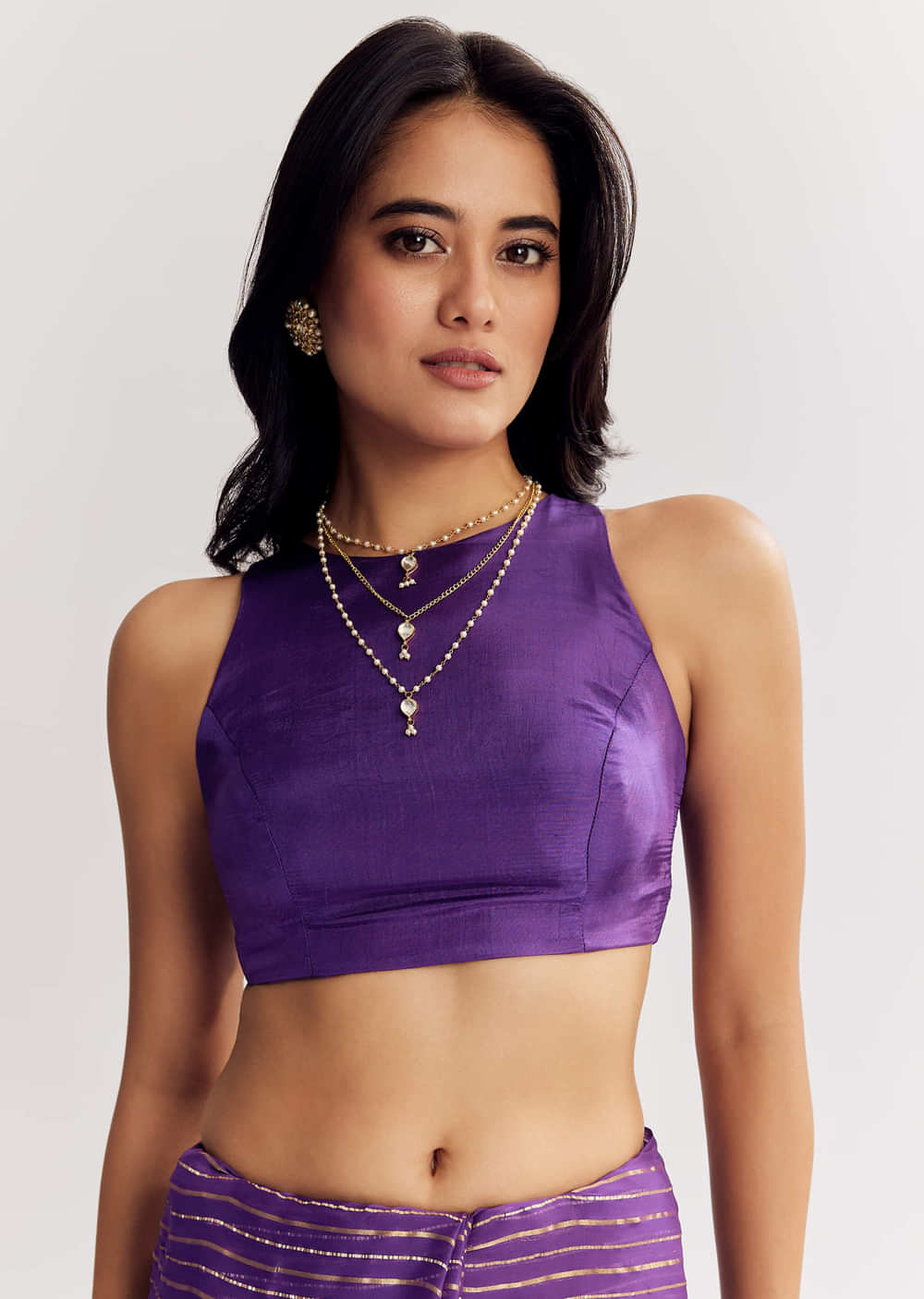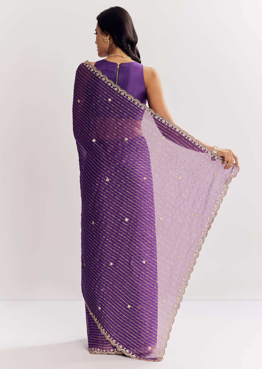 A magical violet georgette saree embellished with foil stripes and scallop border enriched with zari, mirror and gota patti embroidery. Awarded as the Most Trusted Brand, we're delivering styles you love, just as promised.