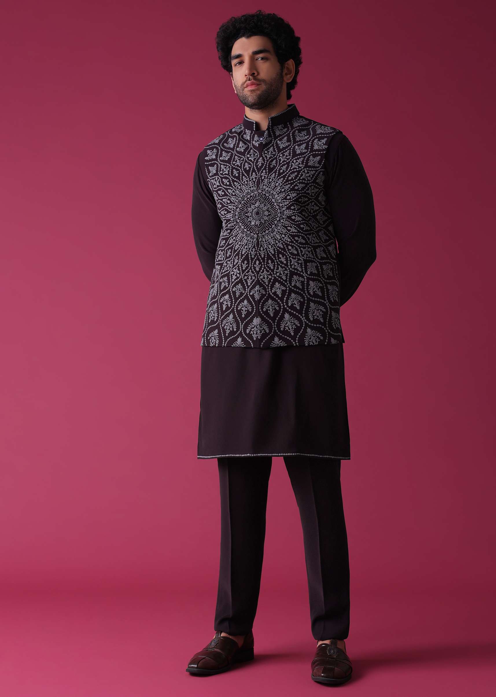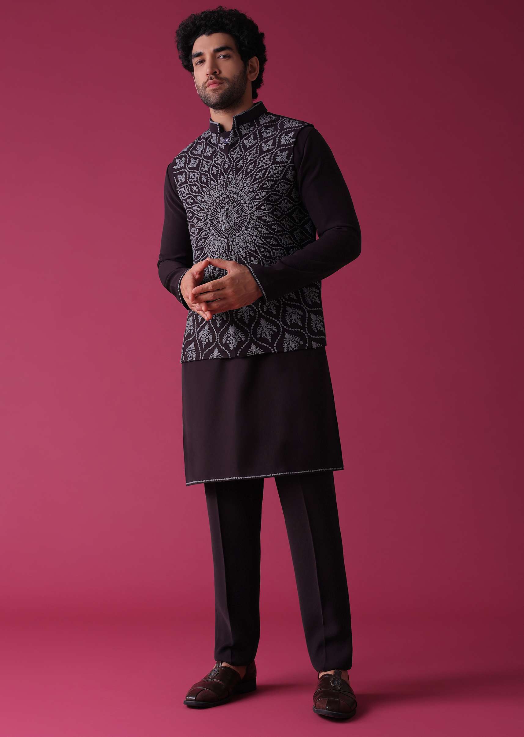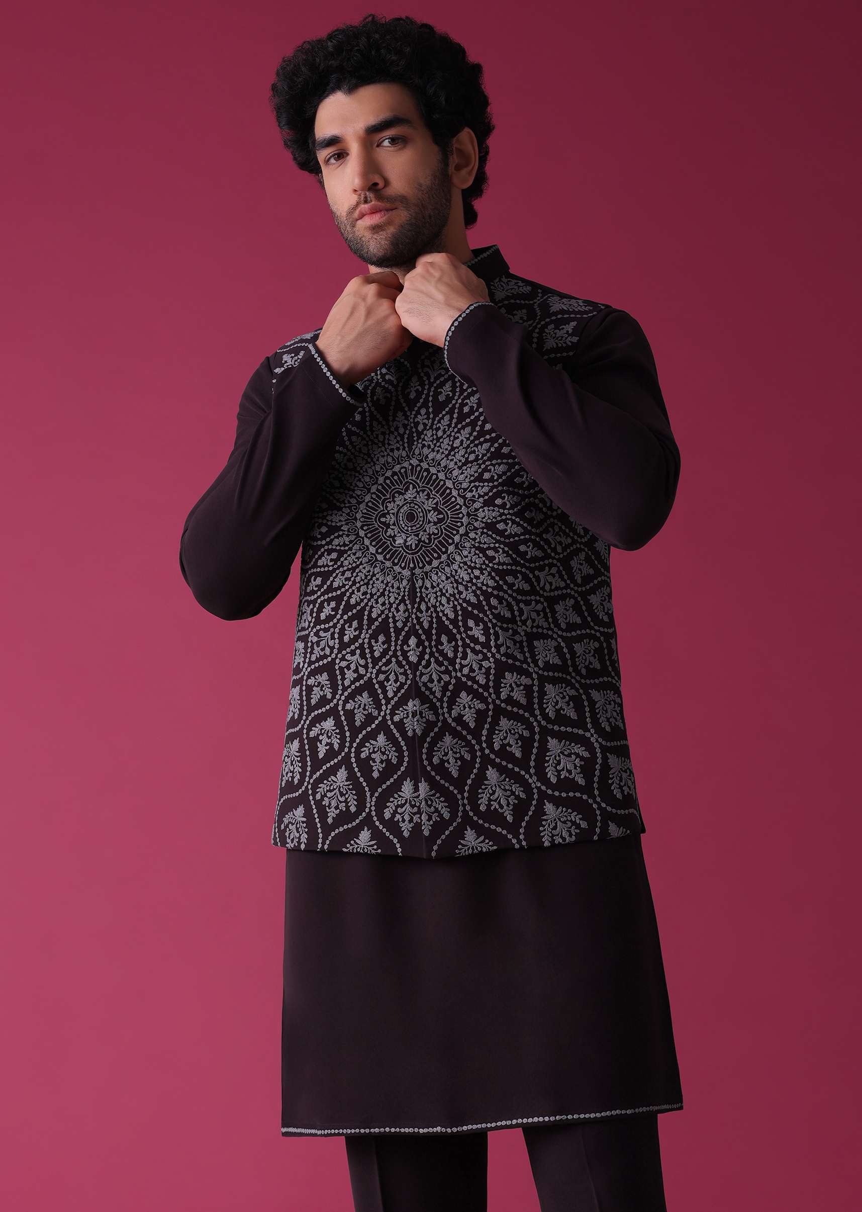 - The jacket, adorned with exquisite threadwork and a mandarin collar, is a stunning work of art.