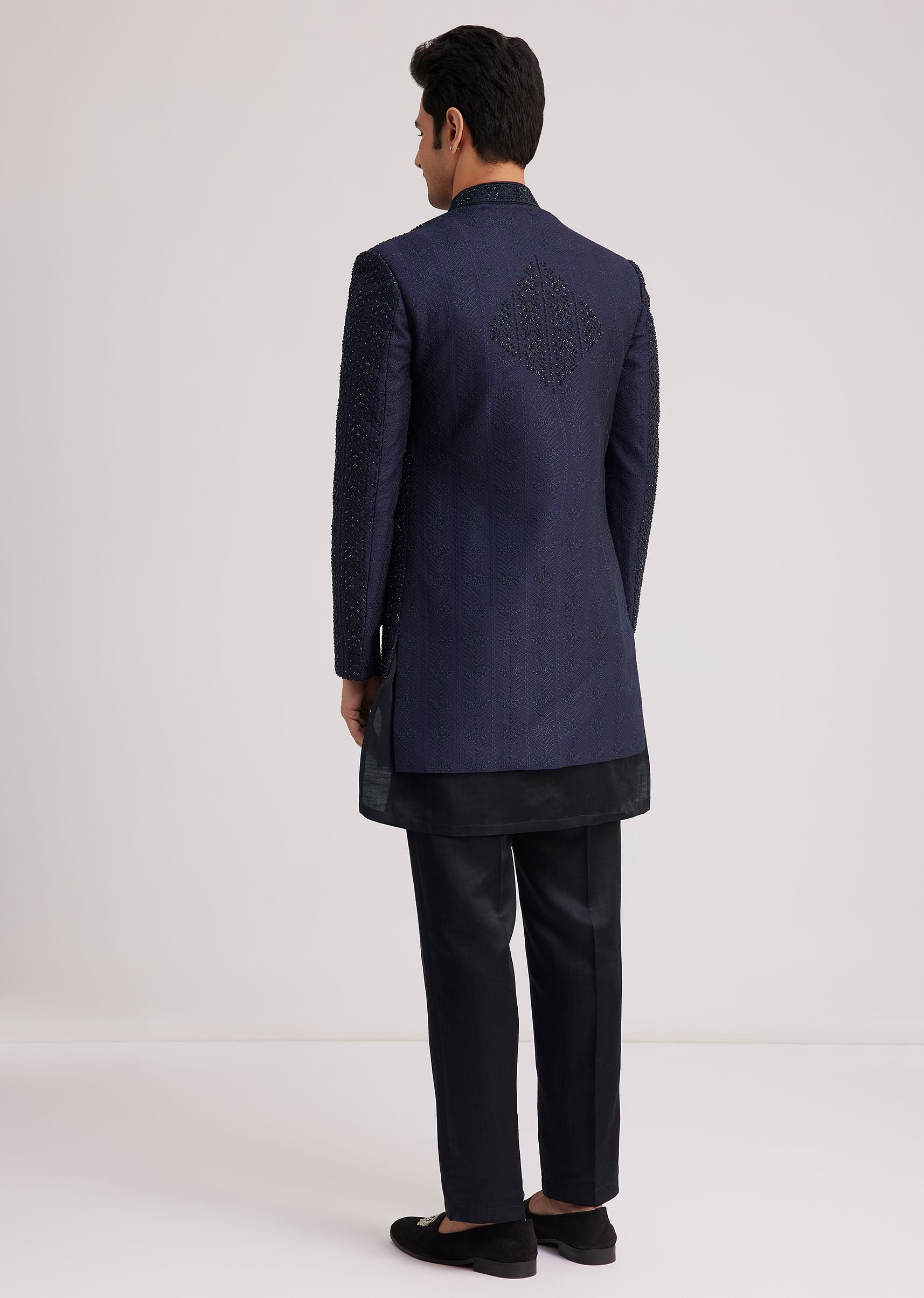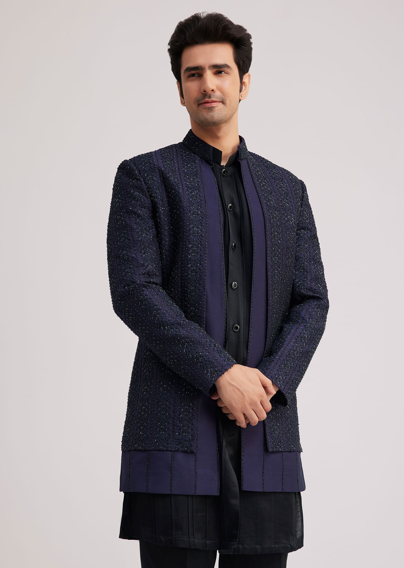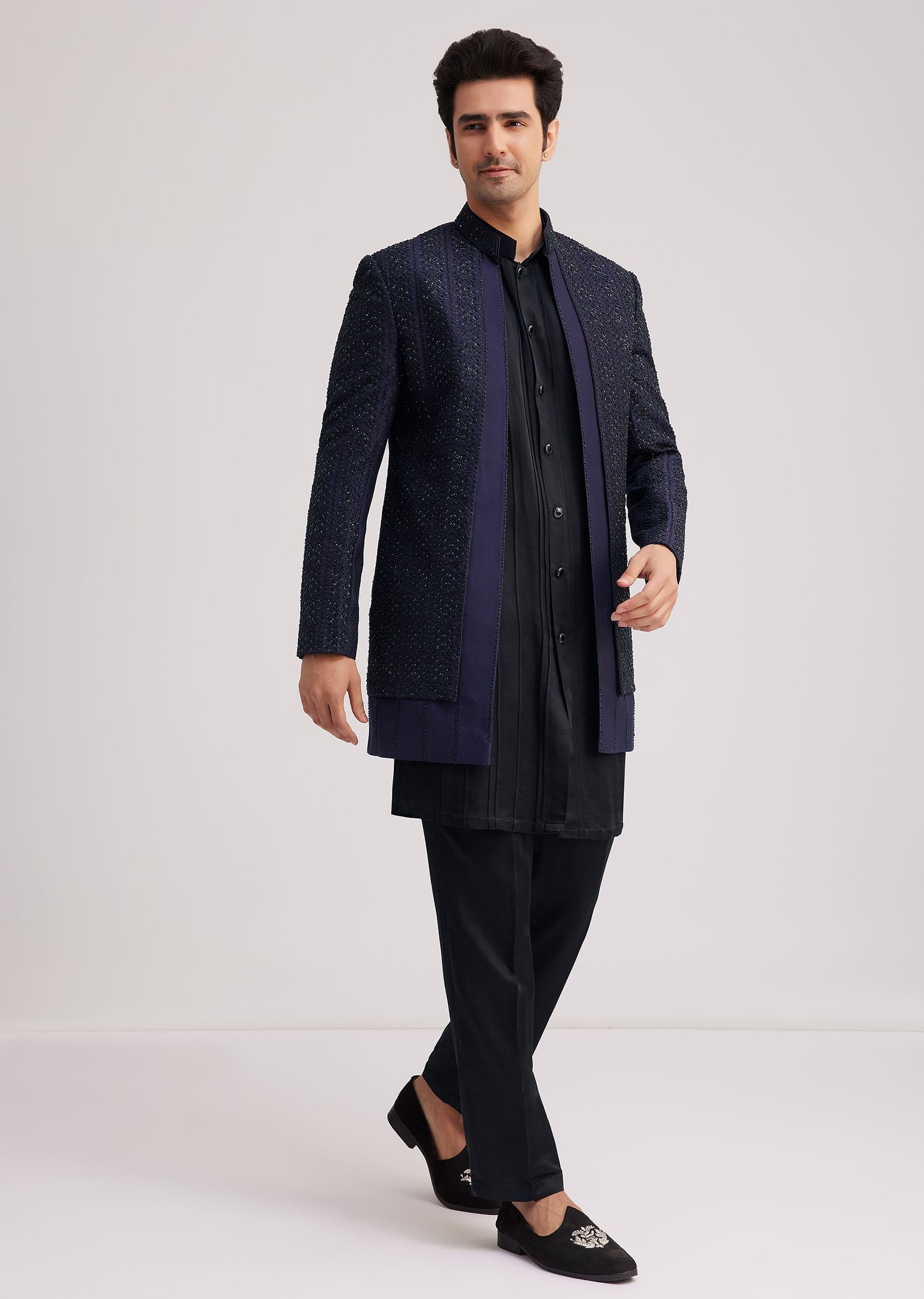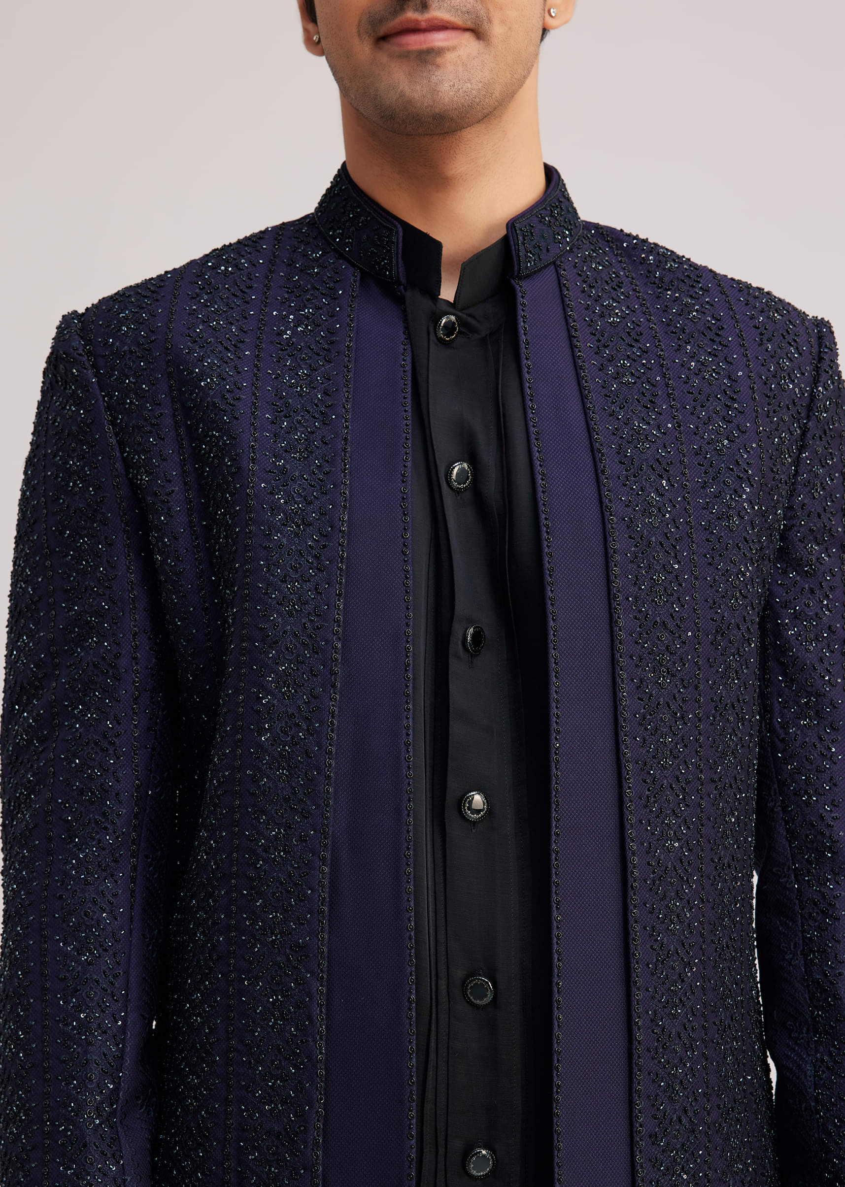 Exude Regal Sophistication With This Layered Violet Indo Jacket Set Featuring Intricate Sequin And Thread Work Detailing On The Front And Back Yoke. The Rich Silk Fabric Enhances Its Opulence While The Structured Yet Fluid Silhouette Adds A Contemporary Touch. Paired With A Sleek Kurta And Tailored Bottoms This Ensemble Creates A Striking Presence. Perfect For Grand Celebrations And Evening Festivities.Awarded As The Most Trusted Brand We'Re Delivering Styles You Love Just As Promised.