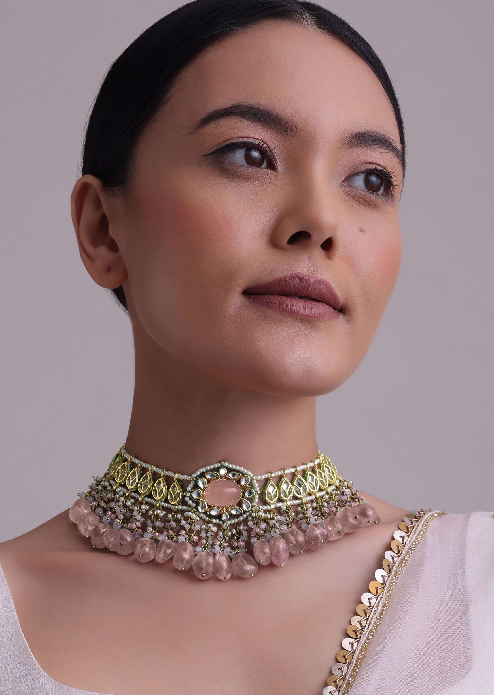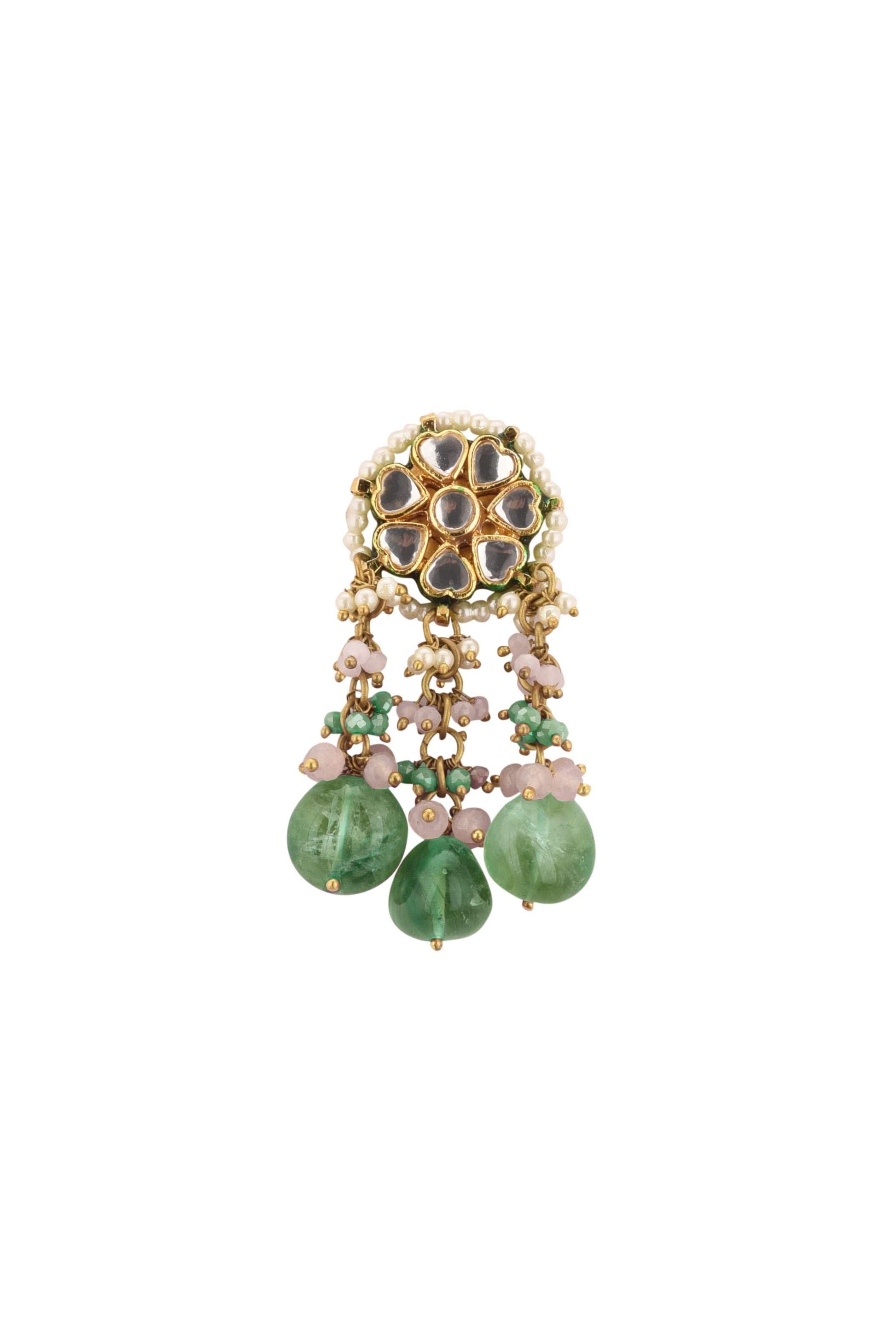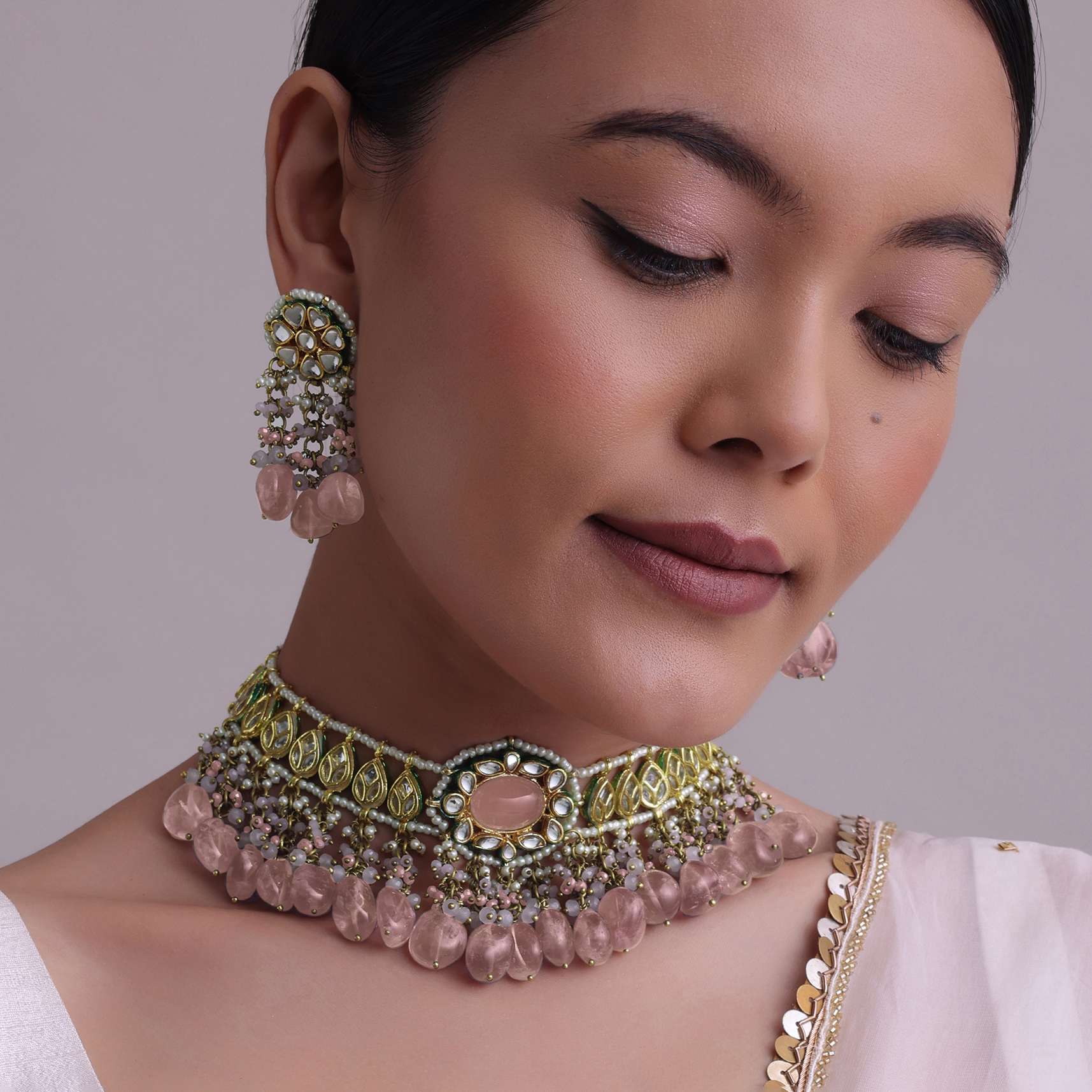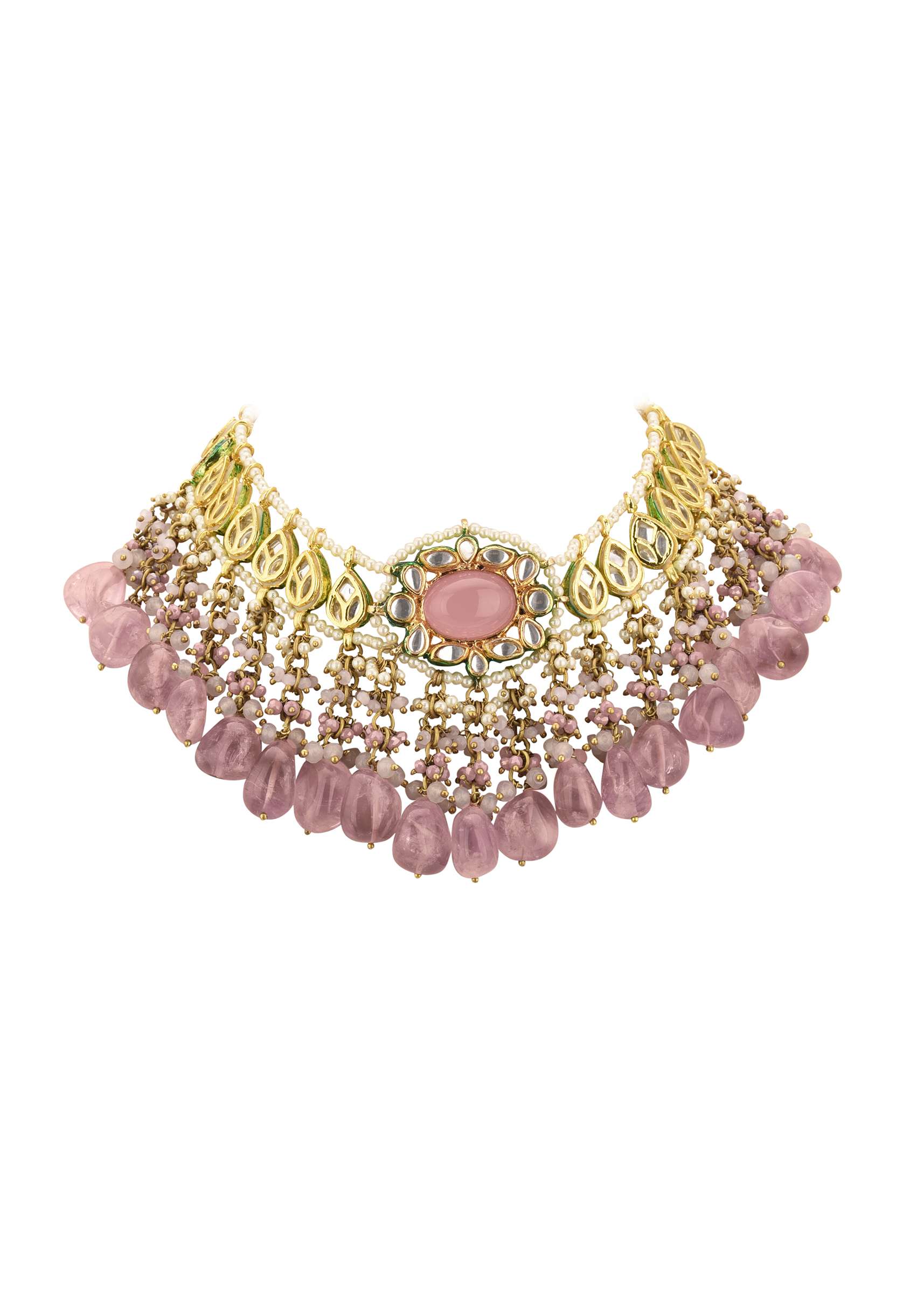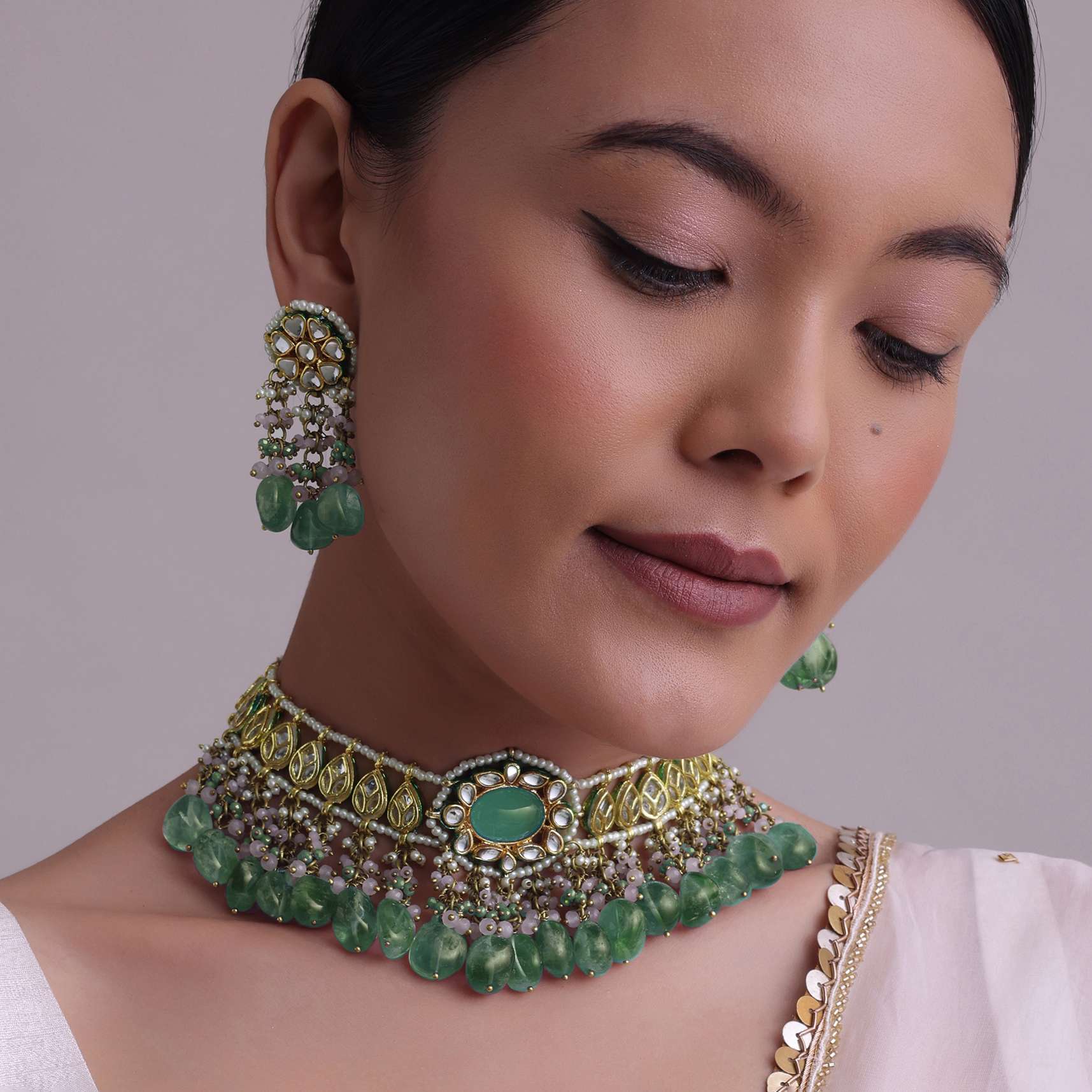 Introducing our green-toned choker necklace and earring set.Made from mixed metal and coated with a gold finish, this set boasts intricate kundan work and vibrant meenakari work. EVENT - Perfect for adding a touch of elegance and sophistication to any formal occasion.Avoid contact with water, chemicals, harsh liquids, perfumes, etc.Do not wear this piece of jewelry while showering, gymming, swimming, etc.Hard contact must be avoided completely.Please keep the product away from moisture and humidity when not in use.Baroque pearls and Natural stones can range from minor aberrations to distinctly ovoid, curved, pinched, or lumpy shapes.Slight variations in design may vary. Awarded as the Most Trusted Brand, we're delivering styles you love, just as promised.