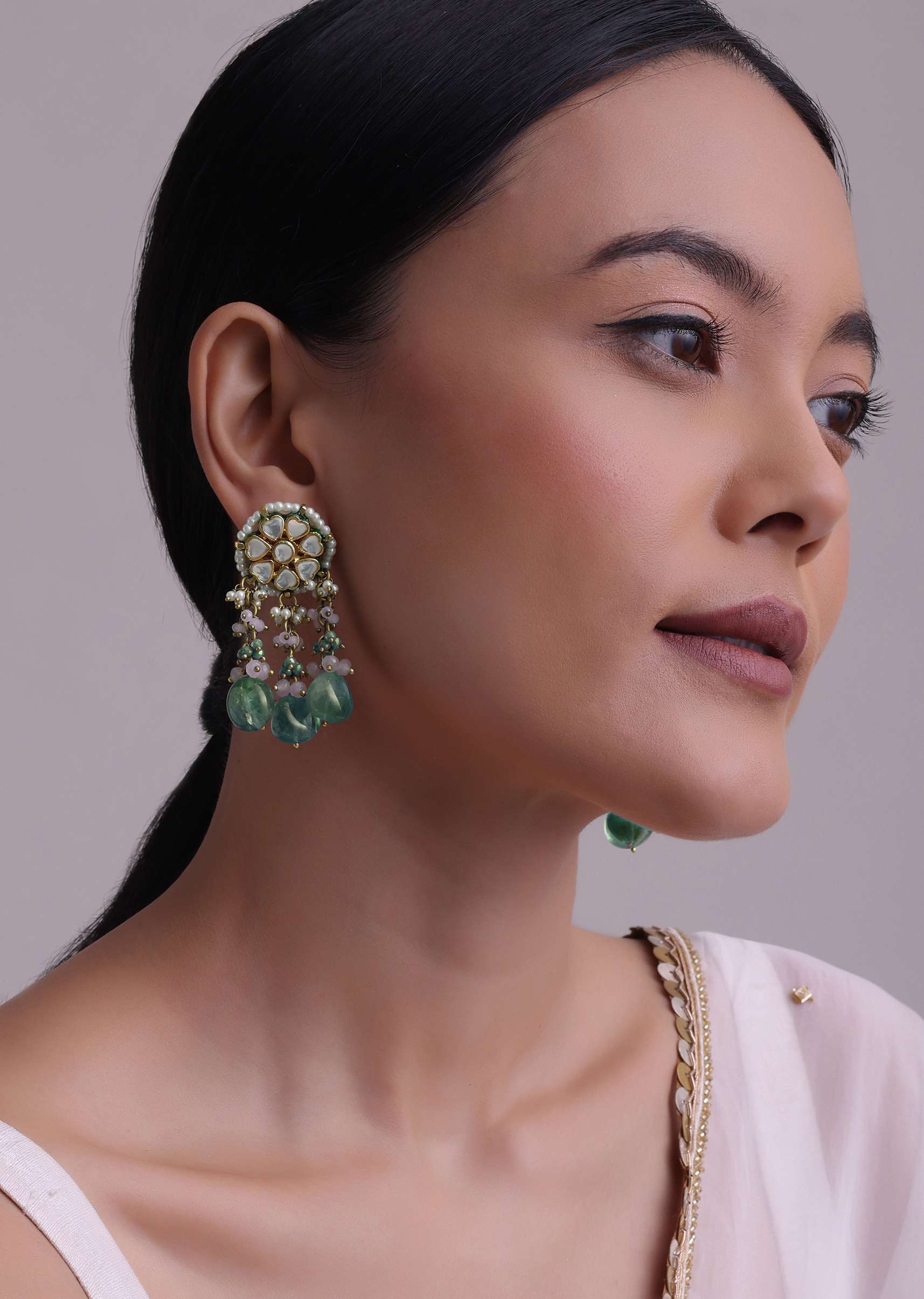 A simple, solid-colored dress or saree in a complementary color will make the earrings stand out.