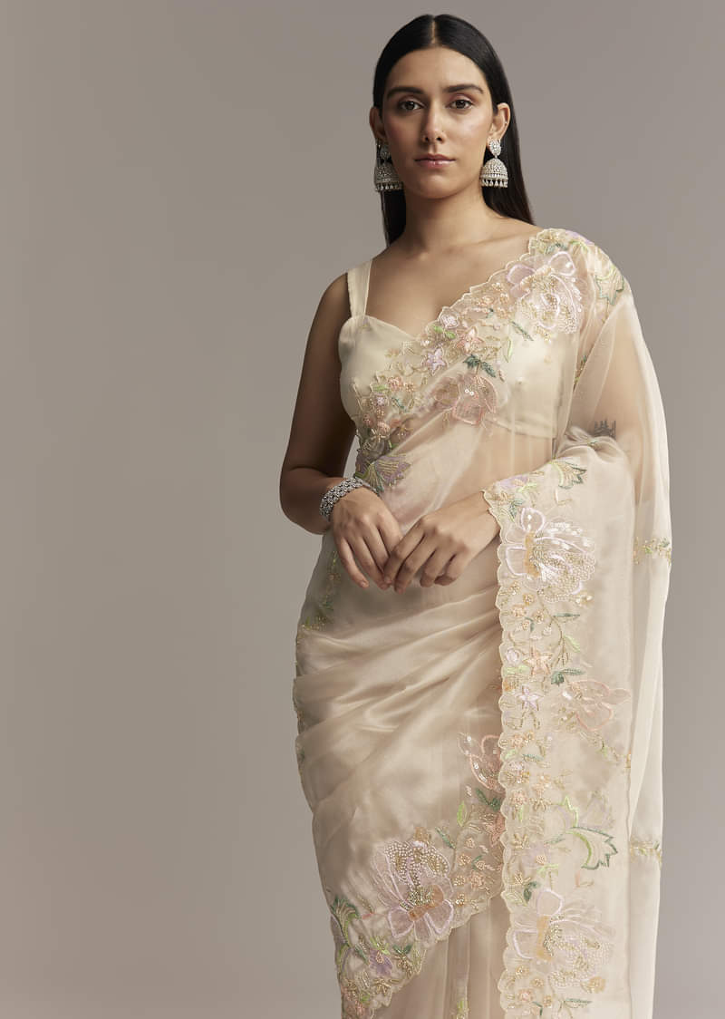 Water Gold Tissue Saree With Multicolor Floral Cutwork Embroidery